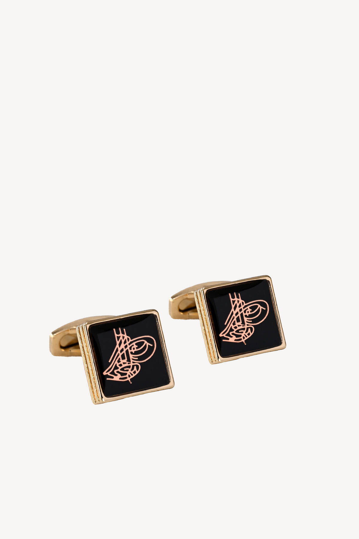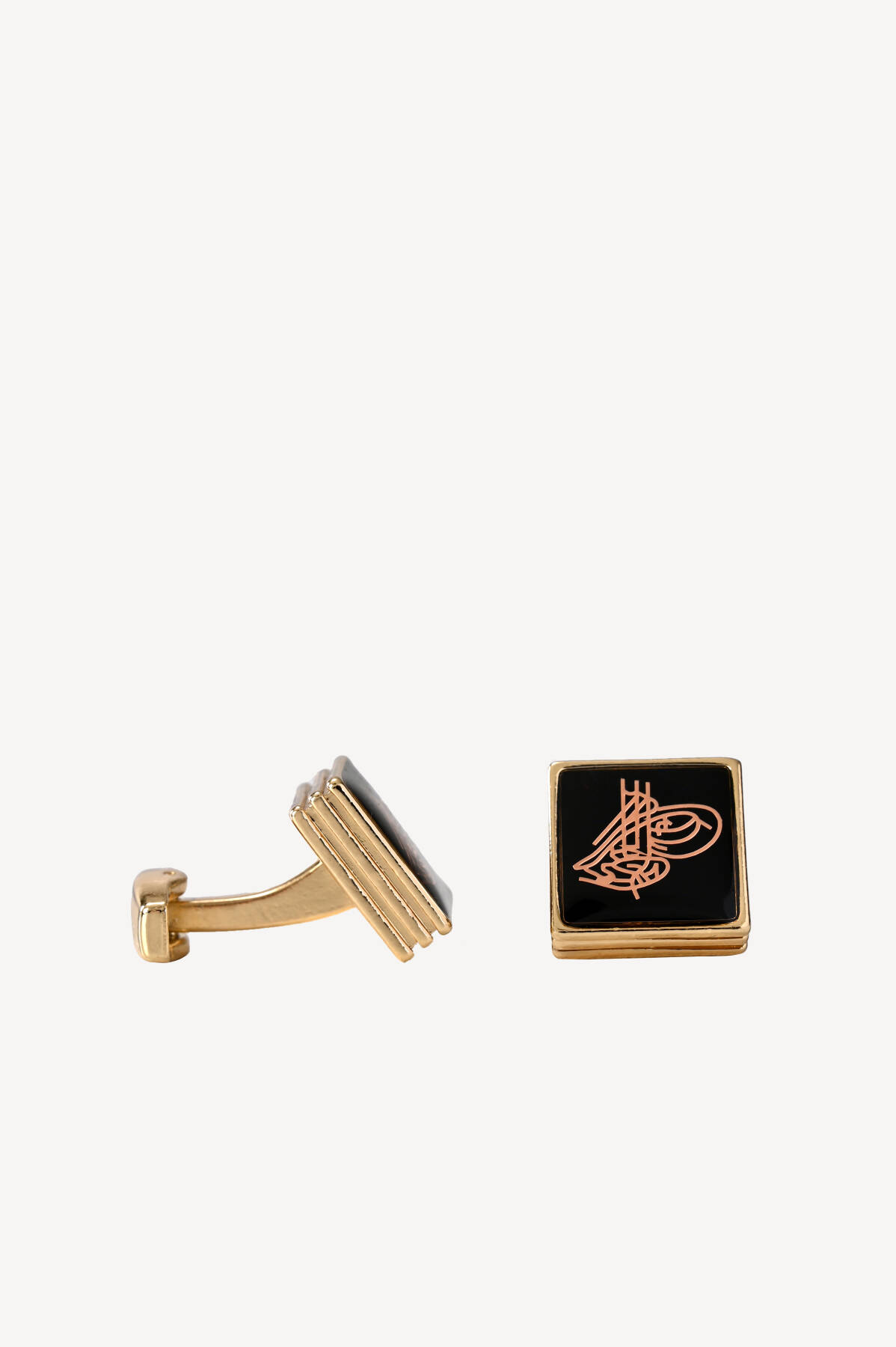 Erkek Siyah Sarı Kaplama Tuğra Desenli Kol Düğmesi