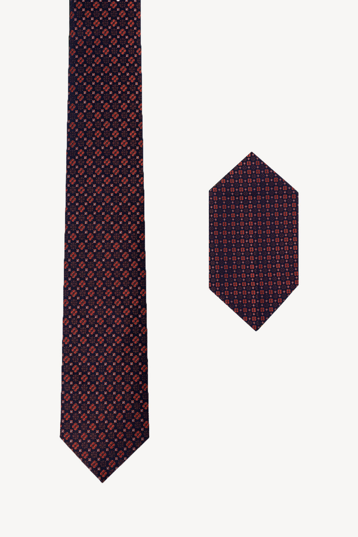 Erkek Lacivert Bakır Çiçek Desenli Kravat Mendil Set
