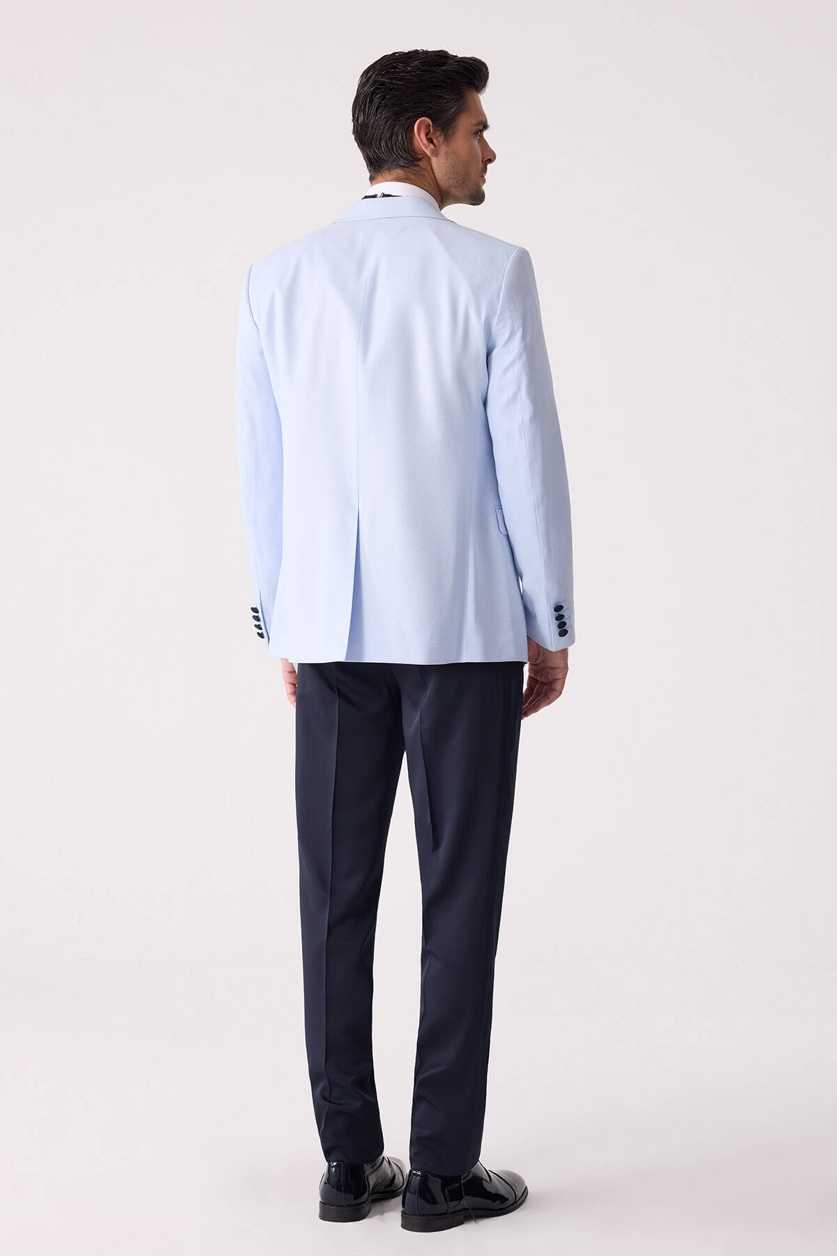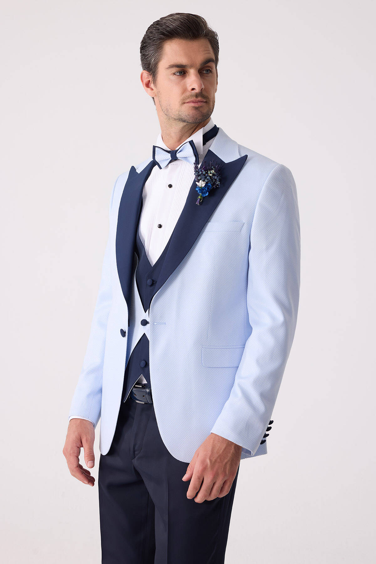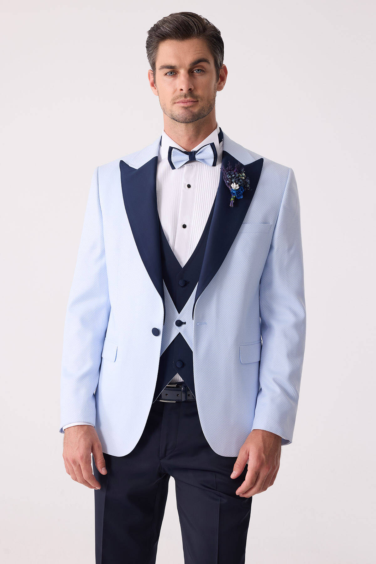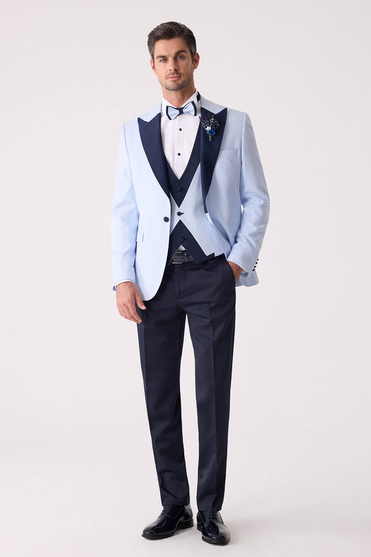 Gelince Haber VerYSF Giyim damatlık koleksiyonunun en beğenilen parçalarından biri olan Erkek Açık Mavi Yelekli Kırlangıç Yaka Slim Fit Damatlık, incelikli bir tarz sunar. Ceket, yelek ve pantolon olmak üzere üç parçalı olarak tasarlanan smokin, sofistike ve romantik açık mavi düz rengiyle yaz ve bahar düğünleri için mükemmel bir seçimdir. Takımın kırlangıç yaka detayları silüeti keskin bir şıklıkla vurgular. Ceketin tek yırtmaç gibi hassas terzilik becerileri gerektiren detayları ihtiyacınız olan klasik giyim tarzını güçlü bir şekilde sunar. Damatlığın slim fit formu ise ikinci bir cilt gibi saran kalıbı sayesinde ısmarlama takım elbise hissi verir.