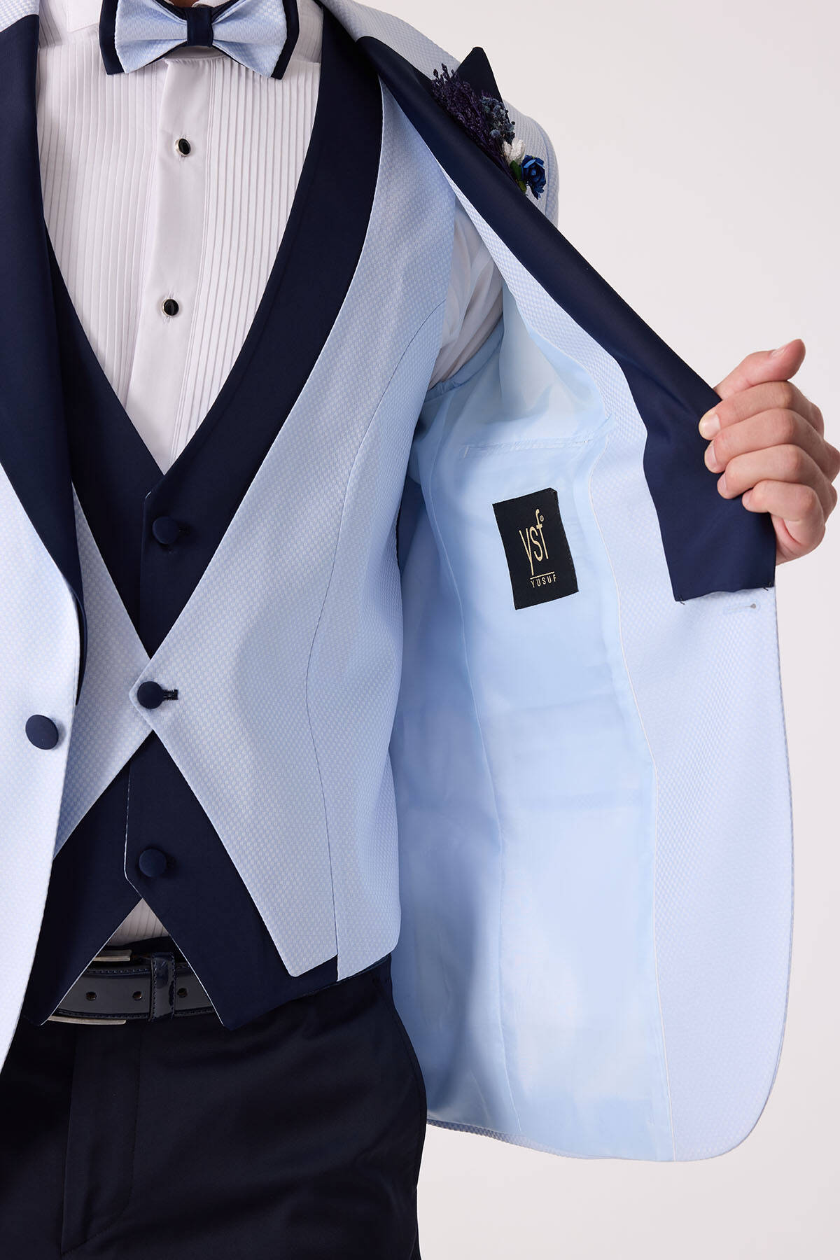 İlkbahar ve yaz düğünleri için seçkin bir tarz sunan açık mavi yelekli damatlık, düğün törenleri, balo ve seremoniler için ihtiyacınız olan klas görünüme kavuşmanızı sağlar. Karizmatik ve ilham verici bir silüet için açık mavi smokini; beyaz slim fit gömlek, aynı tonda papyon, klasik kemer ve Oxford ayakkabı modelleri ile tamamlayabilirsiniz. Şıklığın dozunu yükseltmek istediğinizde kol düğmesi, yaka çiçeği ve zincir gibi sofistike aksesuarlardan destek alabilirsiniz. YSF Giyim, tüm resmî etkinliklerde davetlilerin takdirini ve beğenisini kazanabileceğiniz damatlık modellerini sunar. Siz de seçkin damatlık modelleri ile ilham verici görünümlere imza atmak için en özel fiyat ayrıcalıkları ile alışverişe başlayabilirsiniz!