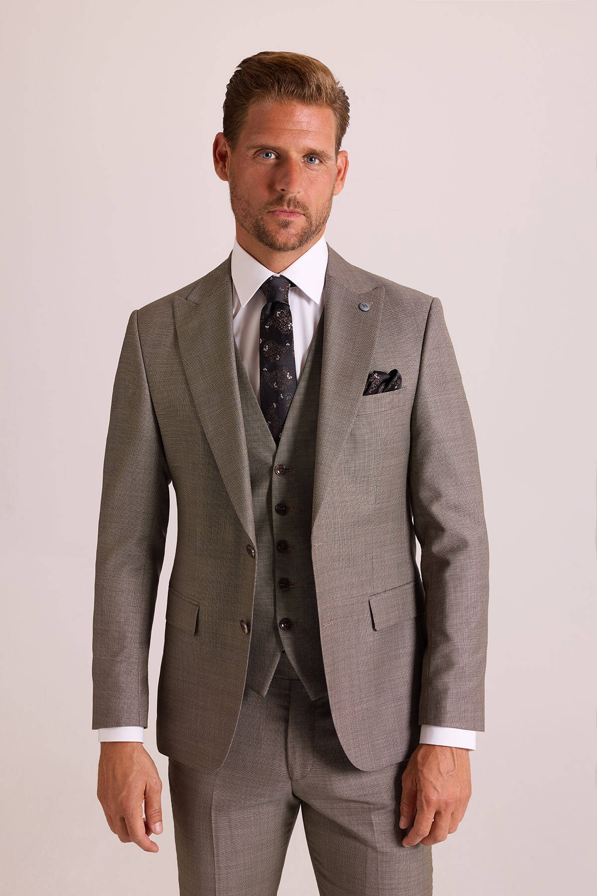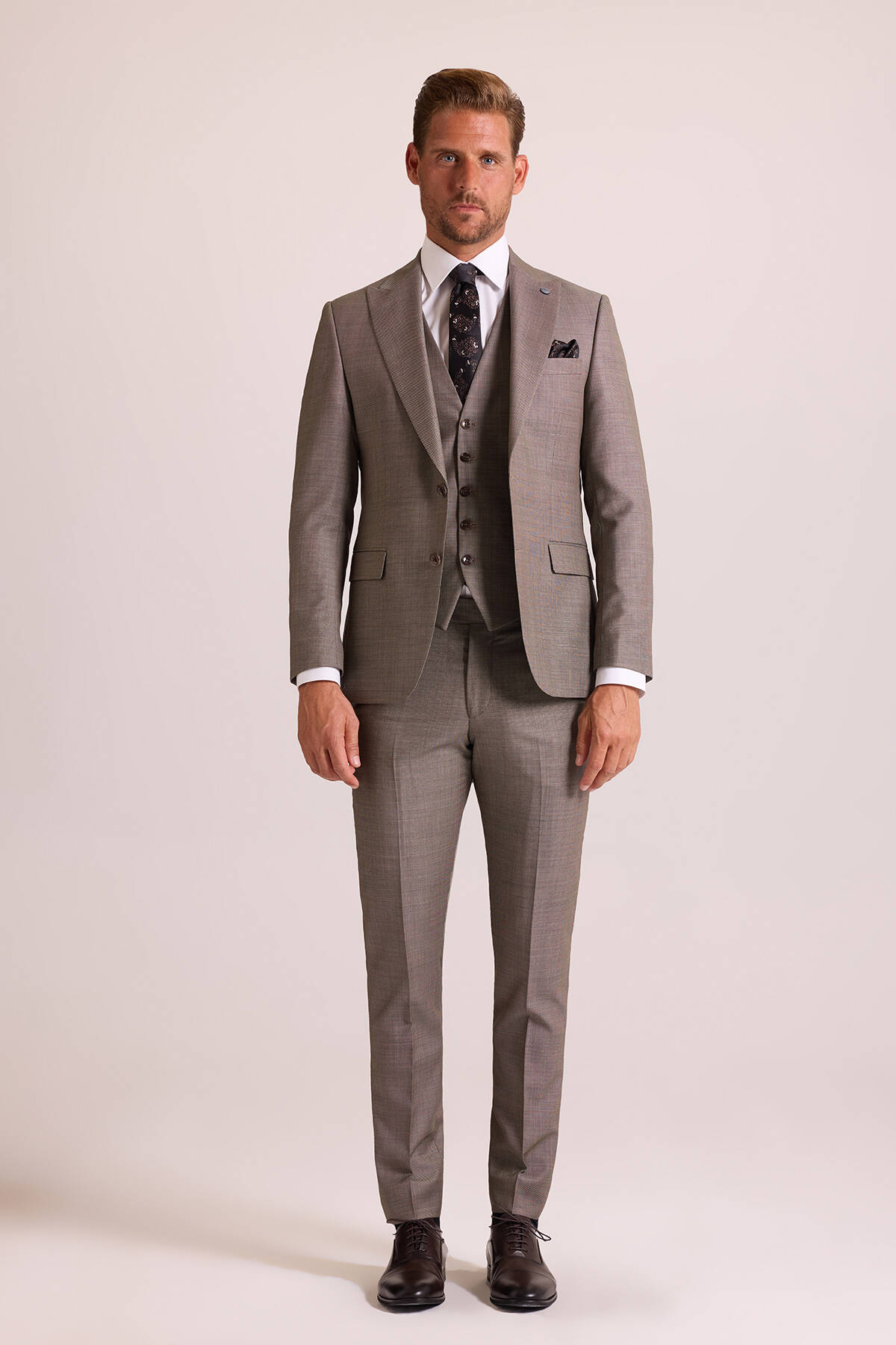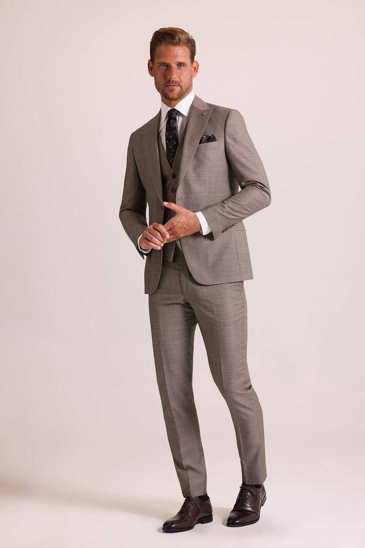 Erkek Bej Slim Fit Sivri Yaka Yelekli Takım Elbise