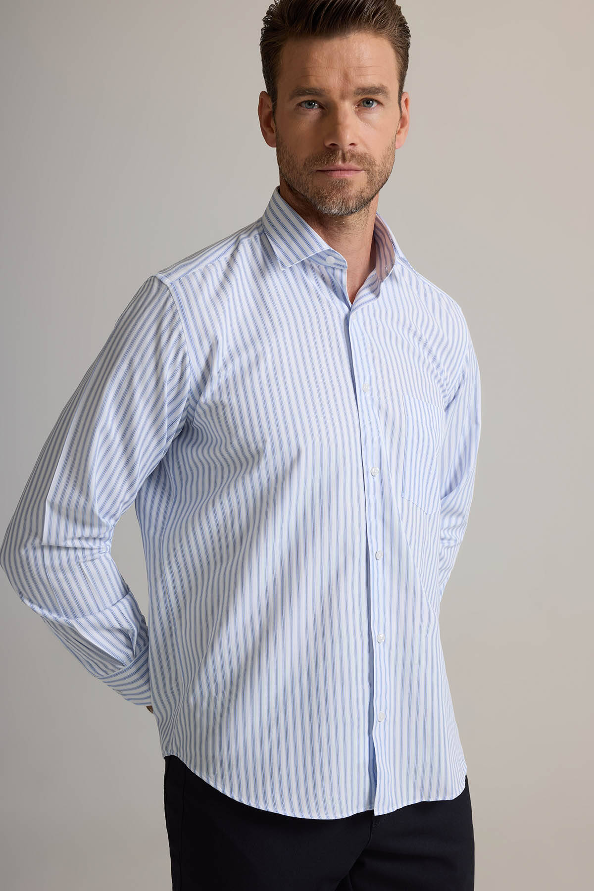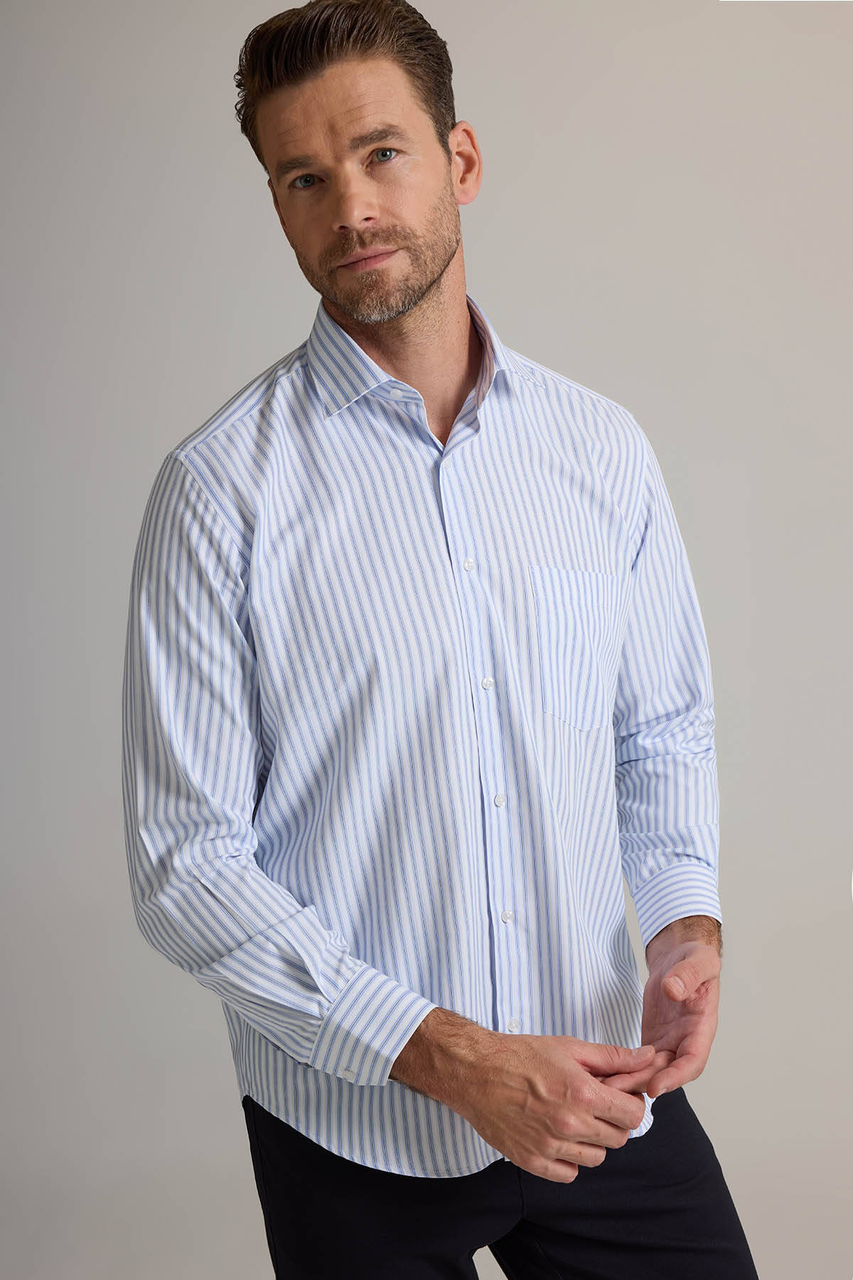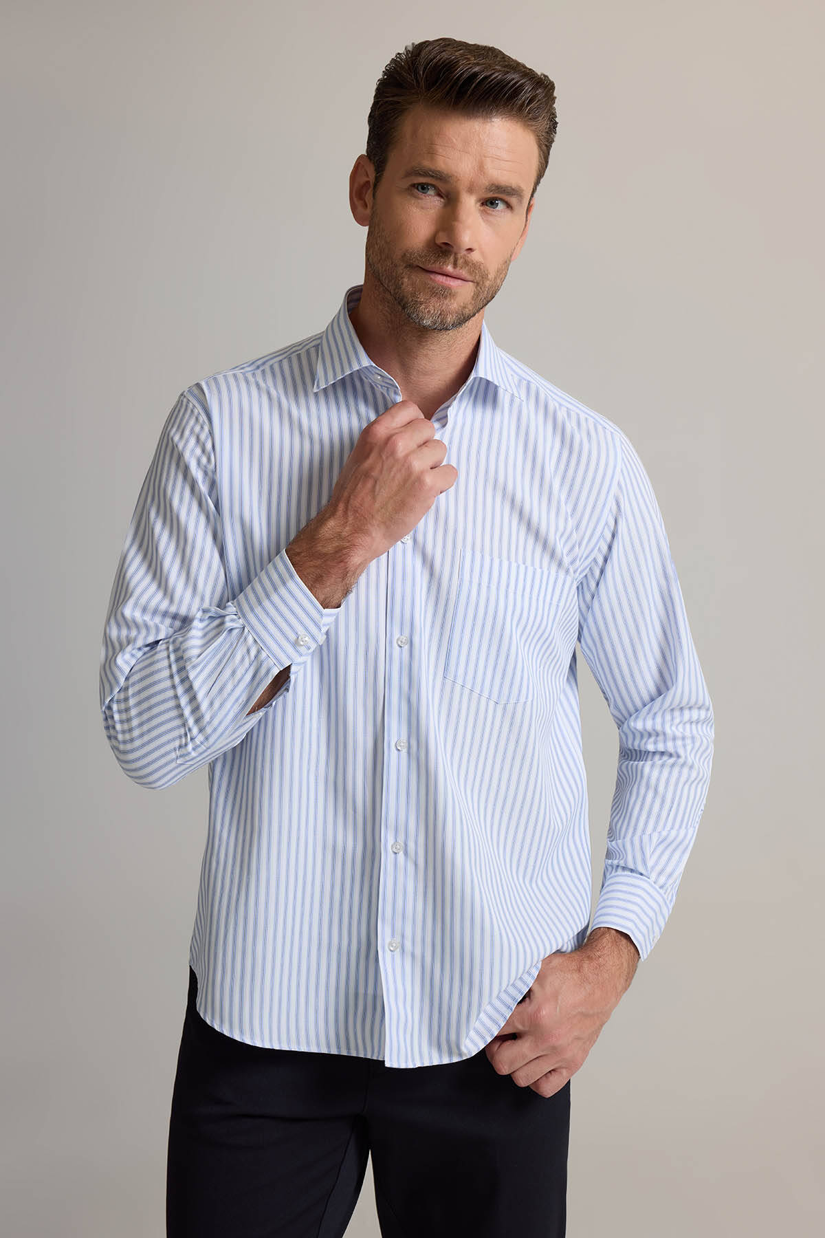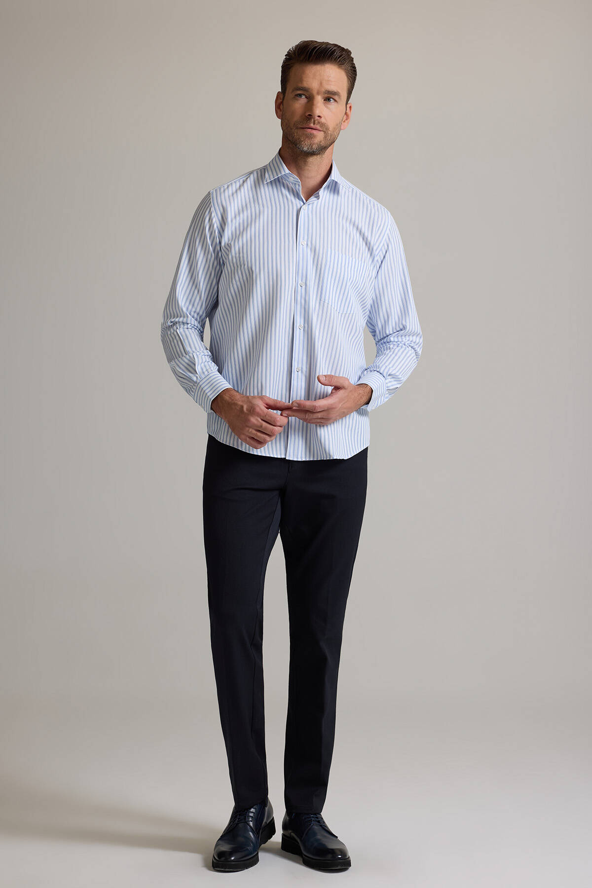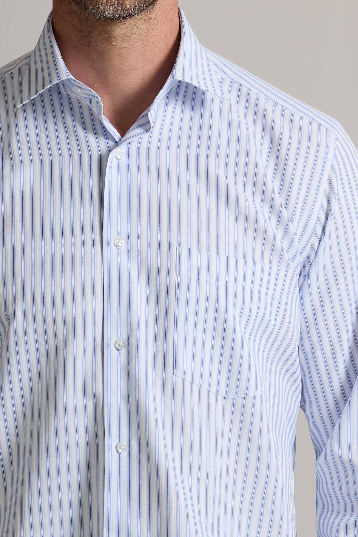 Erkek Beyaz Mavi Regular Fit Çizgili Pamuklu Gömlek