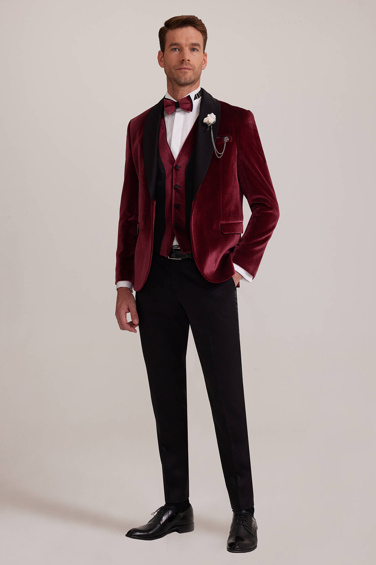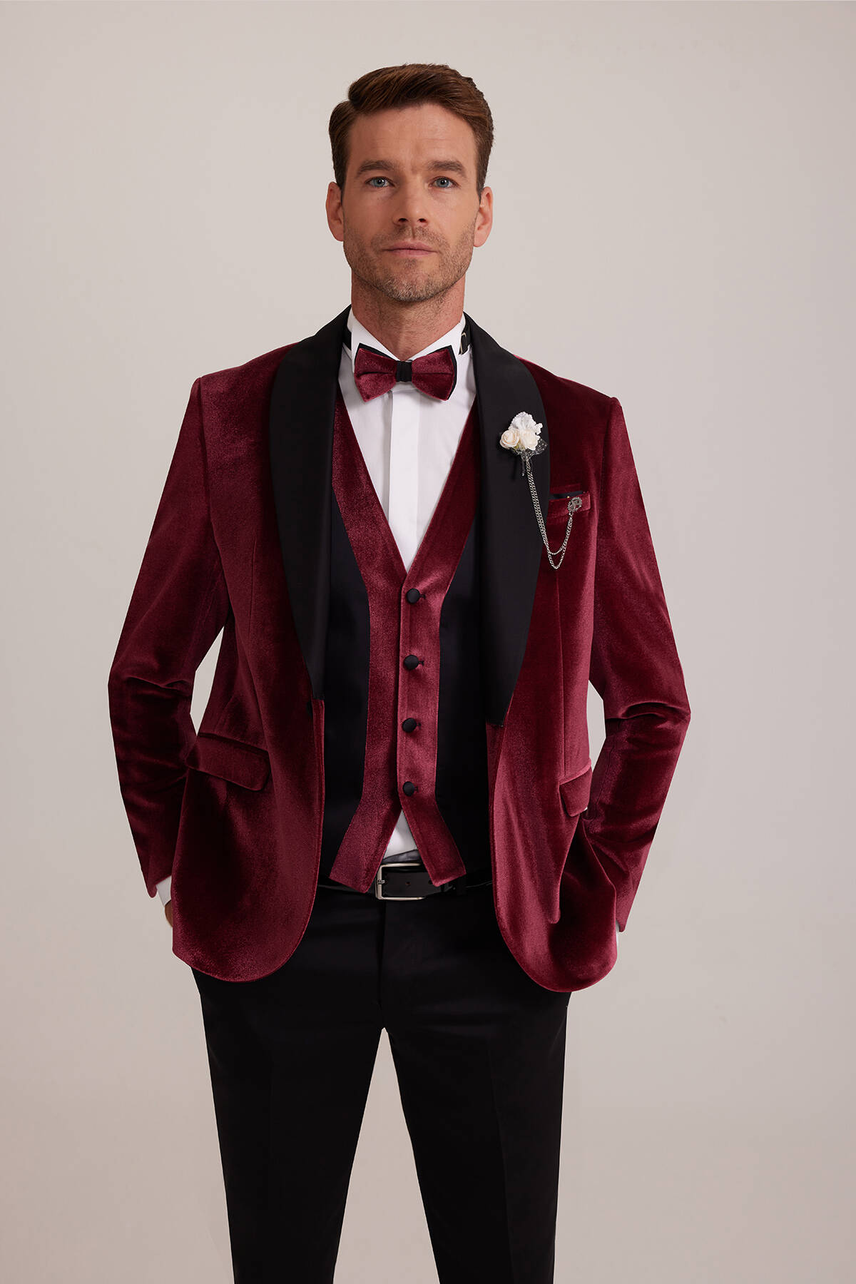 Düz bordo renkteki damatlık, kontrast oluşturan detayları sayesinde çekici ve iddialı bir silüeti ortaya çıkarır. Görkemli kış salon düğünleri için benzersiz bir seçim olan yelekli damatlığı; beyaz Ata Yaka Gömlek gibi smokin şıklığını zirveye taşıyan rafine parçalarla tamamlayabilirsiniz. Ekstra çekici bir tarz yaratmak istiyorsanız rugan klasik ayakkabı, yaka çiçeği ve zincir ile romantizm dozunu yükseltebilirsiniz. YSF Giyim, ustalıkla tasarlanan lüks ve kaliteli damatlık modelleri ile hayatınızın en mutlu anlarına ilham verici bir tarz katar. Siz de düğün gününüzde karizmatik ve çarpıcı bir silüete imza atabilmek için YSF Giyim’in online alışveriş deneyimlerine özel fırsatları ve ayrıcalıklı fiyatları ile alışverişe başlayabilirsiniz!