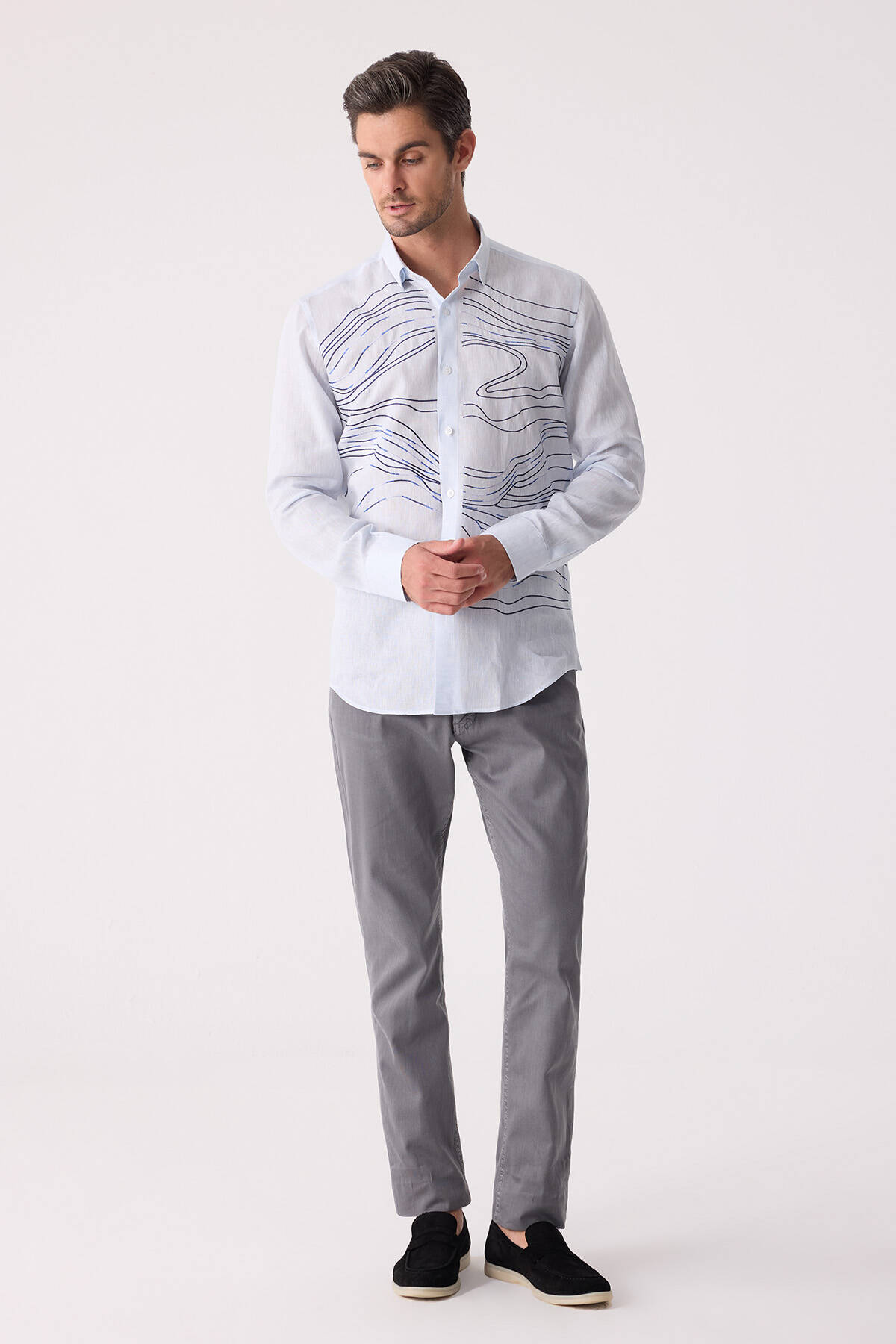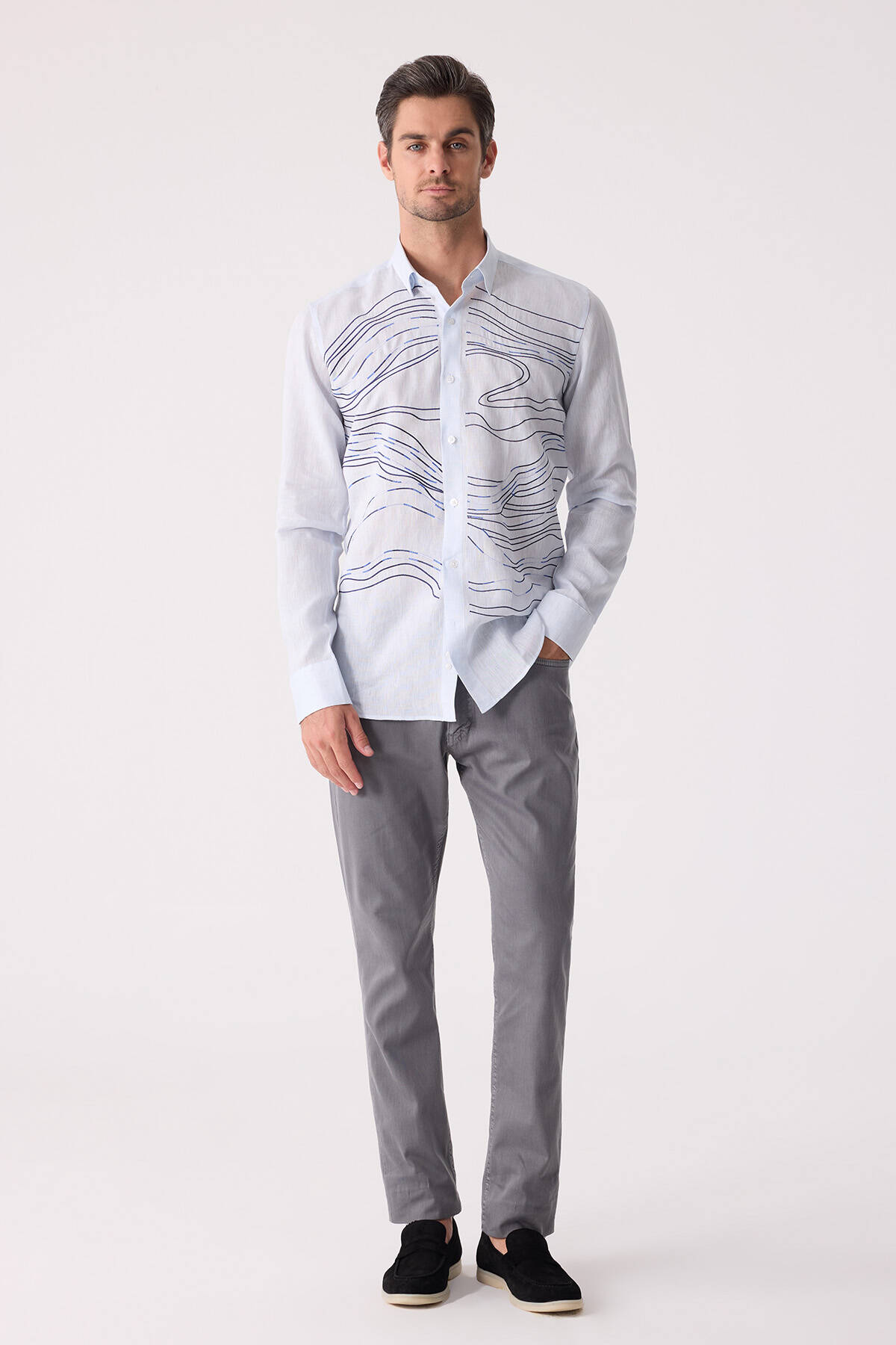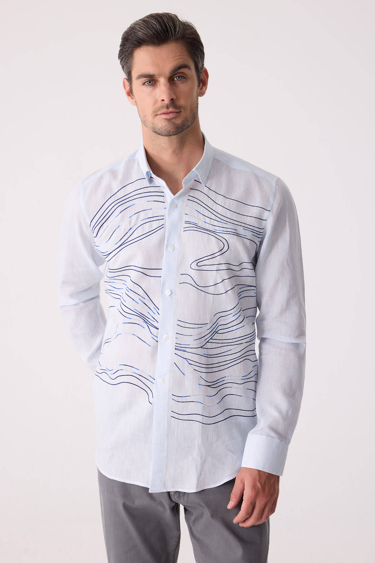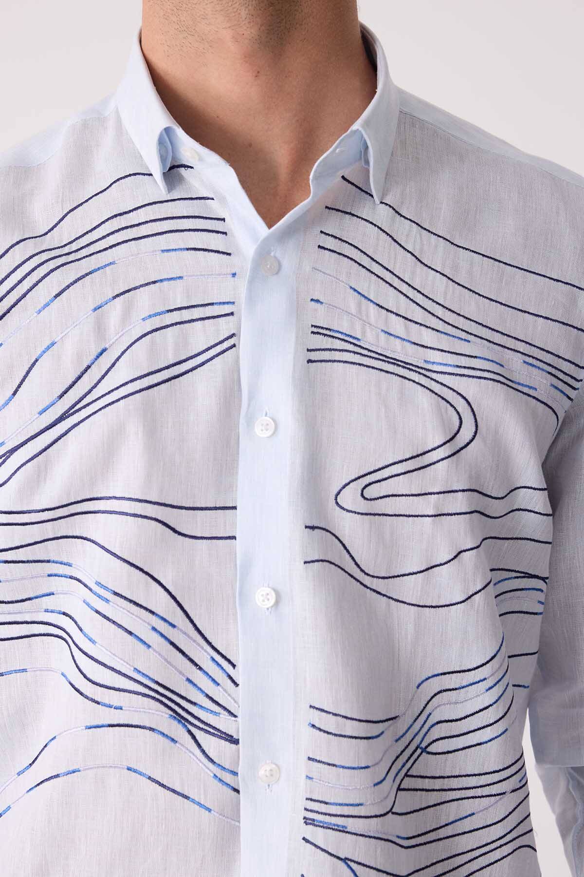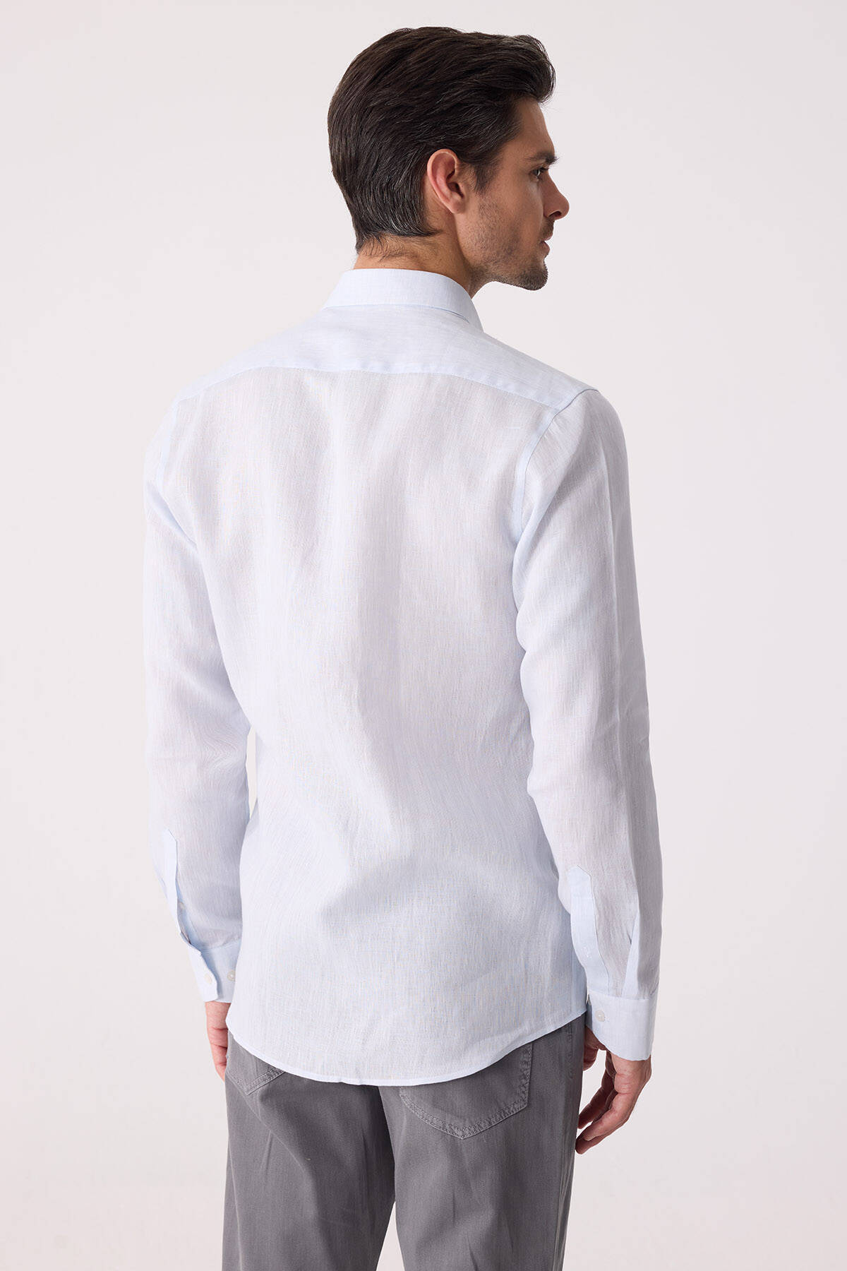Erkek Buz Mavisi Gizli Yaka Düğmeli Keten Slim Fit Gömlek
