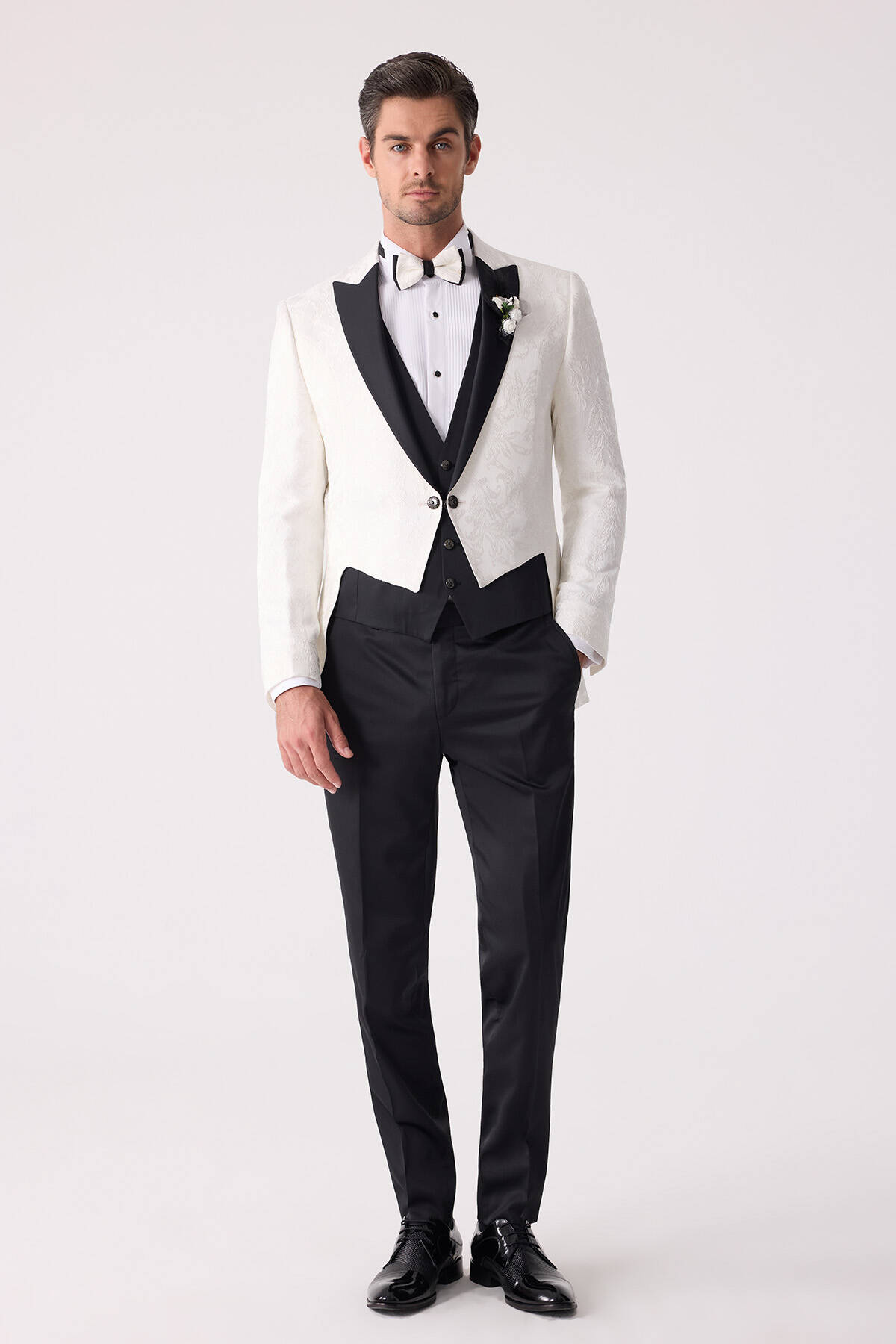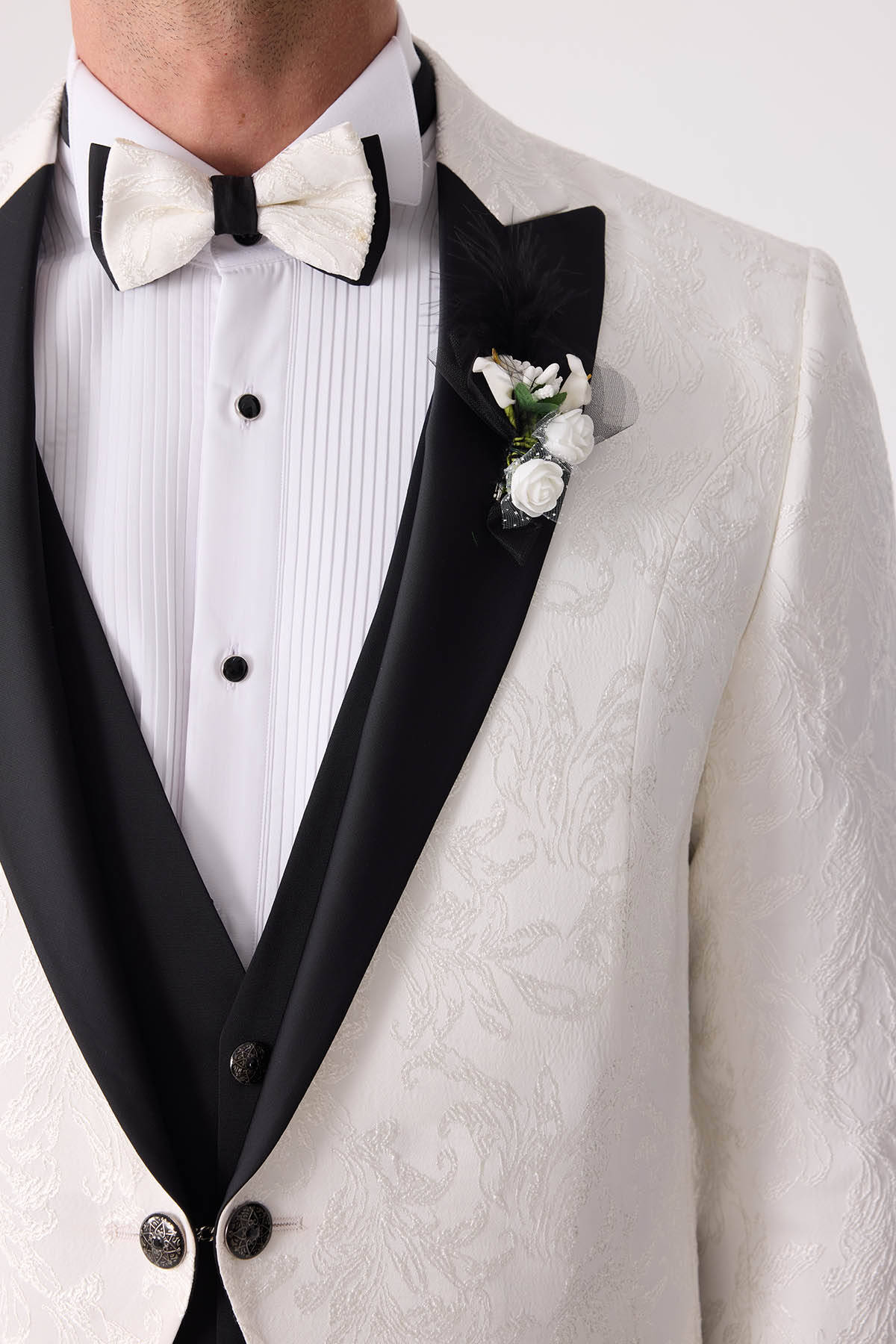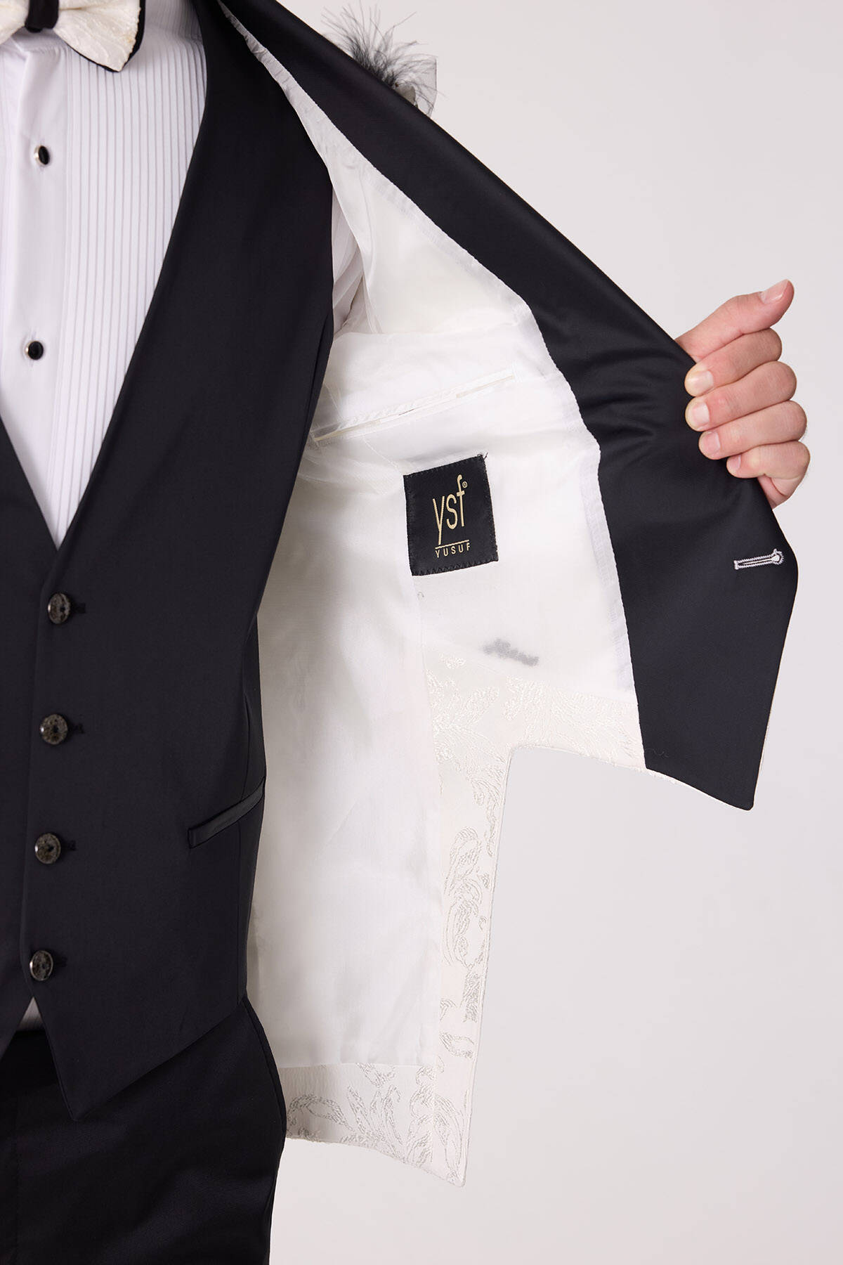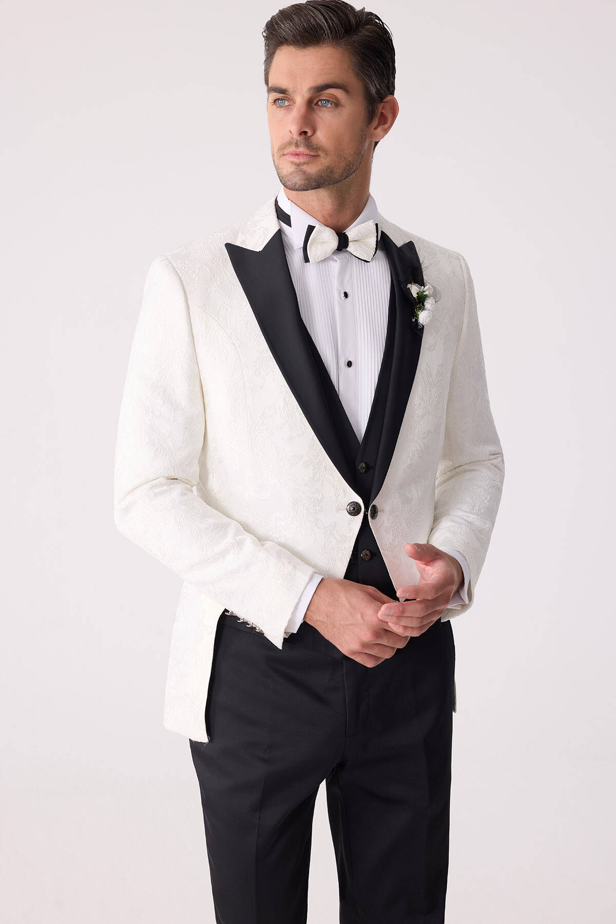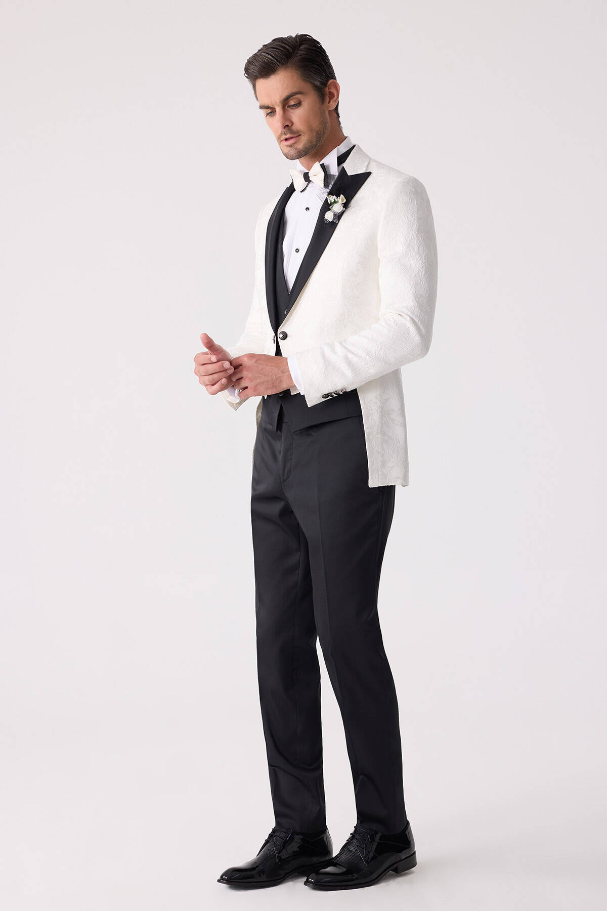 Ceketin kendinden desenli incelikli ayrıntıları, ekru tonlarına göz alıcı bir şıklık katmak için özenle seçilmiştir. Keskin kesimleri ve kaliteli kumaşıyla öne çıkan bu damatlık, en görkemli davetlere yakışan bir stil sunar. Smokinin her mevsime uygun karizmatik stilini parlatmak için slim fit gömlek, Oxford ayakkabı, beyaz yaka çiçeği ve zincir gibi sofistike parçalar seçebilirsiniz. Damatlık stilini güçlendirmek için rugan kemer ve siyah kol düğmesi gibi klas aksesuarlardan da destek alabilirsiniz. YSF Giyim, kendi düğün tarzınızı en seçkin bir şekilde oluşturmanızı sağlayan lüks damatlık modellerini online özel ayrıcalıklı fiyatlarla özel imkânlarla sunar. Siz de yıllarca unutulmayacak karizmatik davet stili için en şık damatlıkları hemen satın alabilirsiniz!