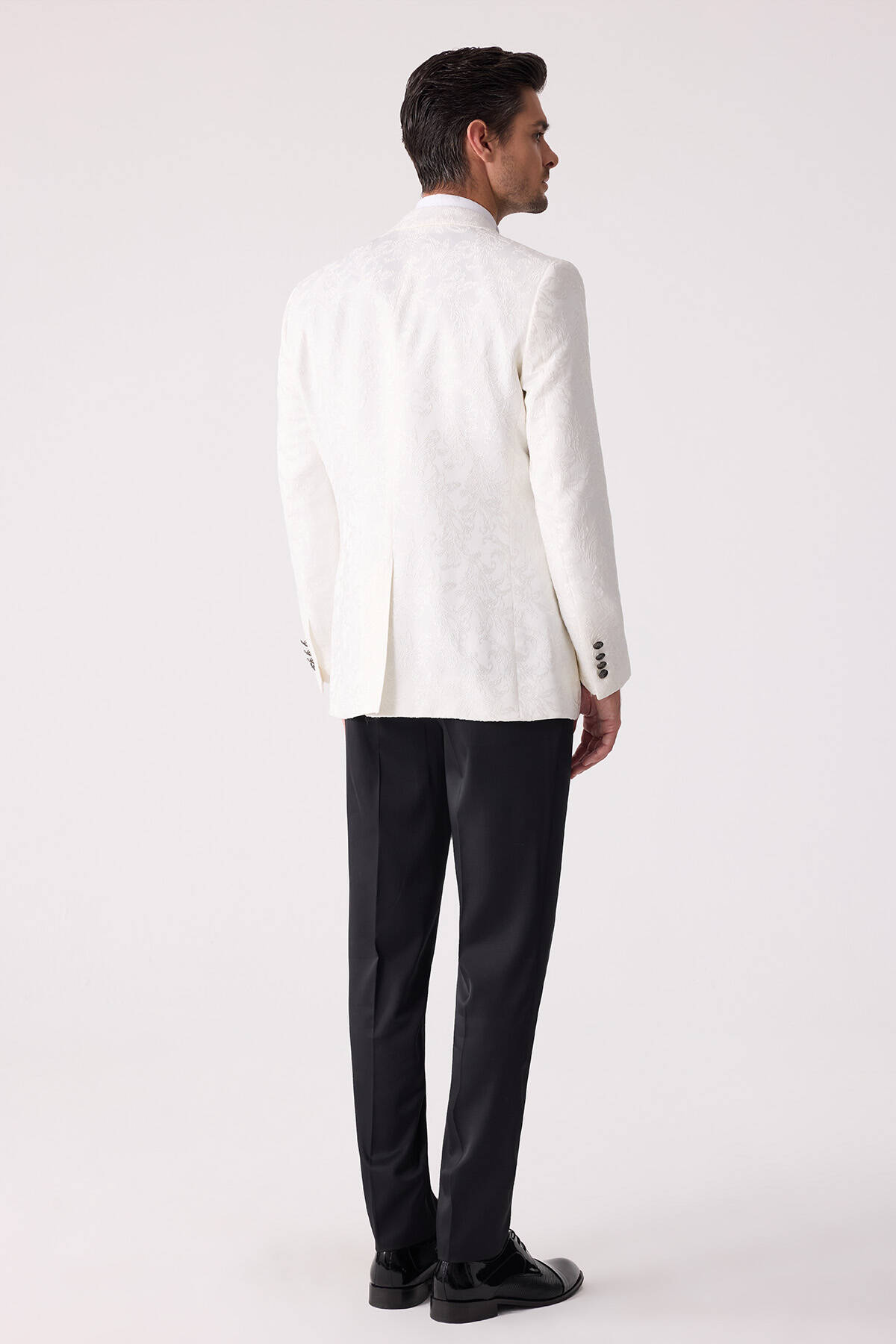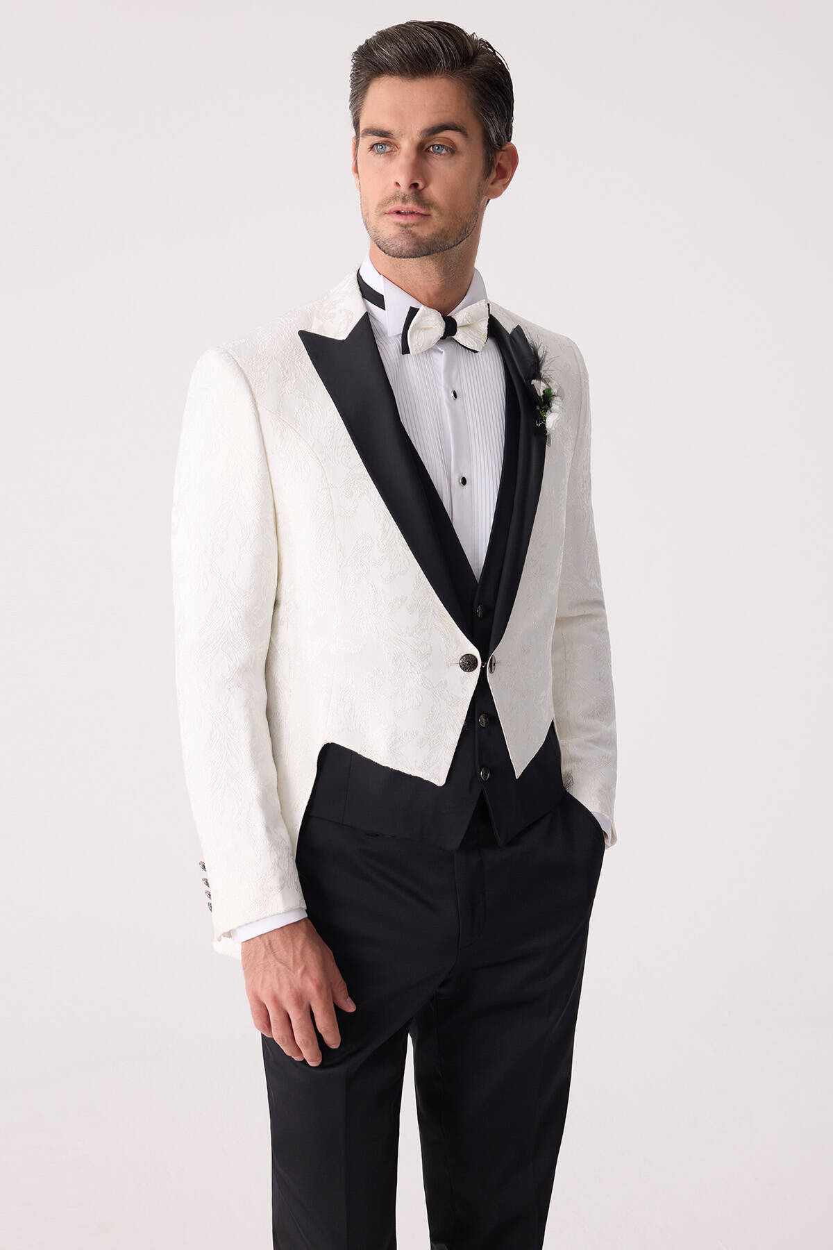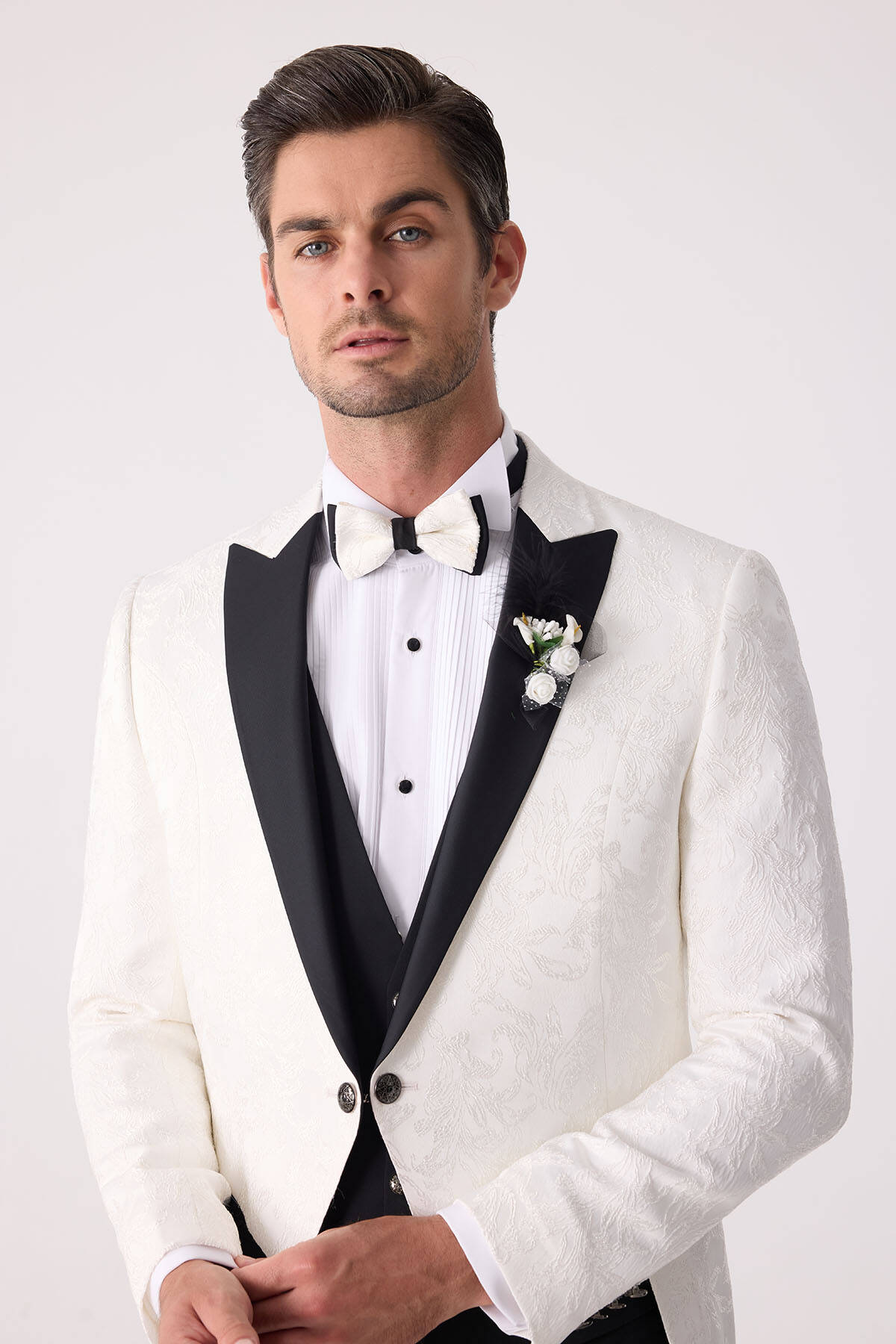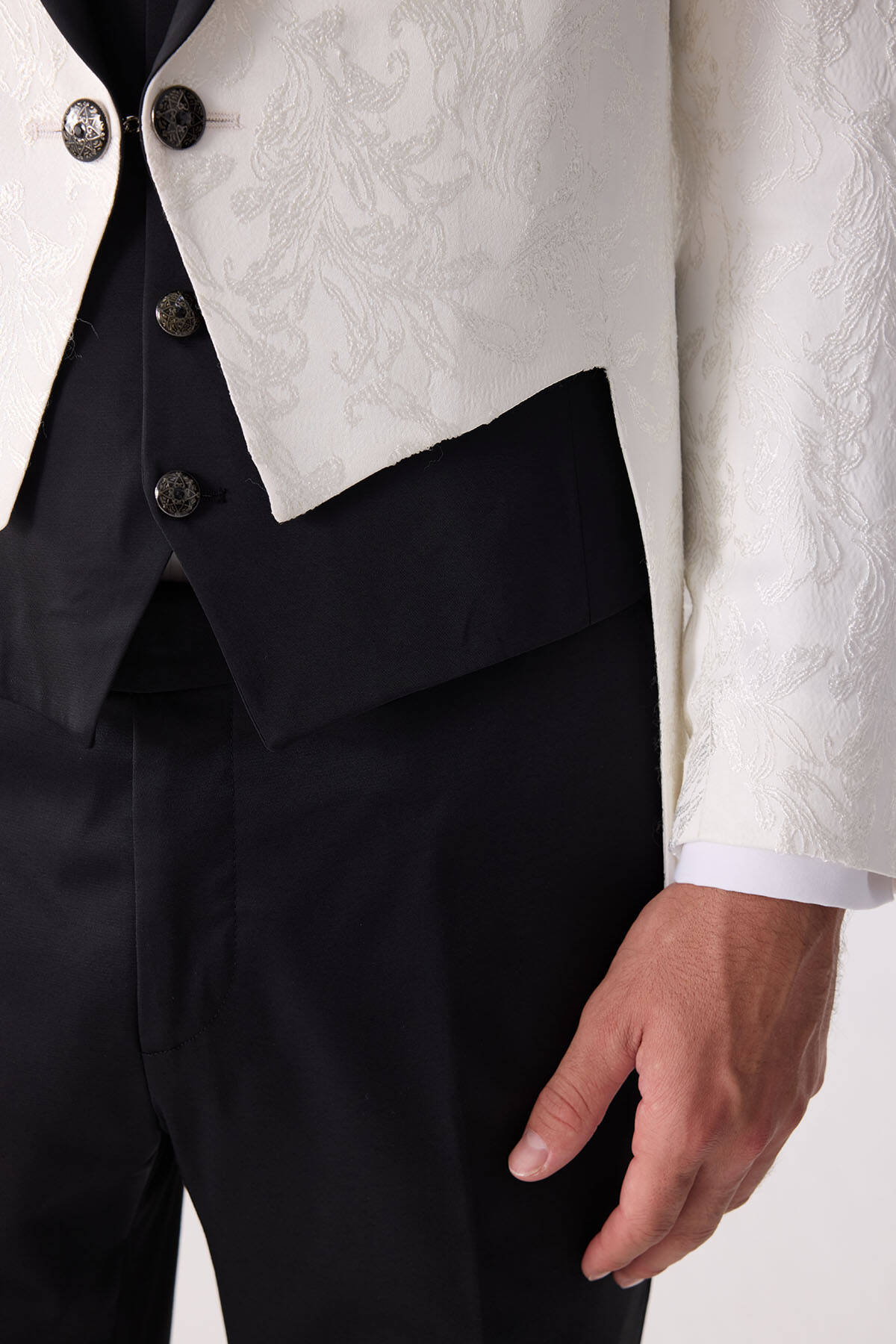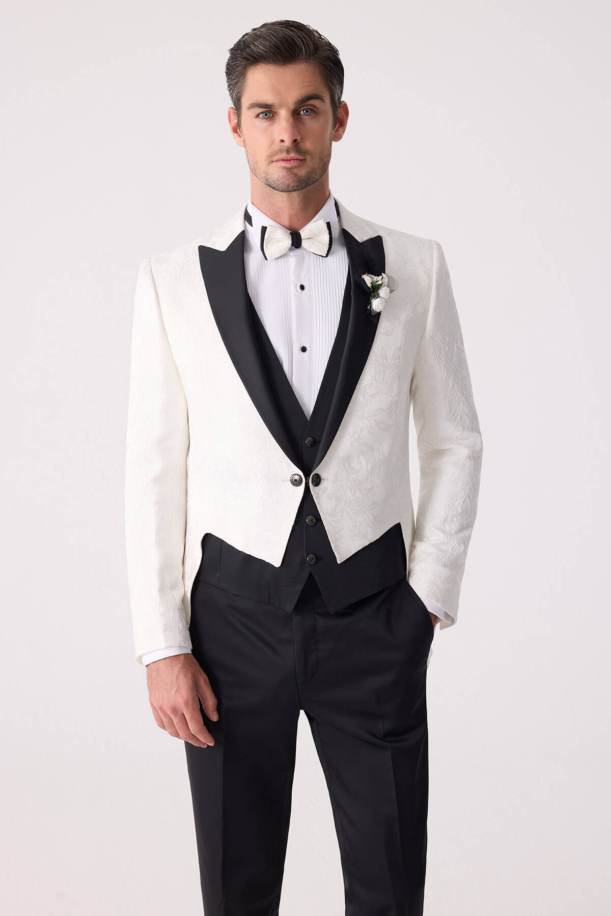 Ceketin kendinden desenli incelikli ayrıntıları, ekru tonlarına göz alıcı bir şıklık katmak için özenle seçilmiştir. Keskin kesimleri ve kaliteli kumaşıyla öne çıkan bu damatlık, en görkemli davetlere yakışan bir stil sunar. Smokinin her mevsime uygun karizmatik stilini parlatmak için slim fit gömlek, Oxford ayakkabı, beyaz yaka çiçeği ve zincir gibi sofistike parçalar seçebilirsiniz. Damatlık stilini güçlendirmek için rugan kemer ve siyah kol düğmesi gibi klas aksesuarlardan da destek alabilirsiniz. YSF Giyim, kendi düğün tarzınızı en seçkin bir şekilde oluşturmanızı sağlayan lüks damatlık modellerini online özel ayrıcalıklı fiyatlarla özel imkânlarla sunar. Siz de yıllarca unutulmayacak karizmatik davet stili için en şık damatlıkları hemen satın alabilirsiniz!