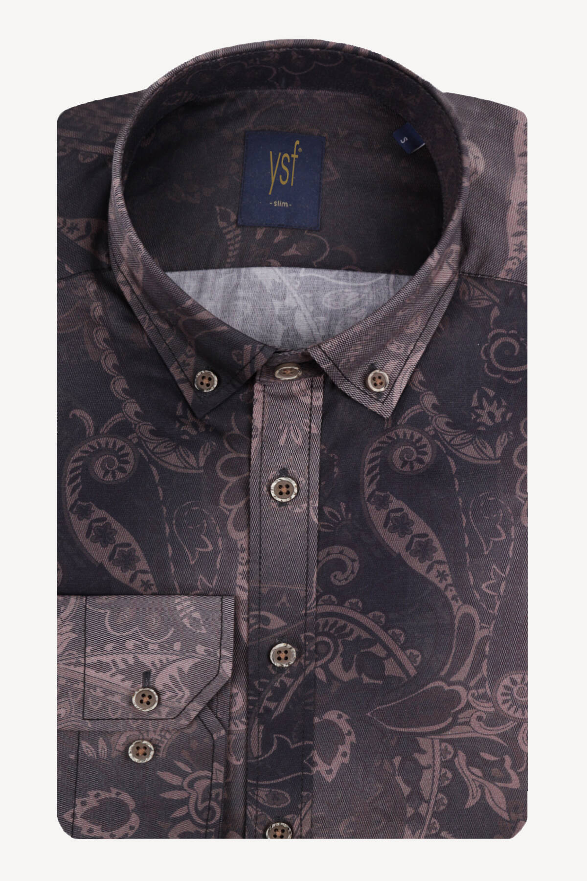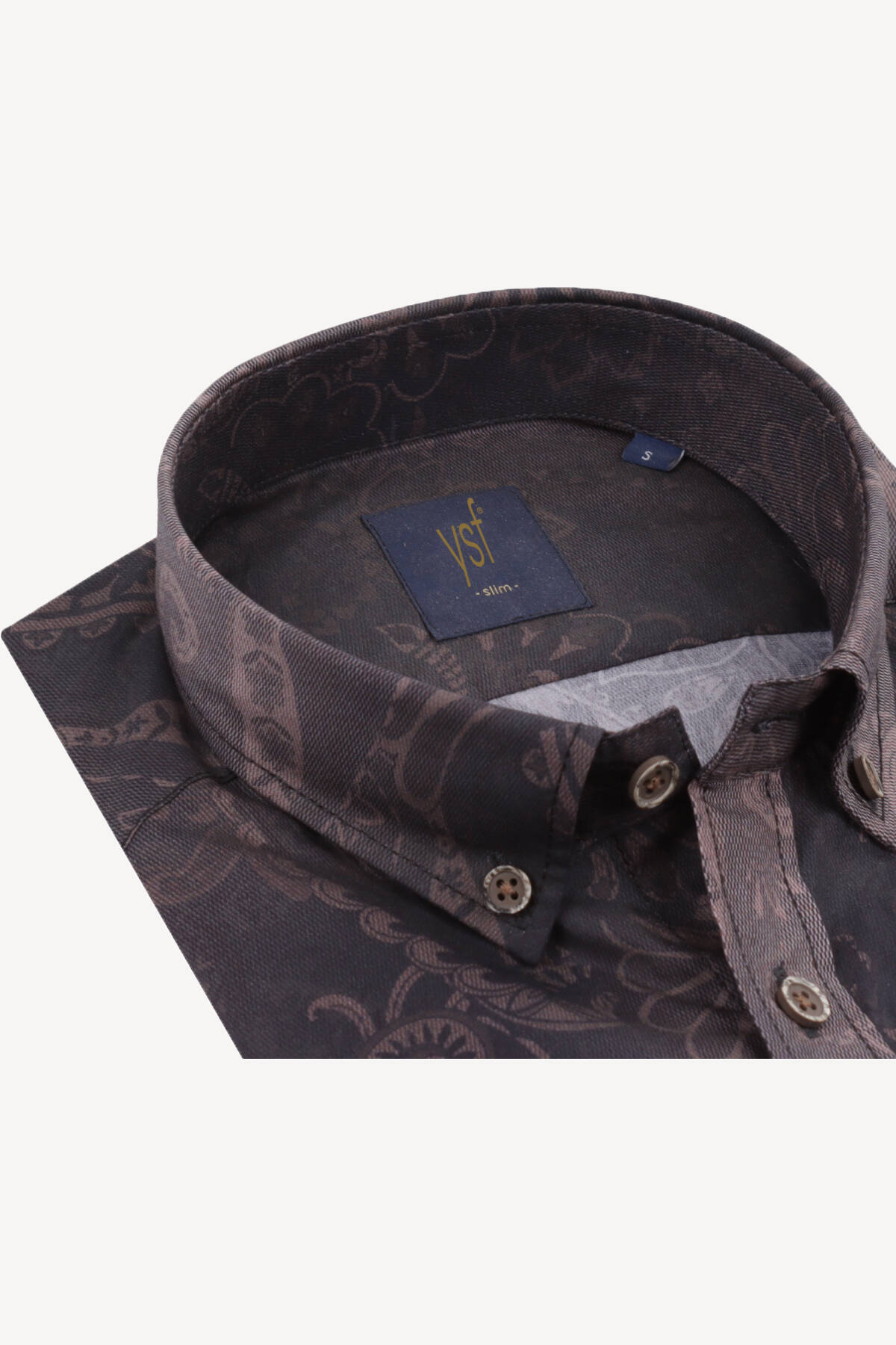 Erkek Eskitme Kahve Desenli Yarım İtalyan Slim Fit Gömlek