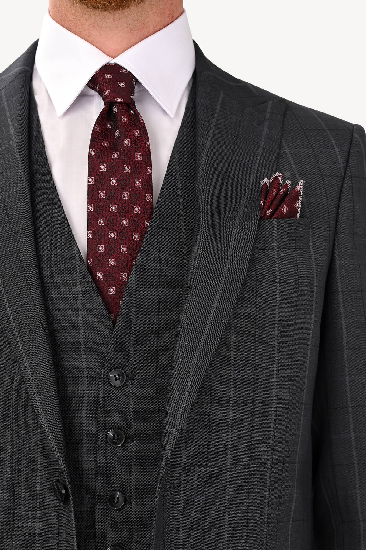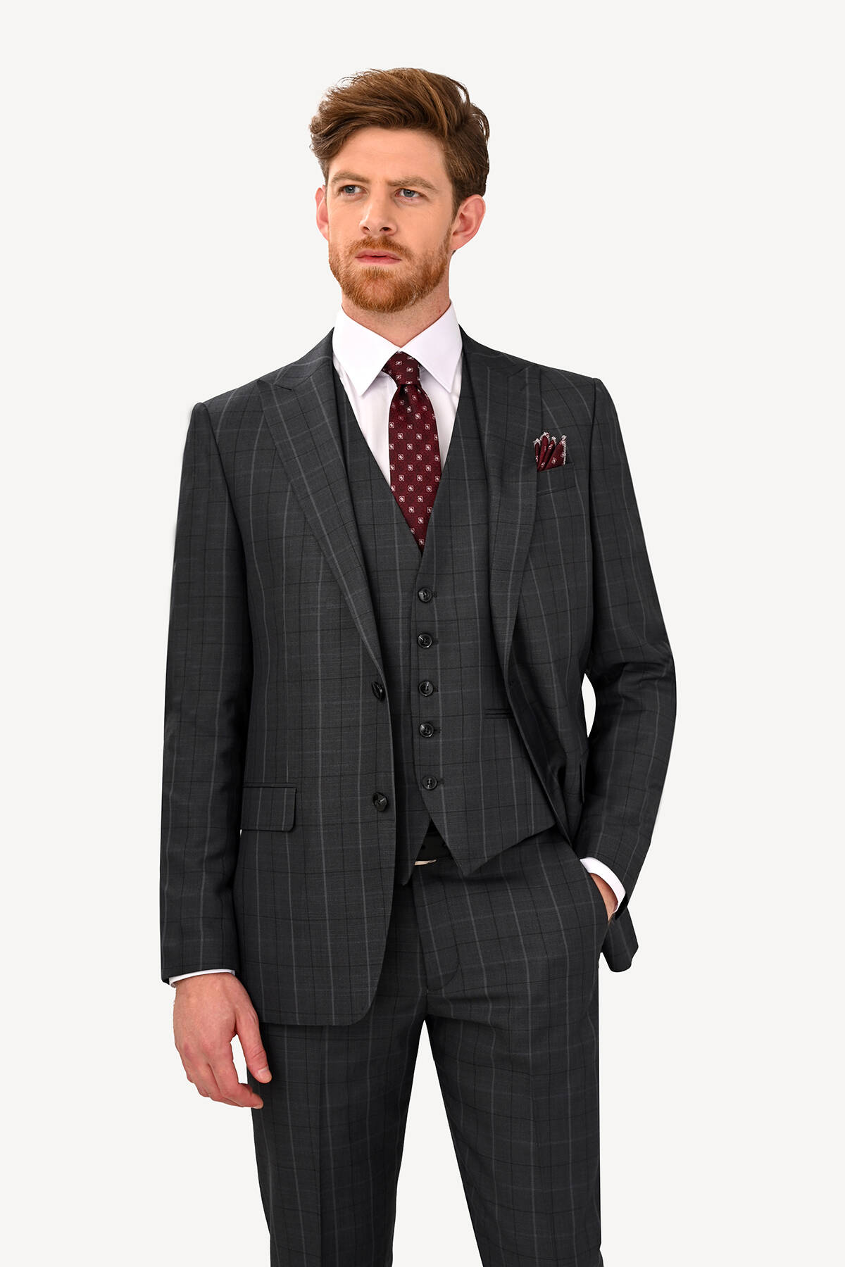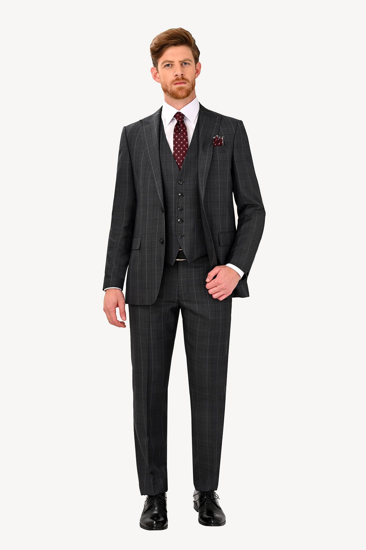 Erkek Füme Regular Fit Sivri Yaka Yelekli Takım Elbise