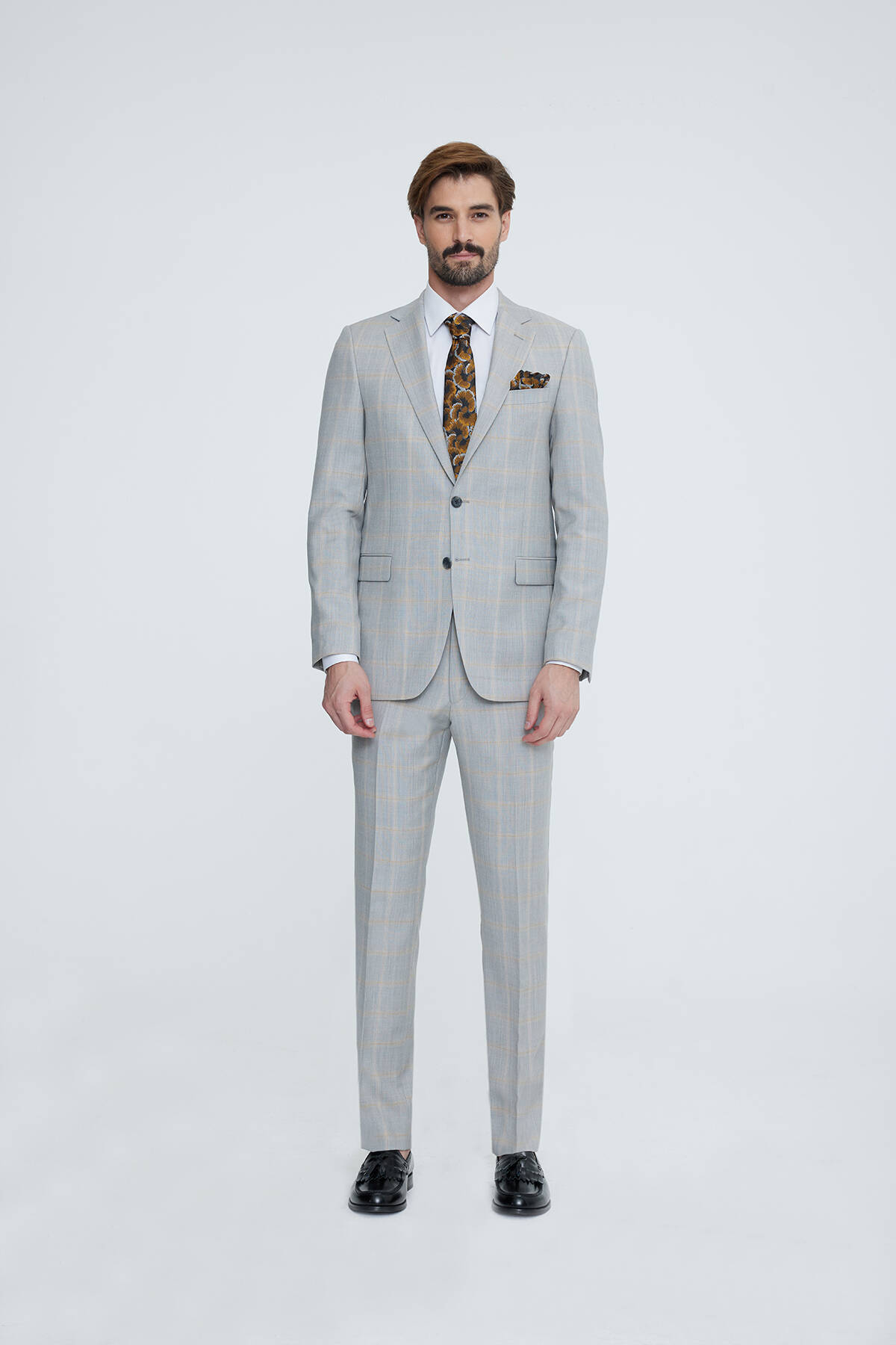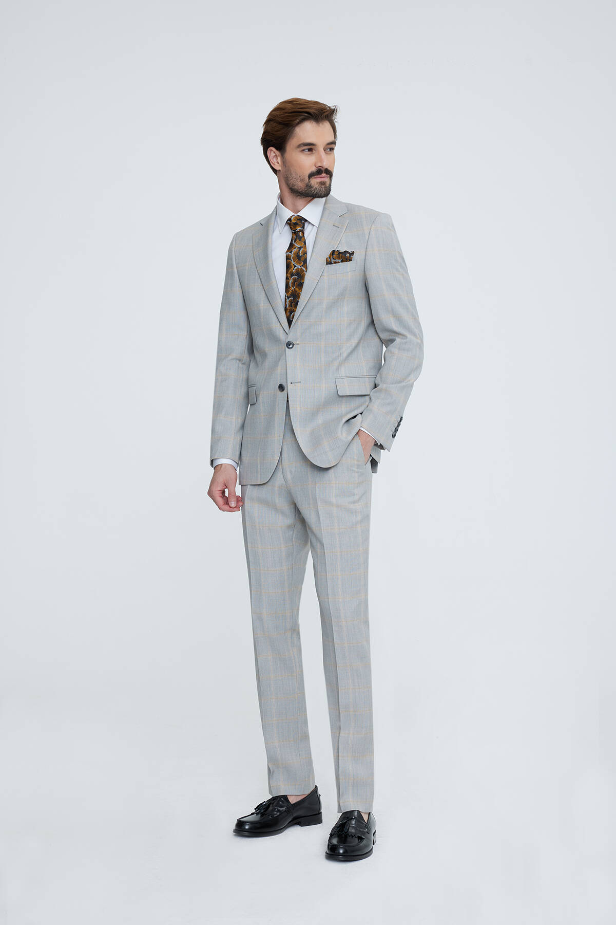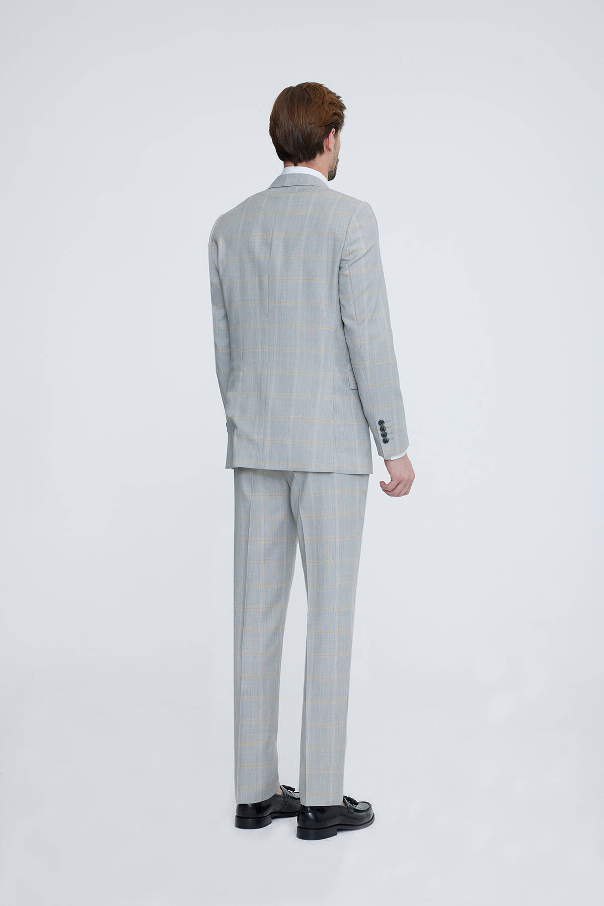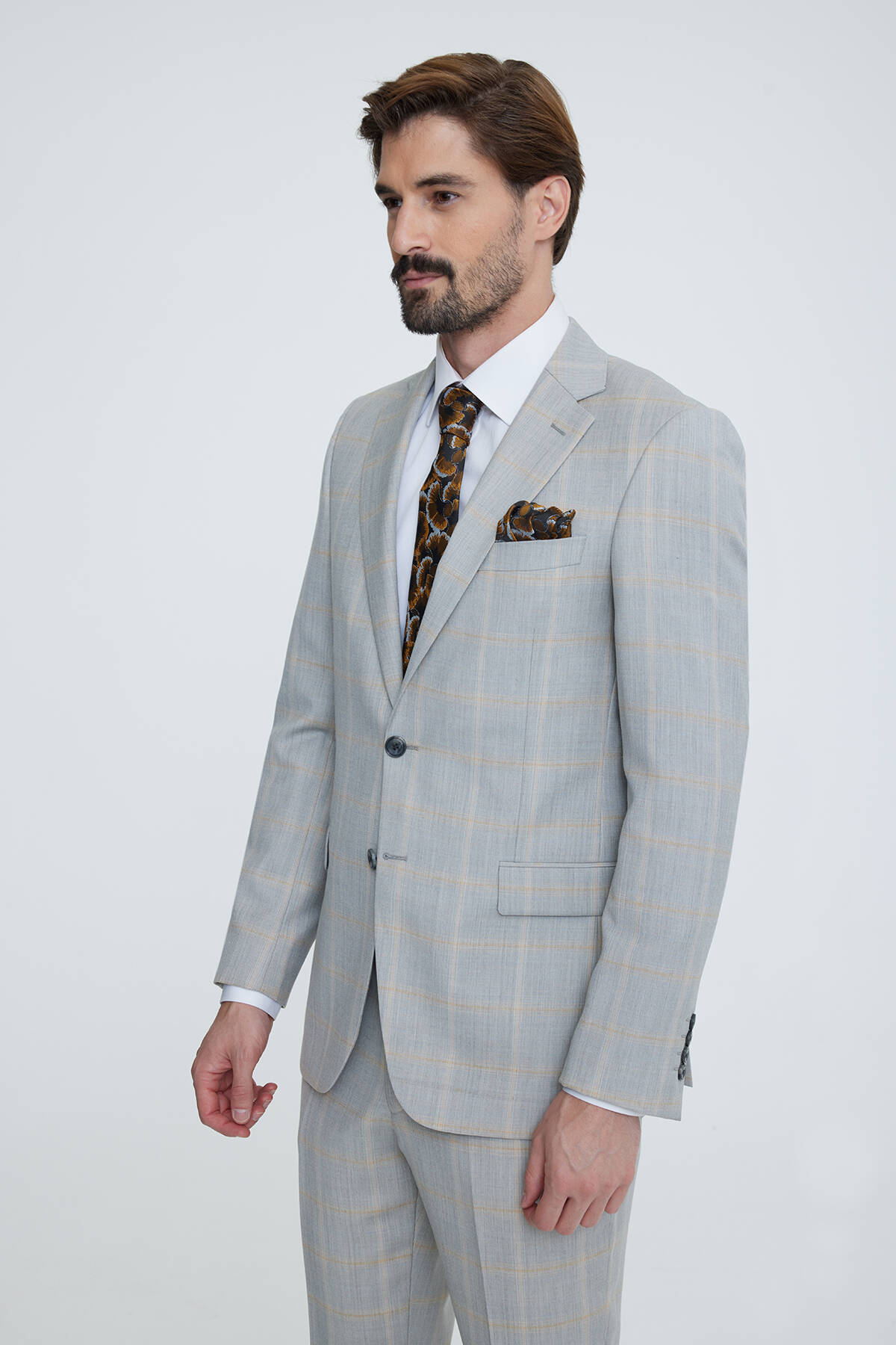 Erkek Gri Bej Regular Fit Ekose Takım Elbise