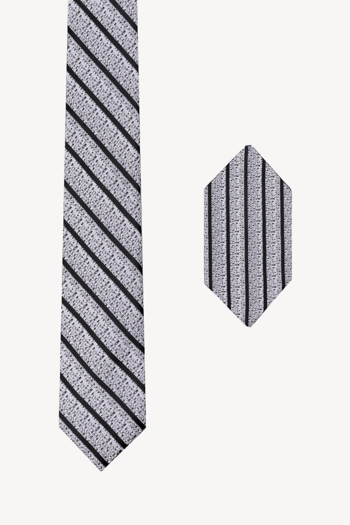 Erkek Gri Çizgili Dokulu Kravat Mendil Set
