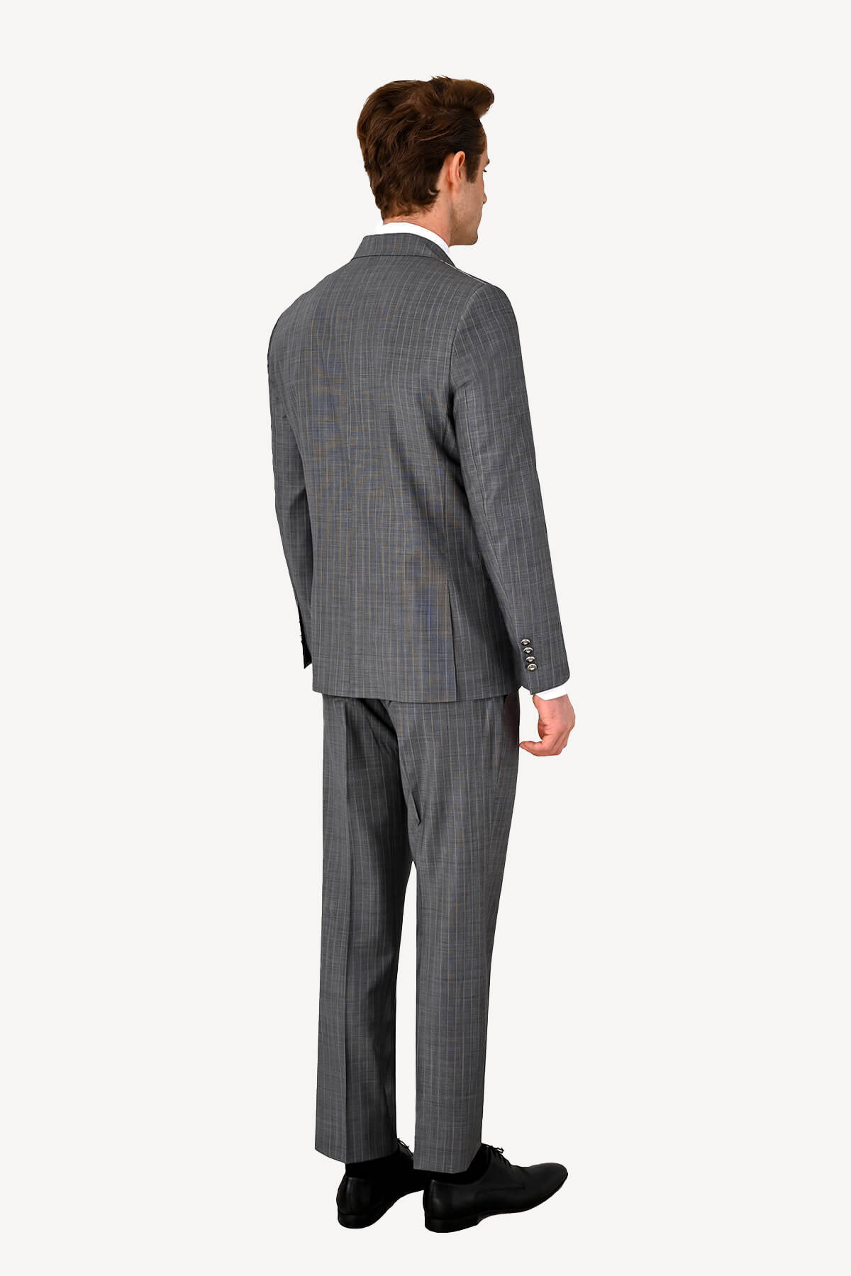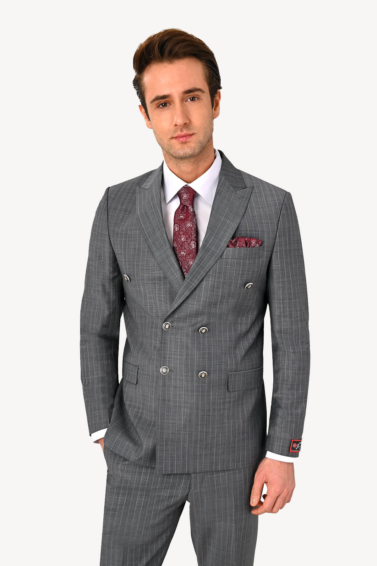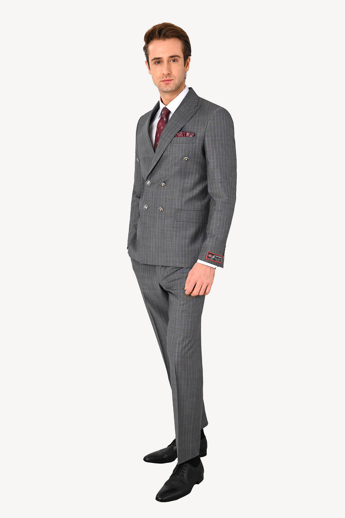 Erkek Gri Çizgili Regular Fit Kruvaze Takım Elbise