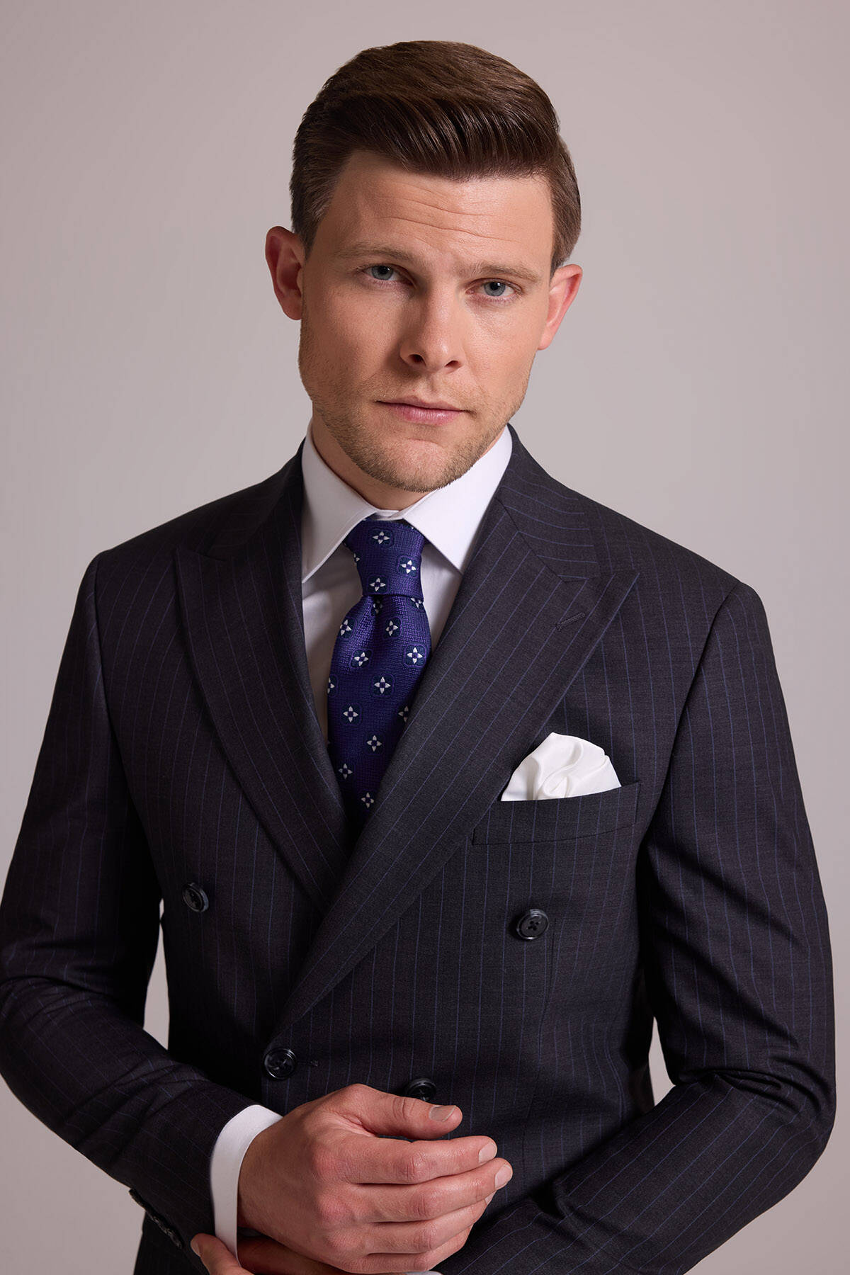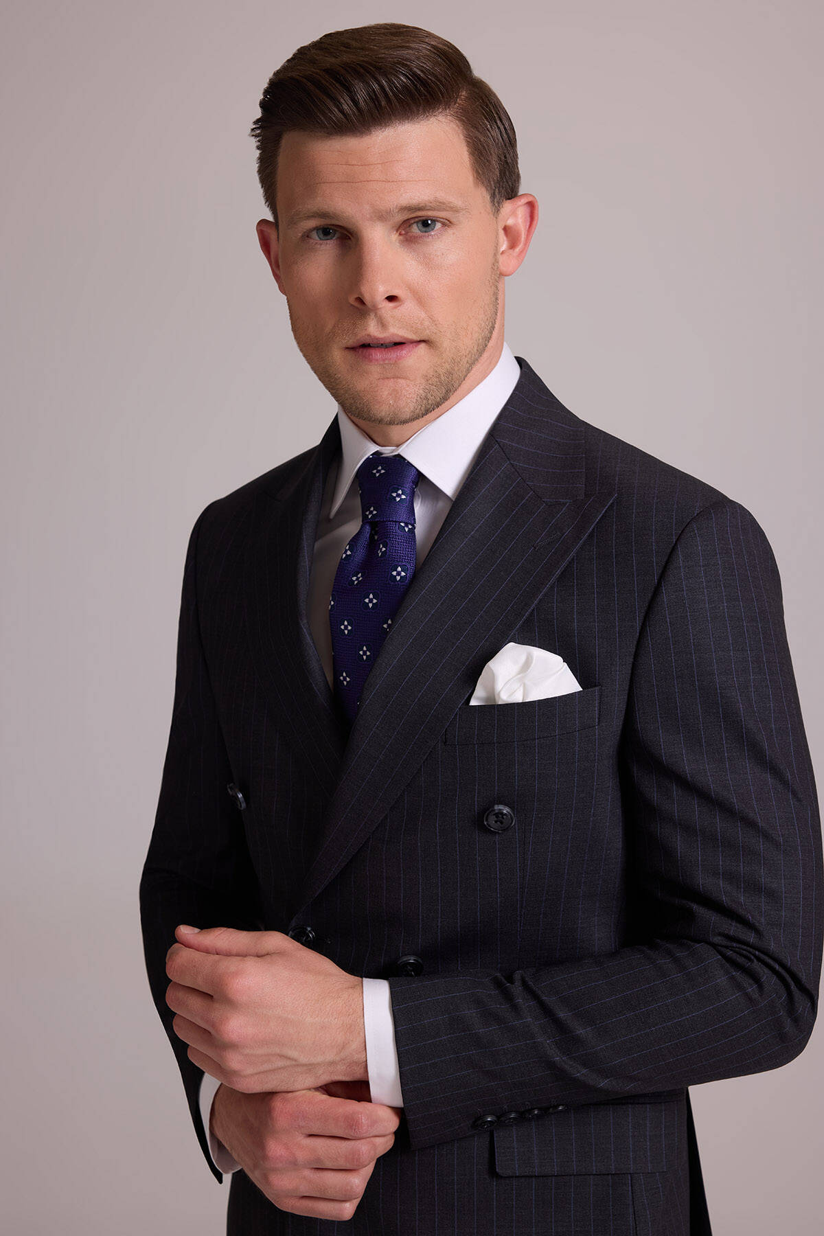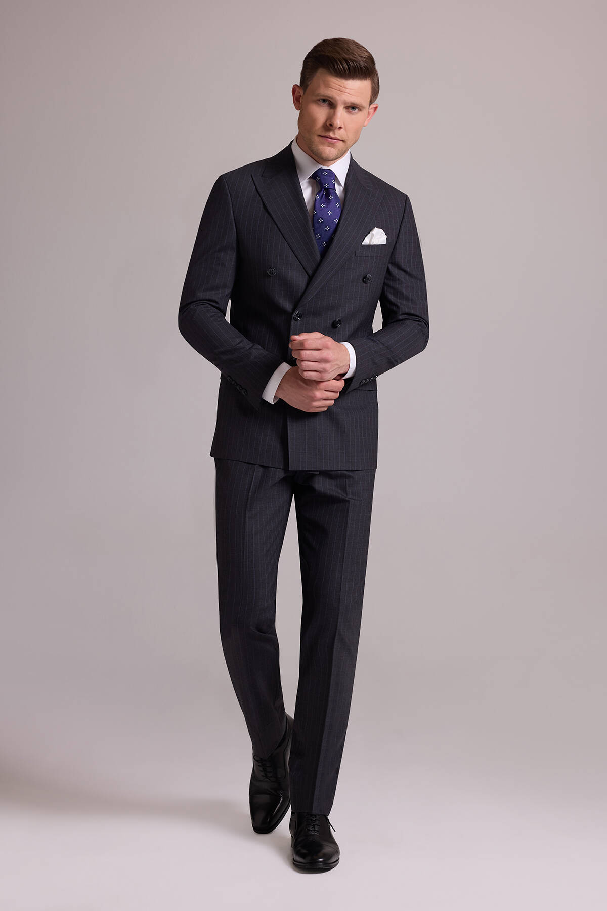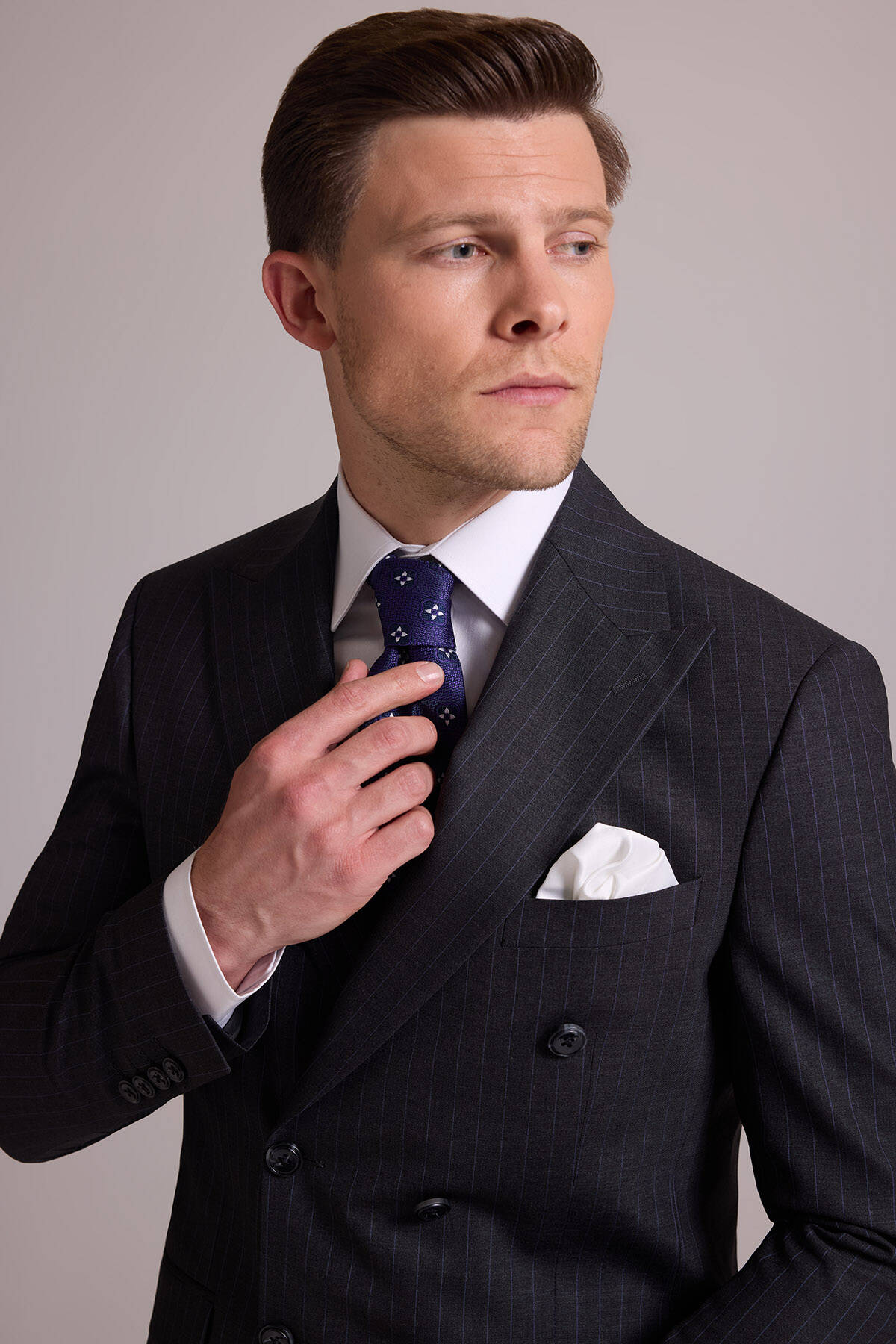 Erkek Lacivert Çizgili Slim Fit Sivri Yaka Kruvaze %100 Yün Takım Elbise