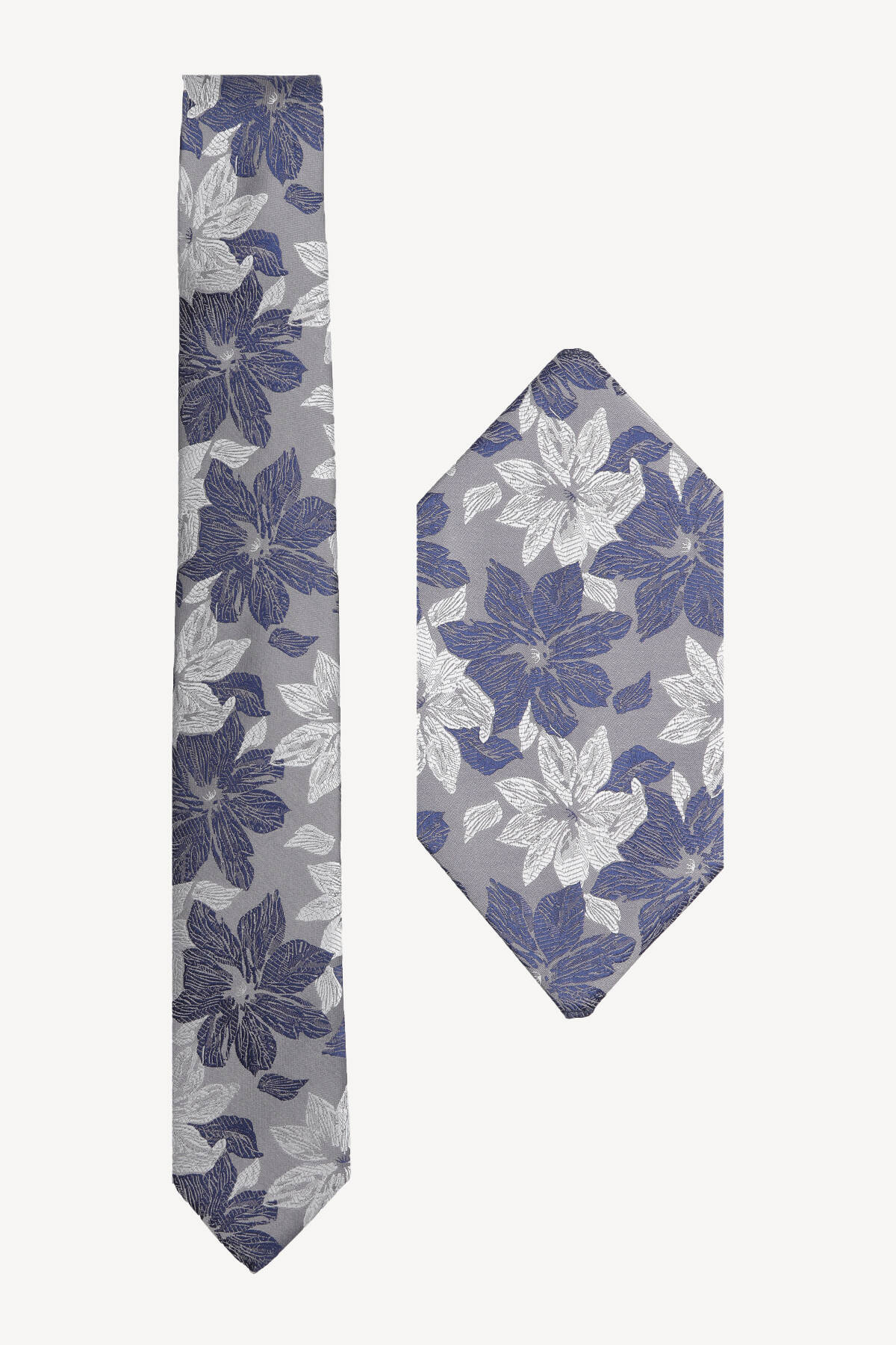 Erkek Gri Mavi Desenli Kravat Mendil Set