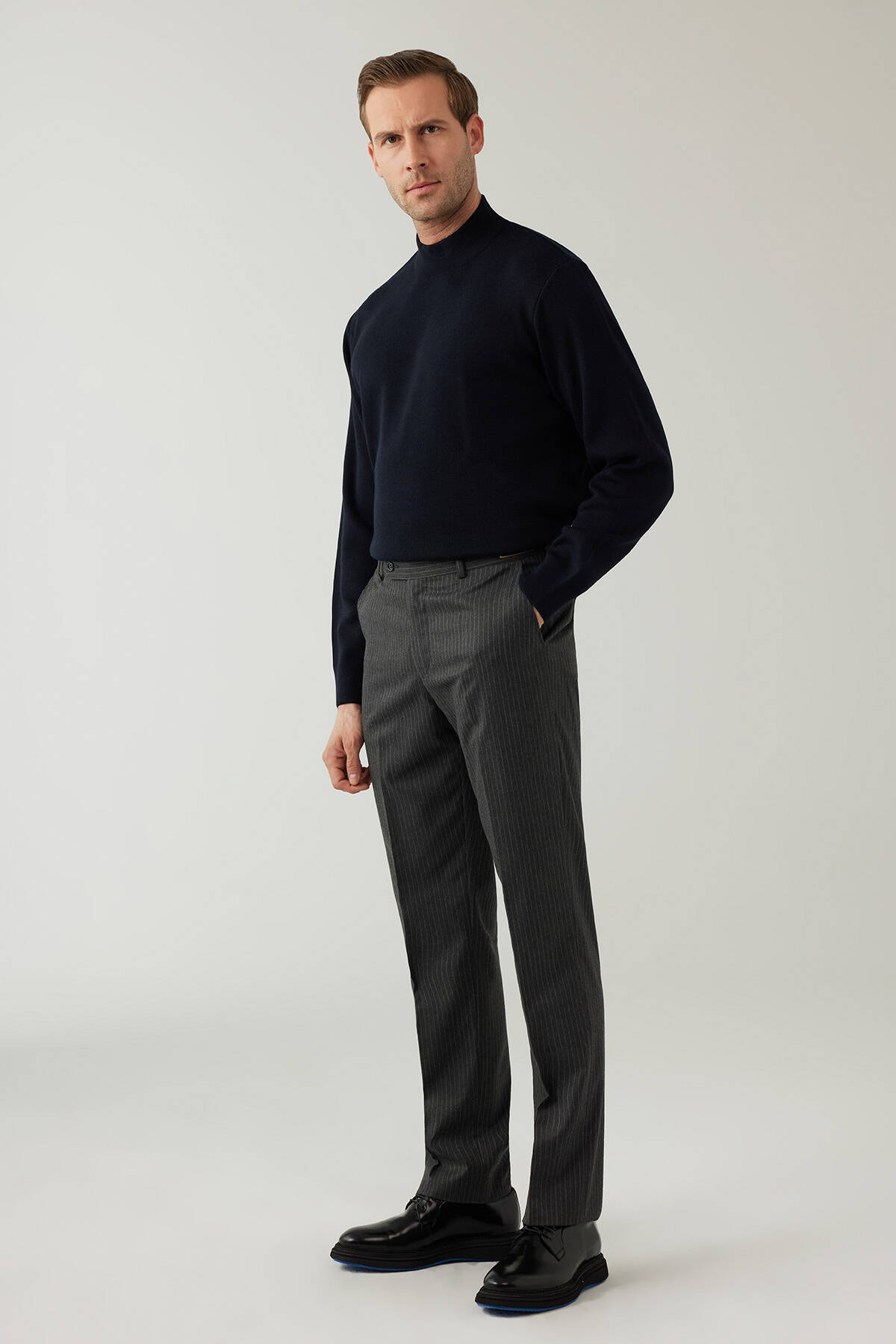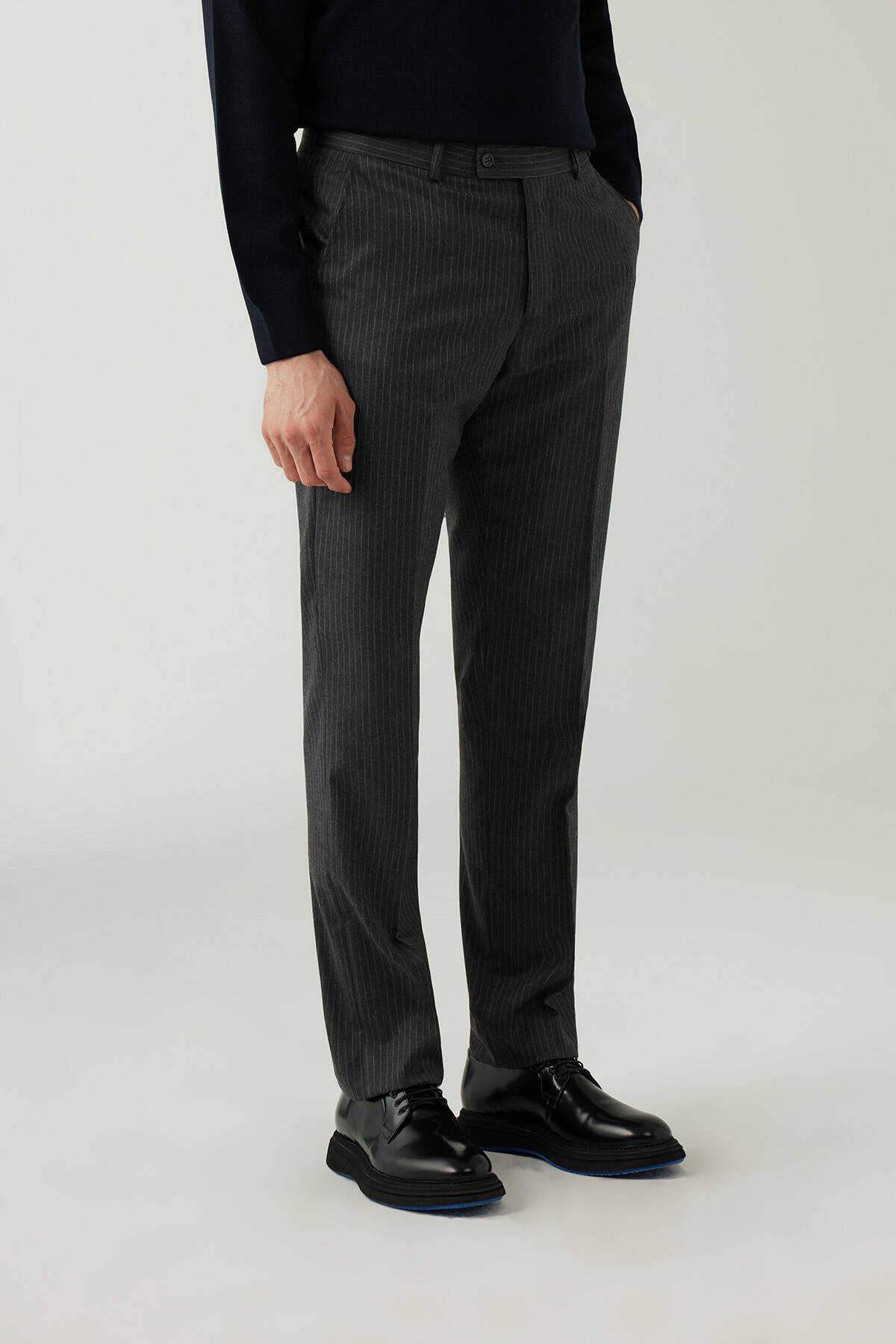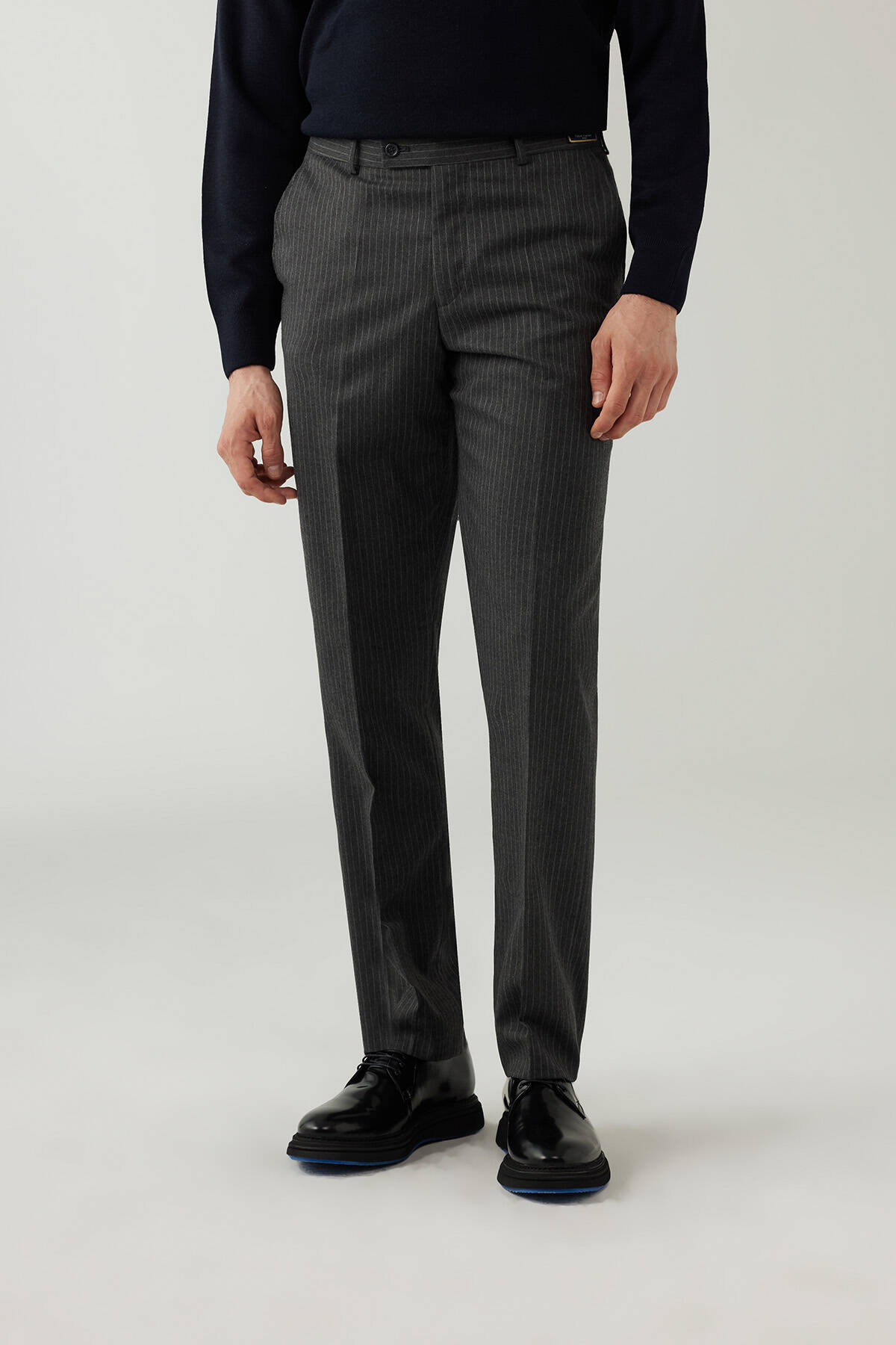 Erkek Gri Regular Fit Çizgili Yün Kumaş Pantolon