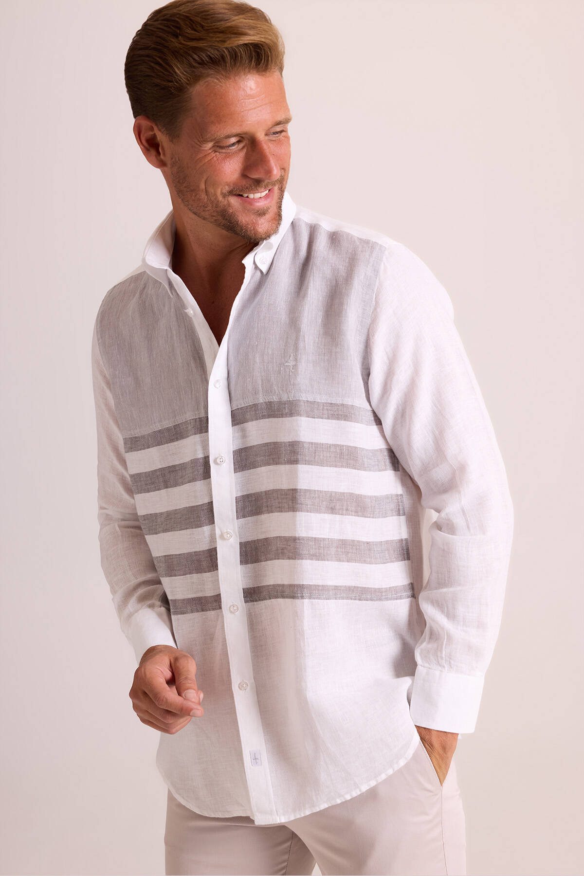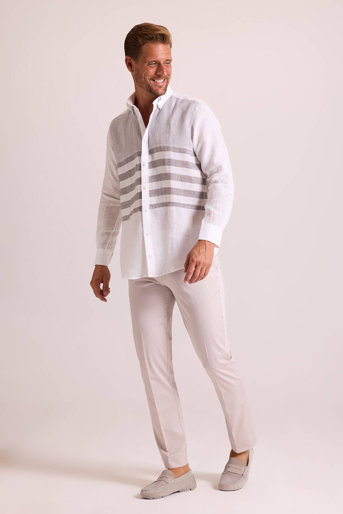 Bu şık erkek keten gömlek, beyaz ve grinin benzersiz harmonisini yansıtarak yaz stilinize güçlü bir ifade katar. Gömleğin gri parçalı desenleri; özellikle bej ya da ekru tonlarda pantolonlarla kombinlendiğinde ortaya eşsiz Akdeniz şıklığı çıkar. Gri çizgili gömleği; beyaz keten pantolon ve süet loafer ile tamamlayarak marine akşamı davetlerine ya da akşamüstü kokteyllerine katılabilirsiniz. YSF Giyim, klas ve prestijli bir tarz için ihtiyacınız olan en şık erkek keten modelleri ile koleksiyonunu zenginleştirir. Siz de seçkin stil örneği olan keten gömlekleri ayrıcalıklı fiyatlarla seçerek, yaz gardırobunuzu bir üst seviyeye taşımanın keyfini çıkarabilirsiniz!