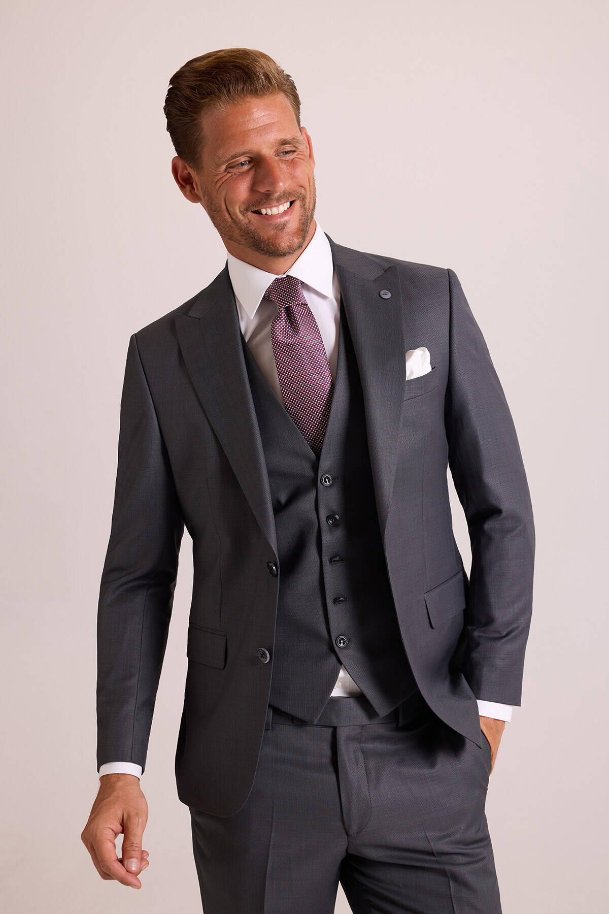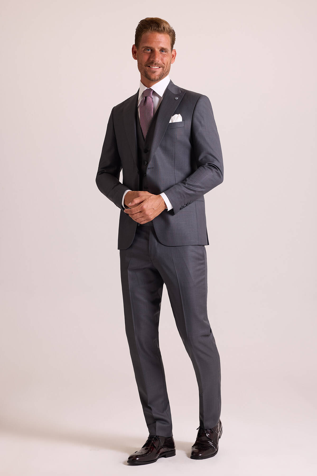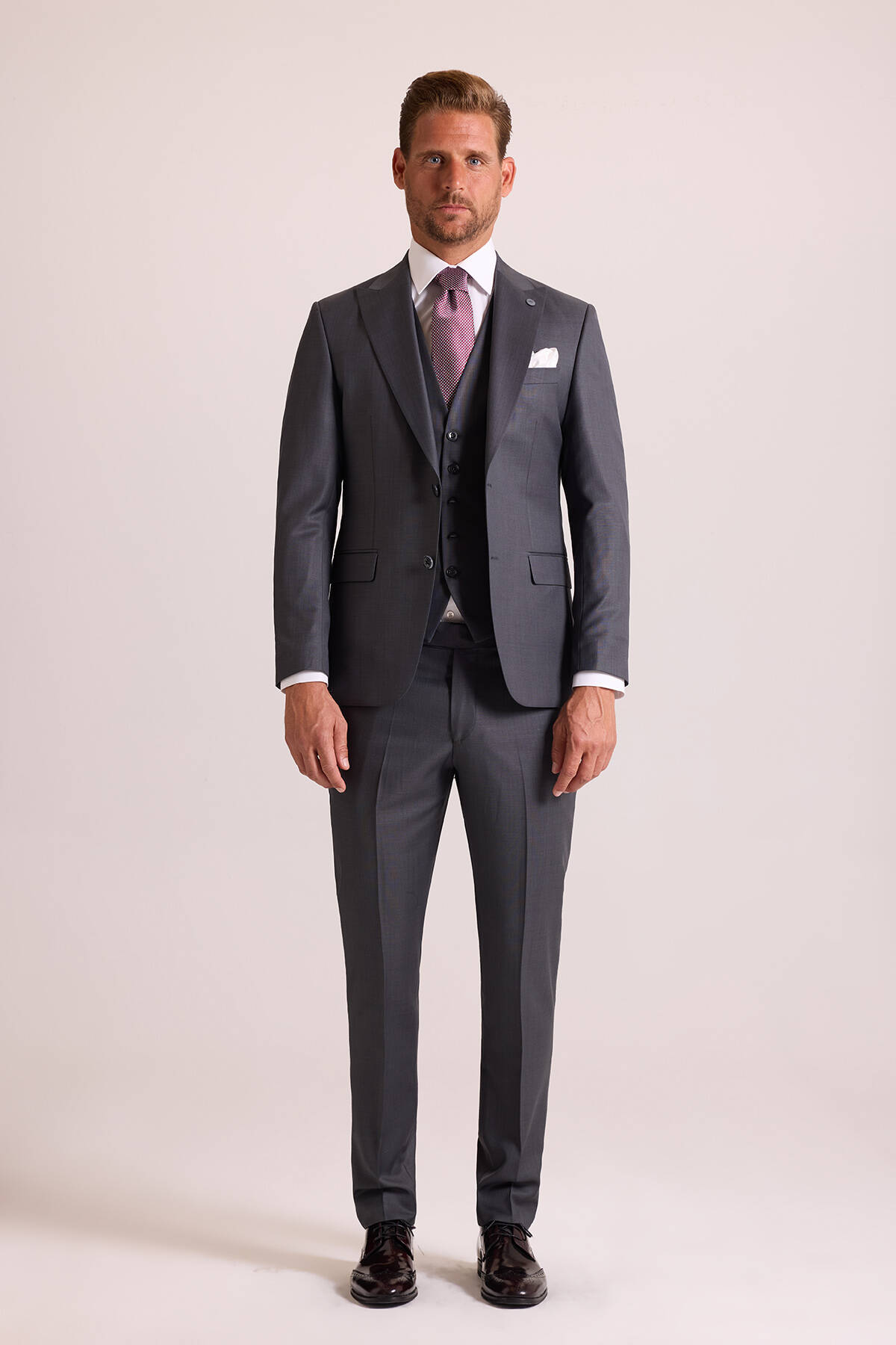 Erkek Gri Slim Fit Sivri Yaka Yelekli Takım Elbise