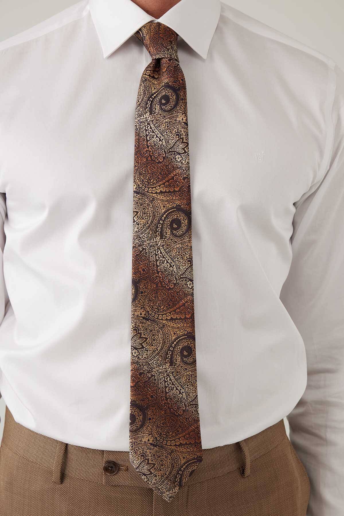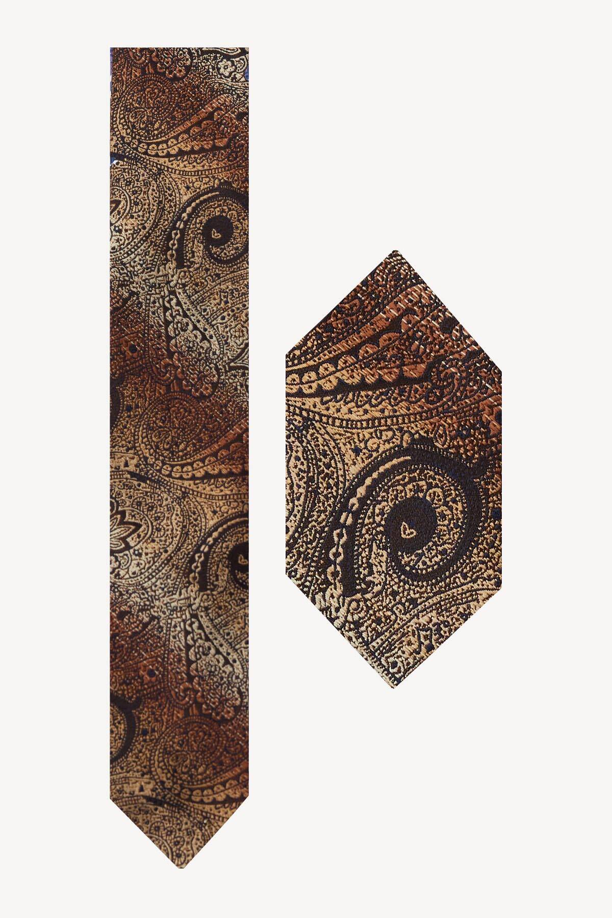 Erkek Kahve Gold Desenli Kravat Mendilli Set