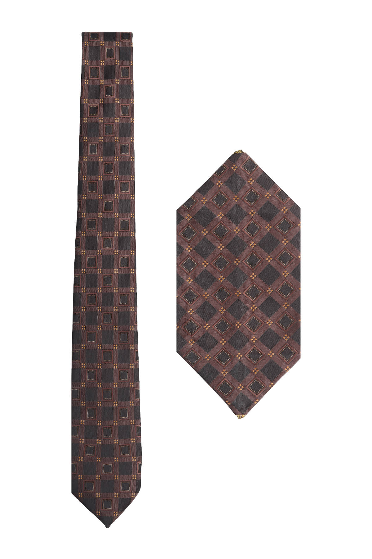 Erkek Kahverengi Desenli Kravat Mendil Set