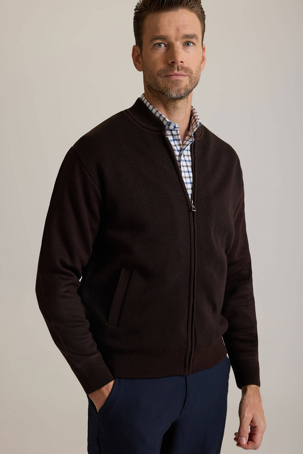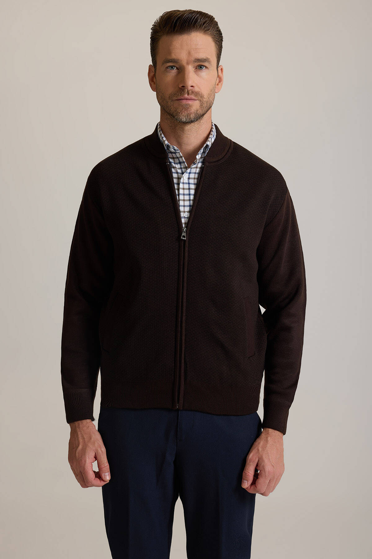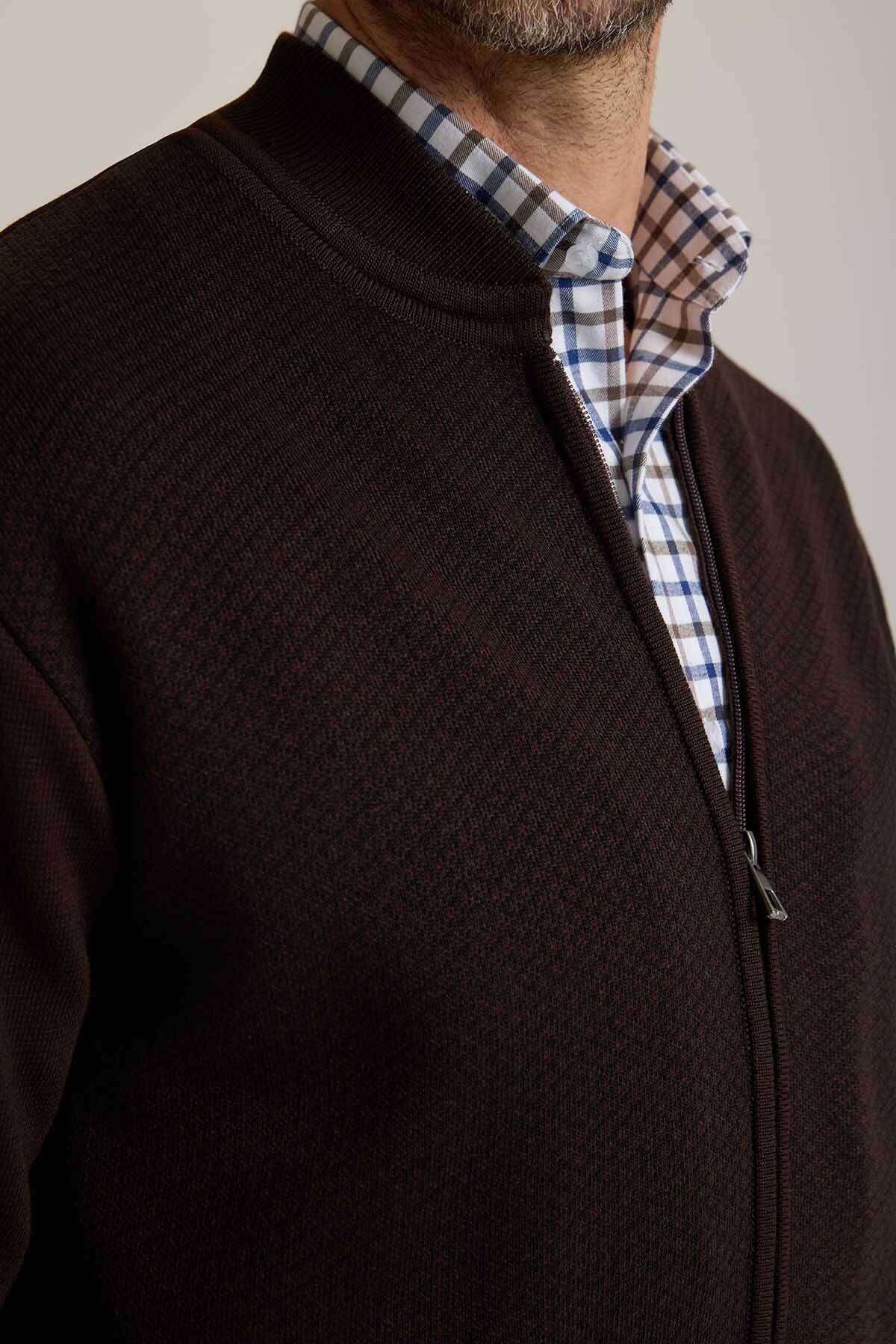 Erkek Kahverengi Regular Fit Desenli Triko Hırka
