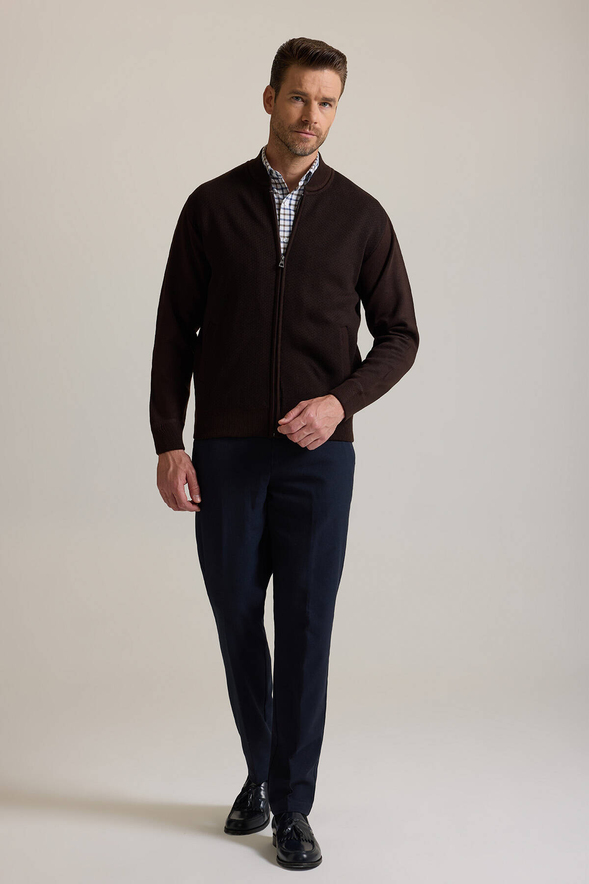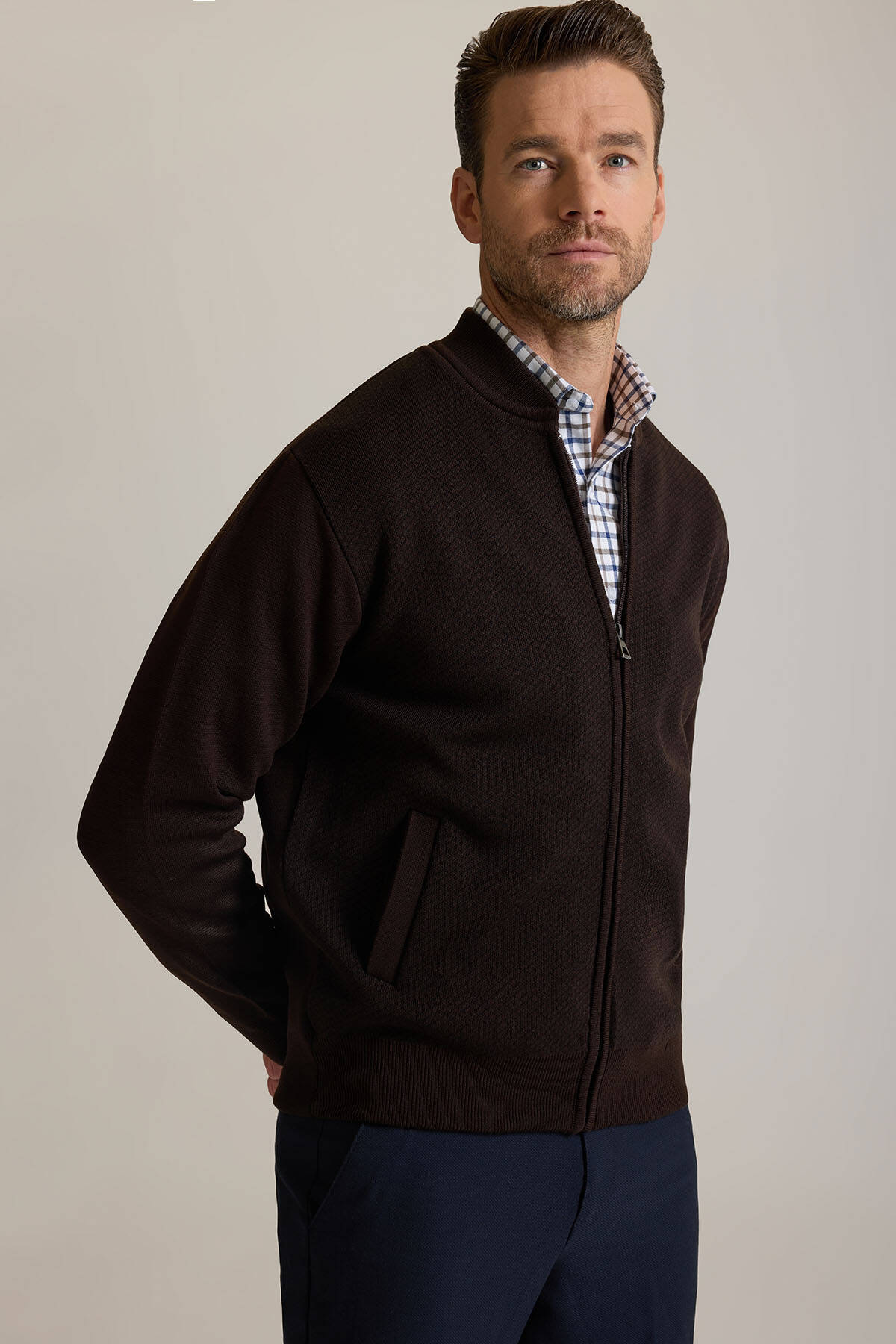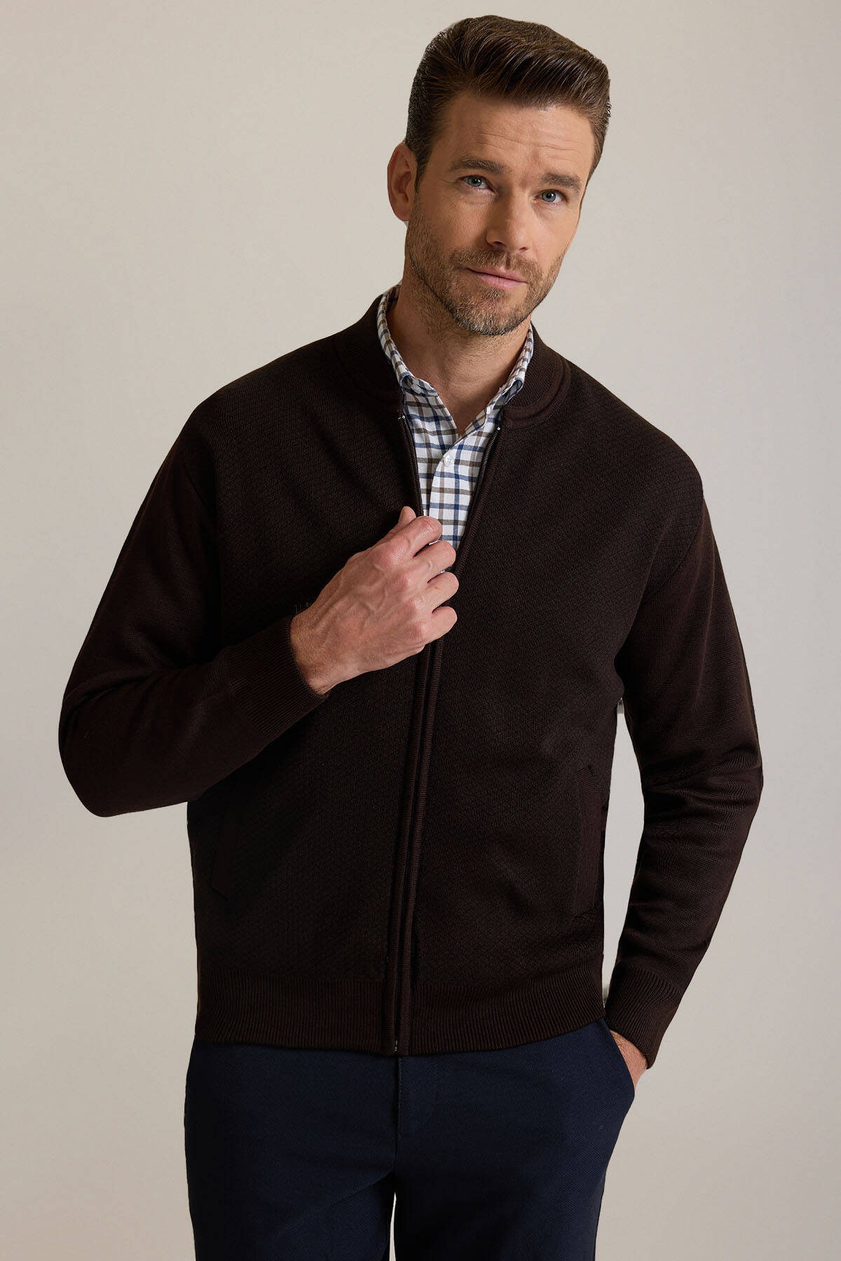 Erkek Kahverengi Regular Fit Desenli Triko Hırka