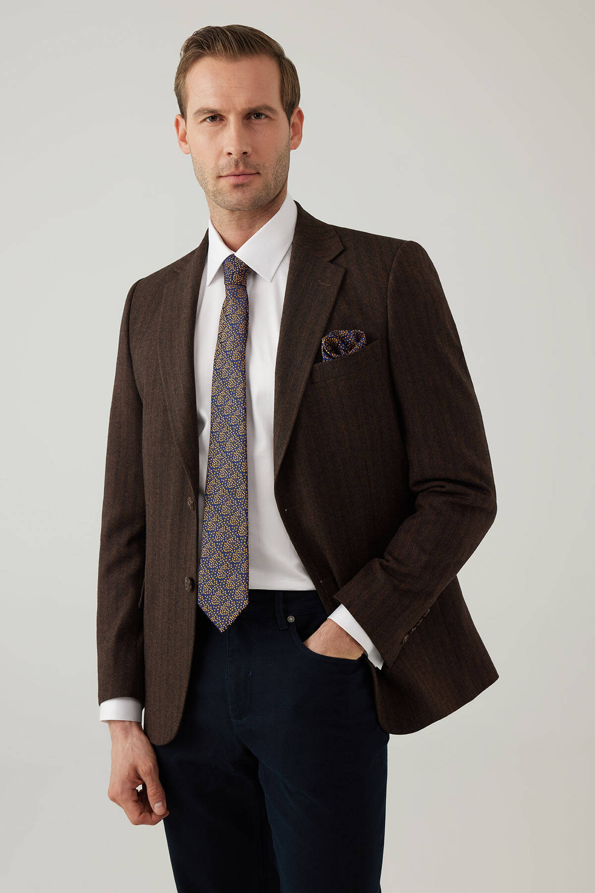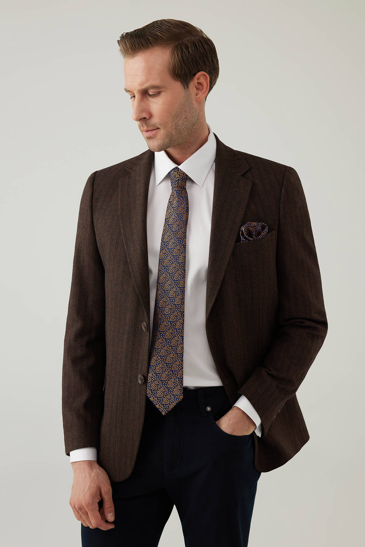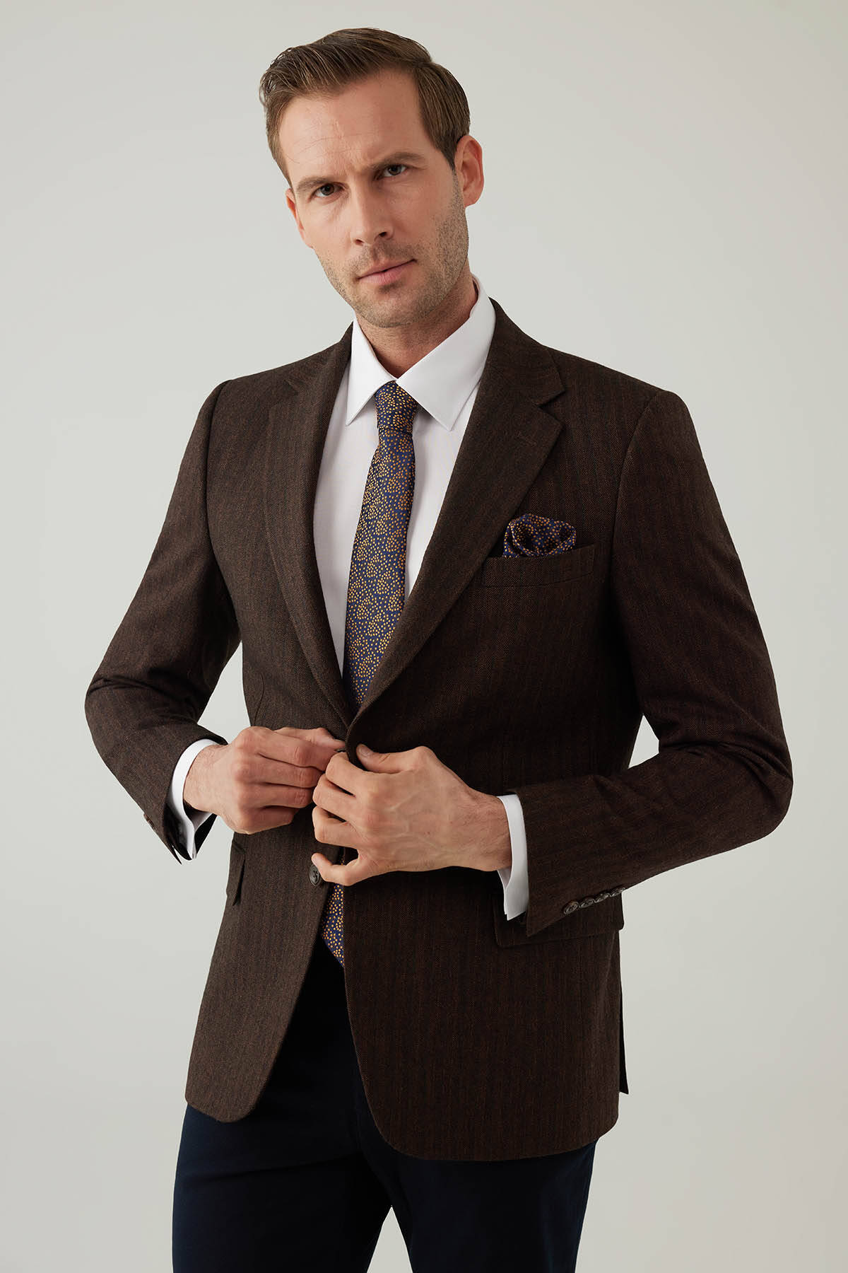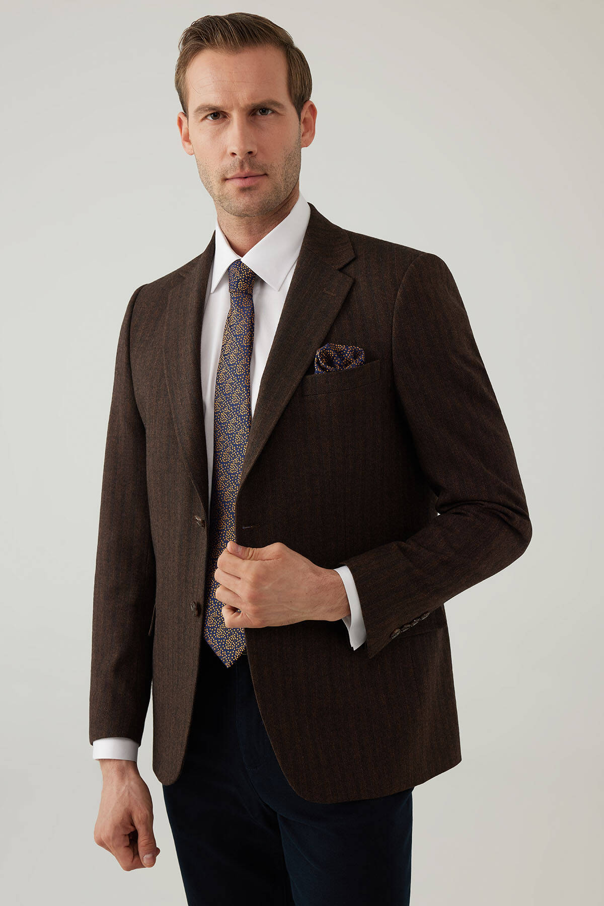 Erkek Kahverengi Regular Fit Mono Yaka Çizgili Yün Karışımlı Ceket