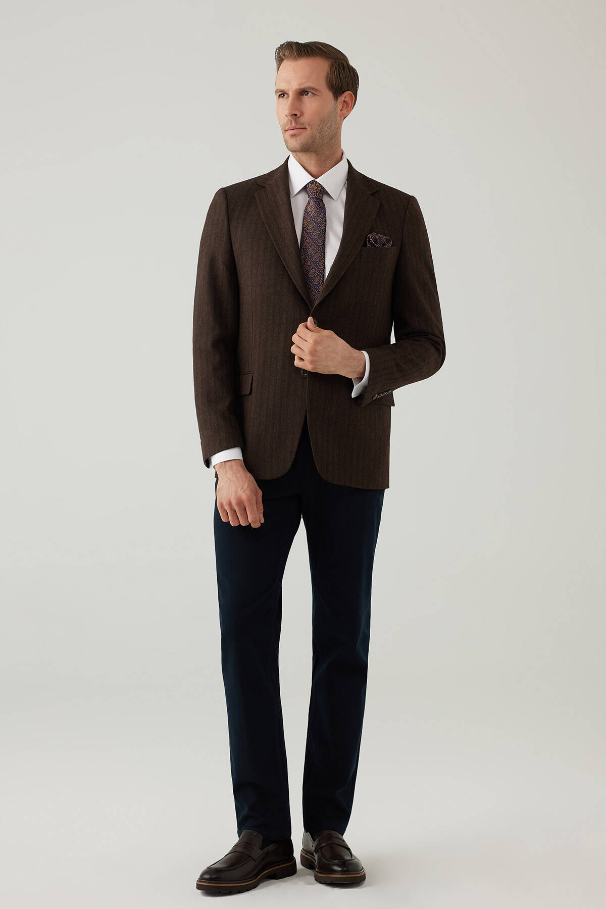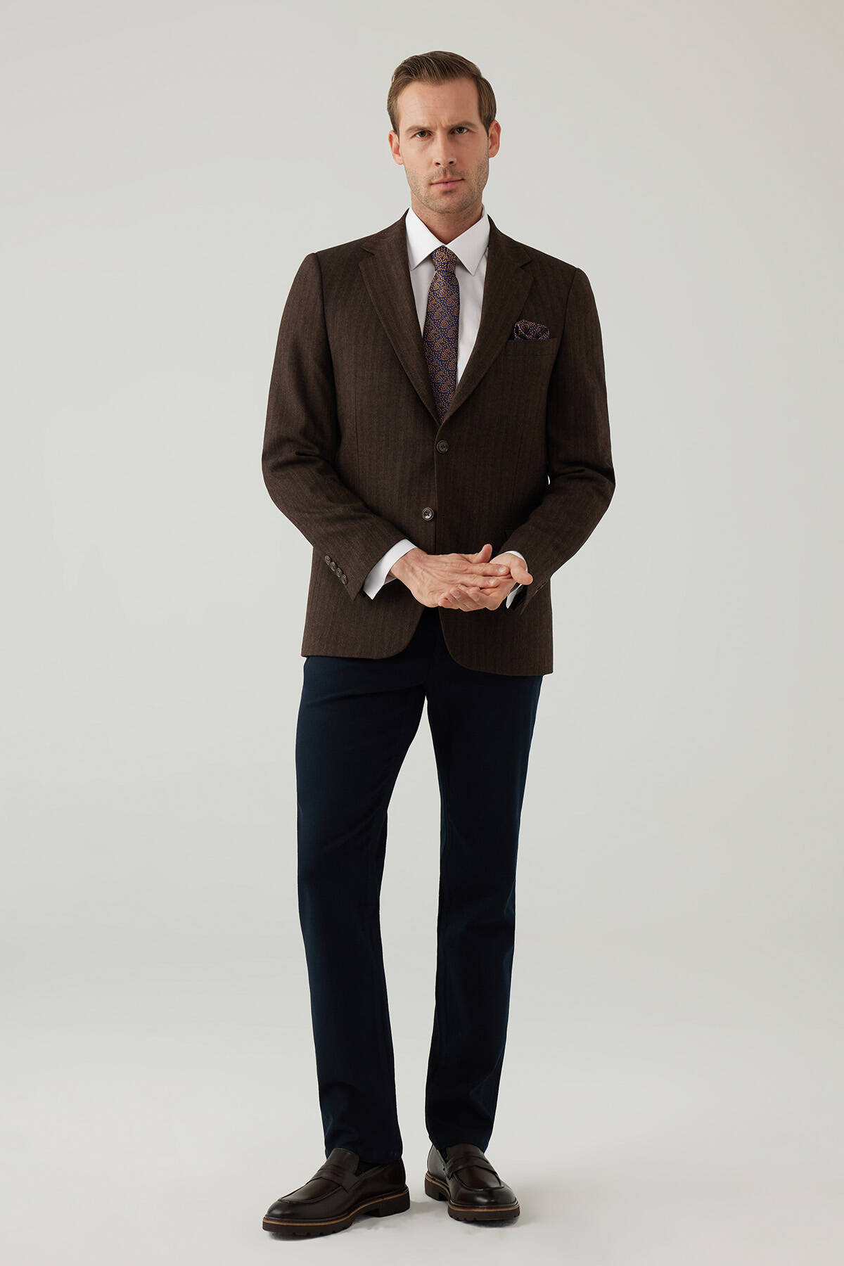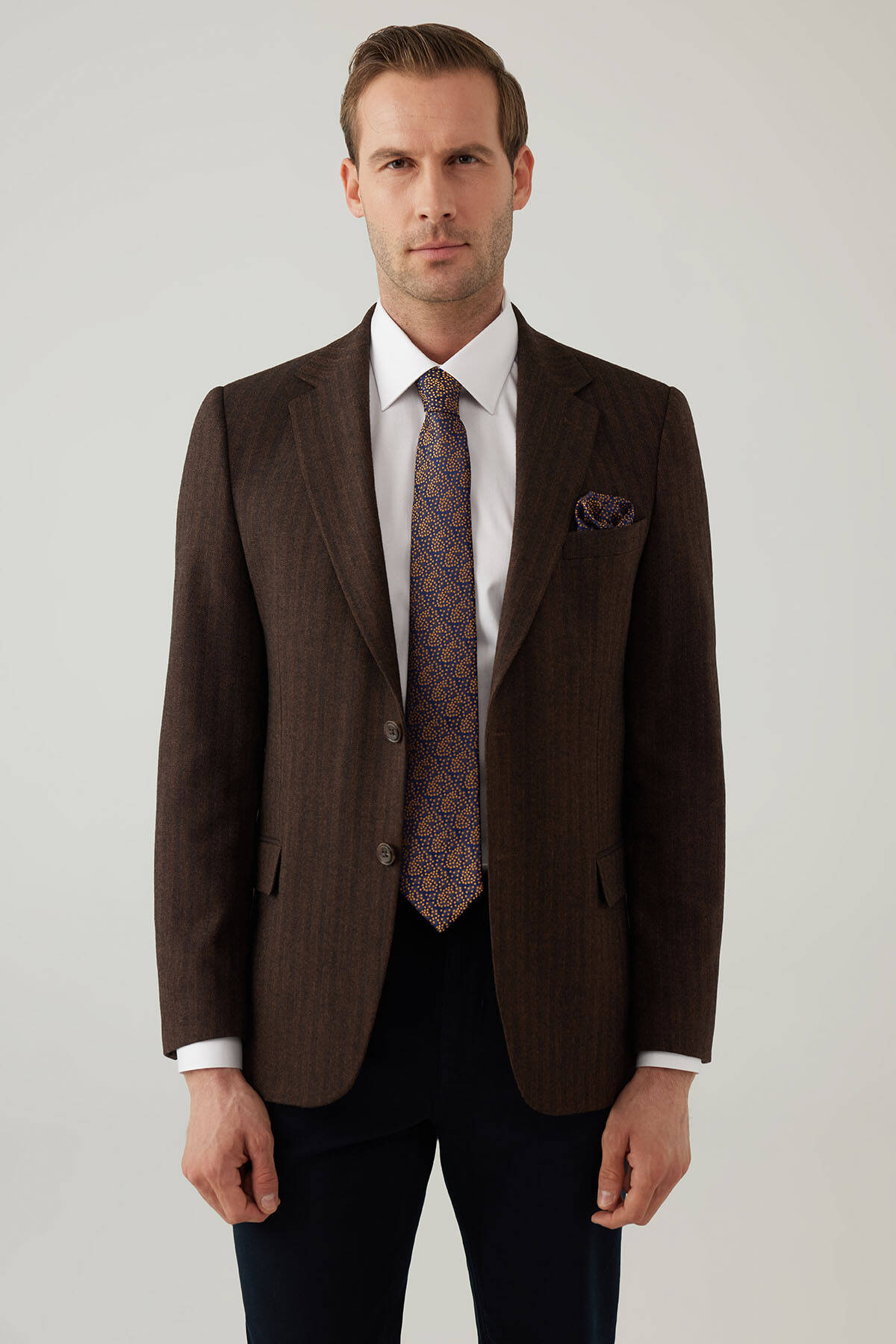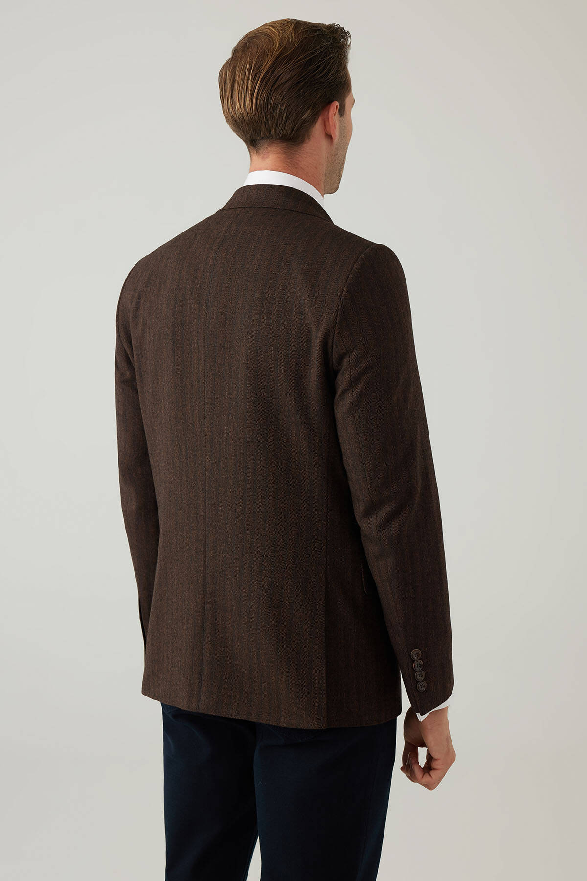Erkek Kahverengi Regular Fit Mono Yaka Çizgili Yün Karışımlı Ceket