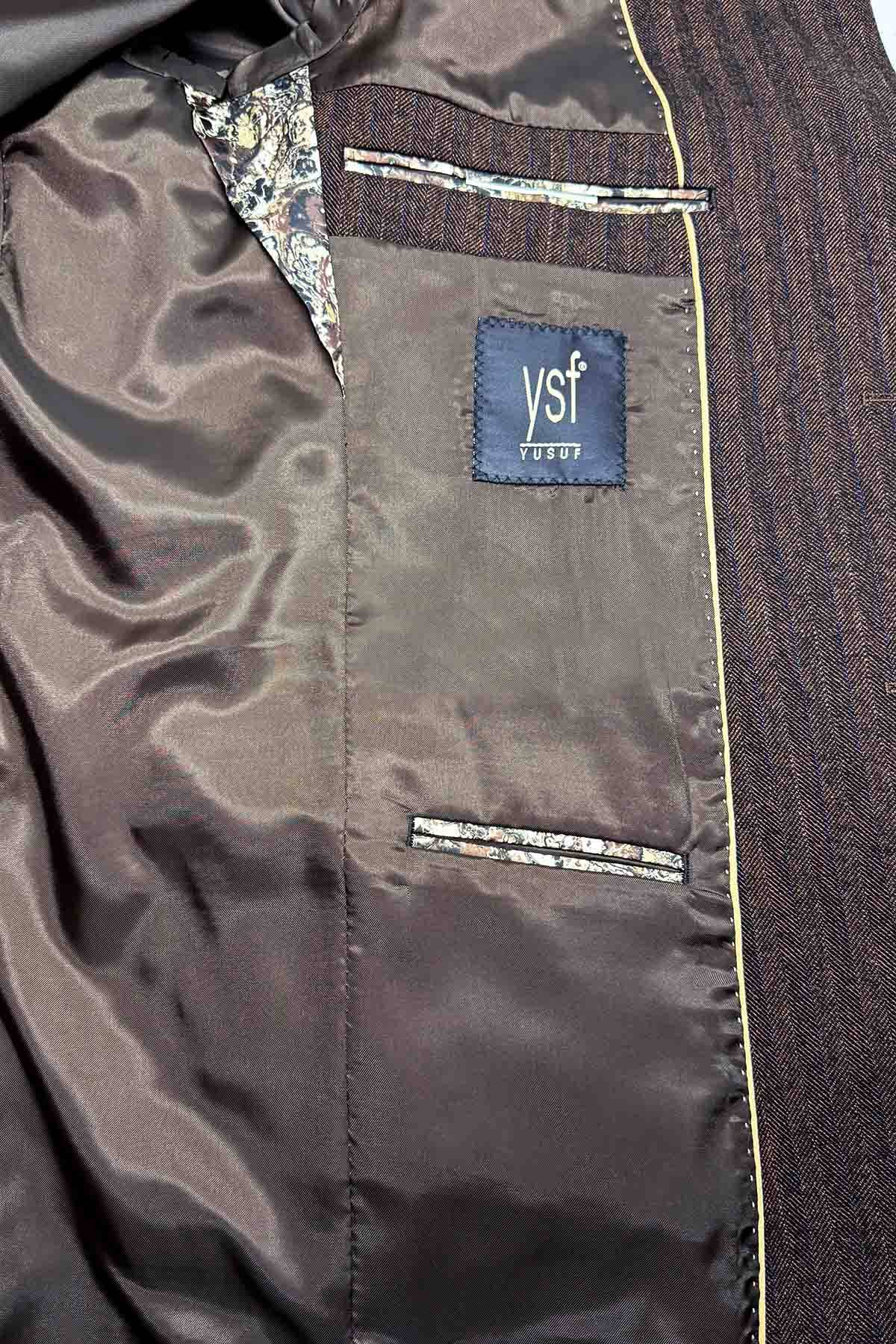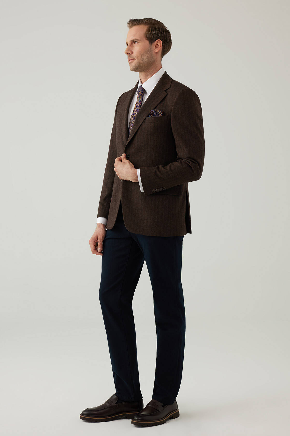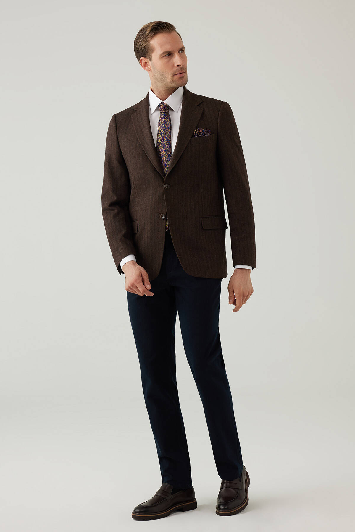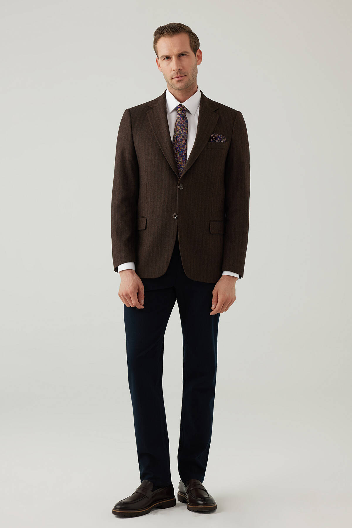 Erkek Kahverengi Regular Fit Mono Yaka Çizgili Yün Karışımlı Ceket