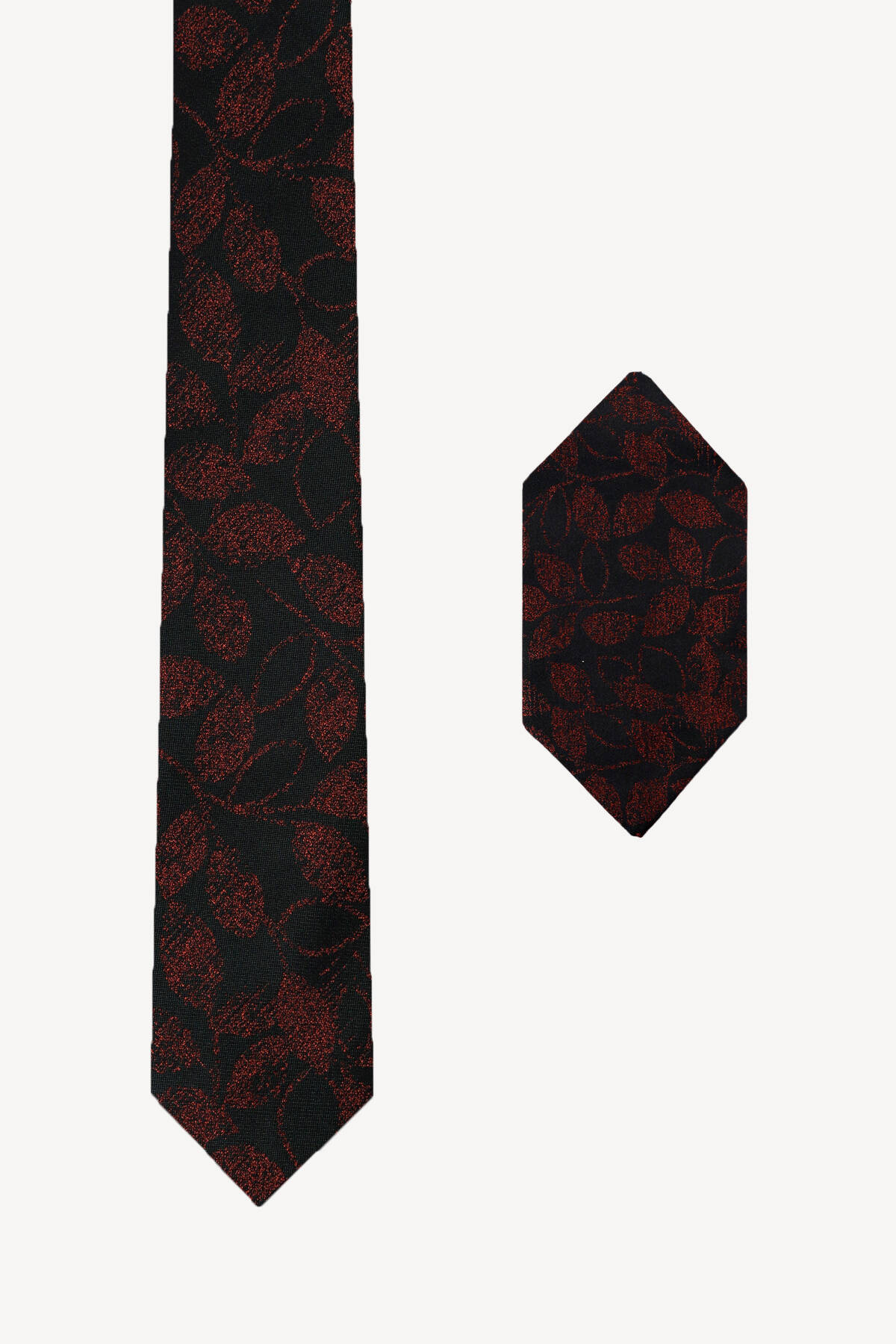Erkek Kırmızı Siyah Yaprak Desenli Kravat Mendil Set