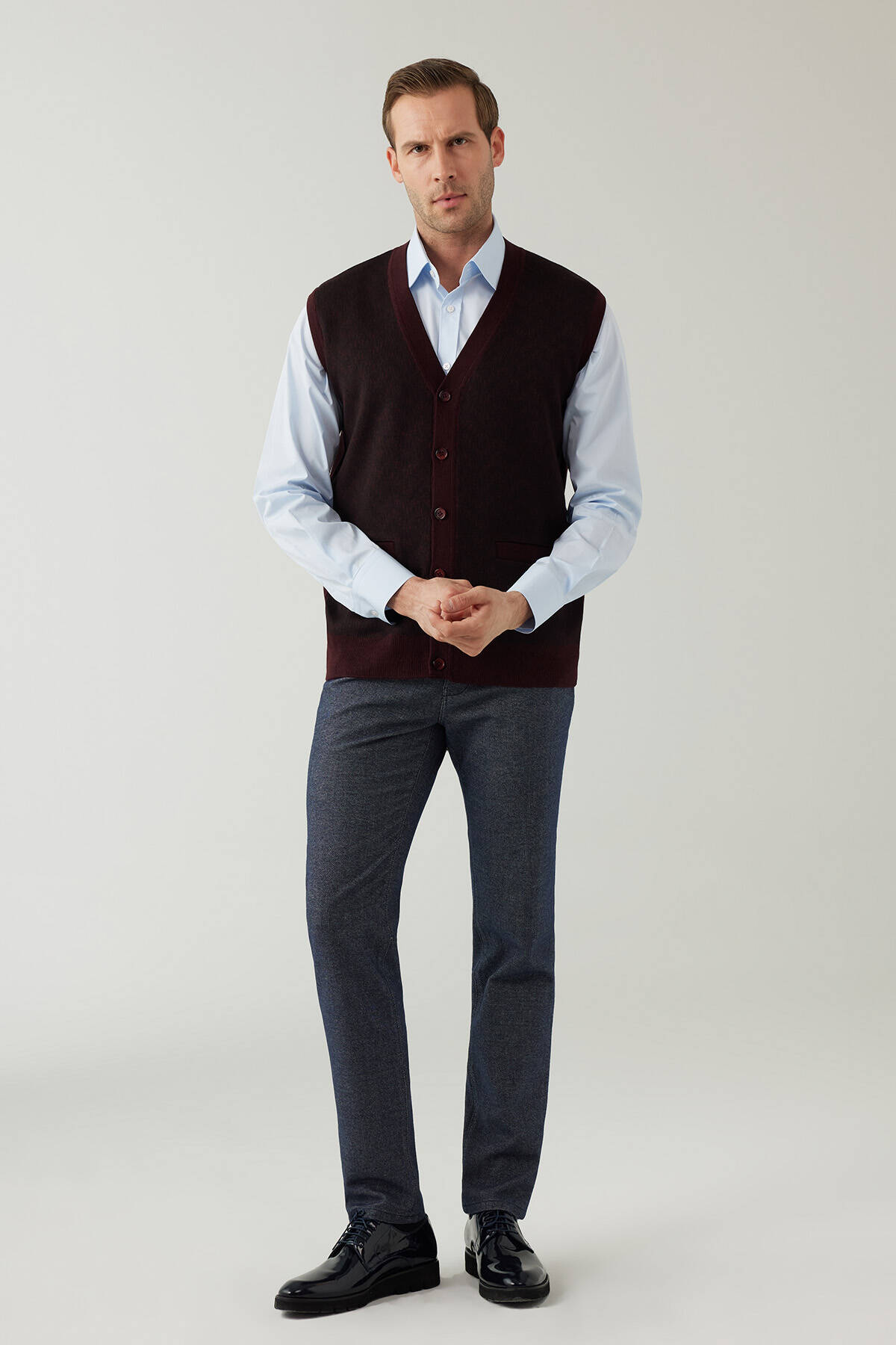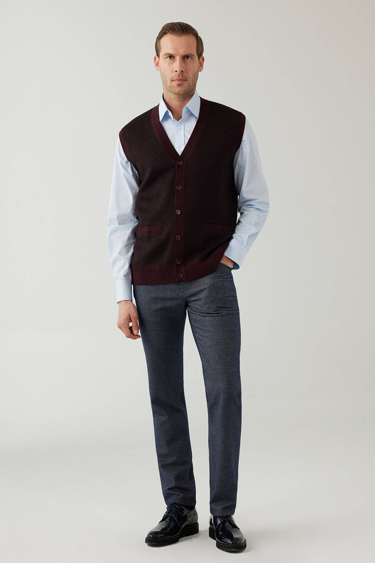 Erkek Koyu Bordo Regular Fit Desenli Yün Karışımlı Triko Yelek