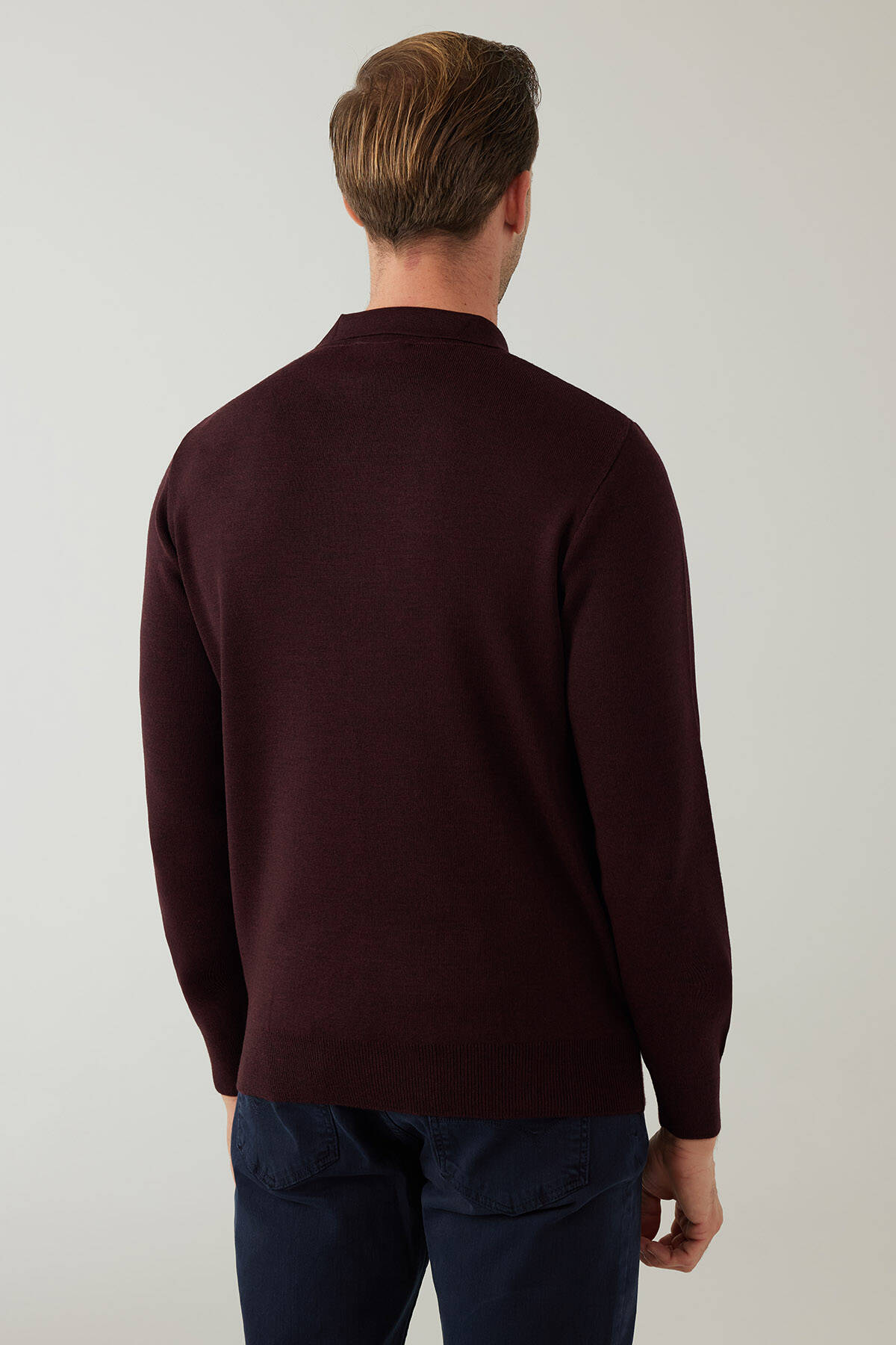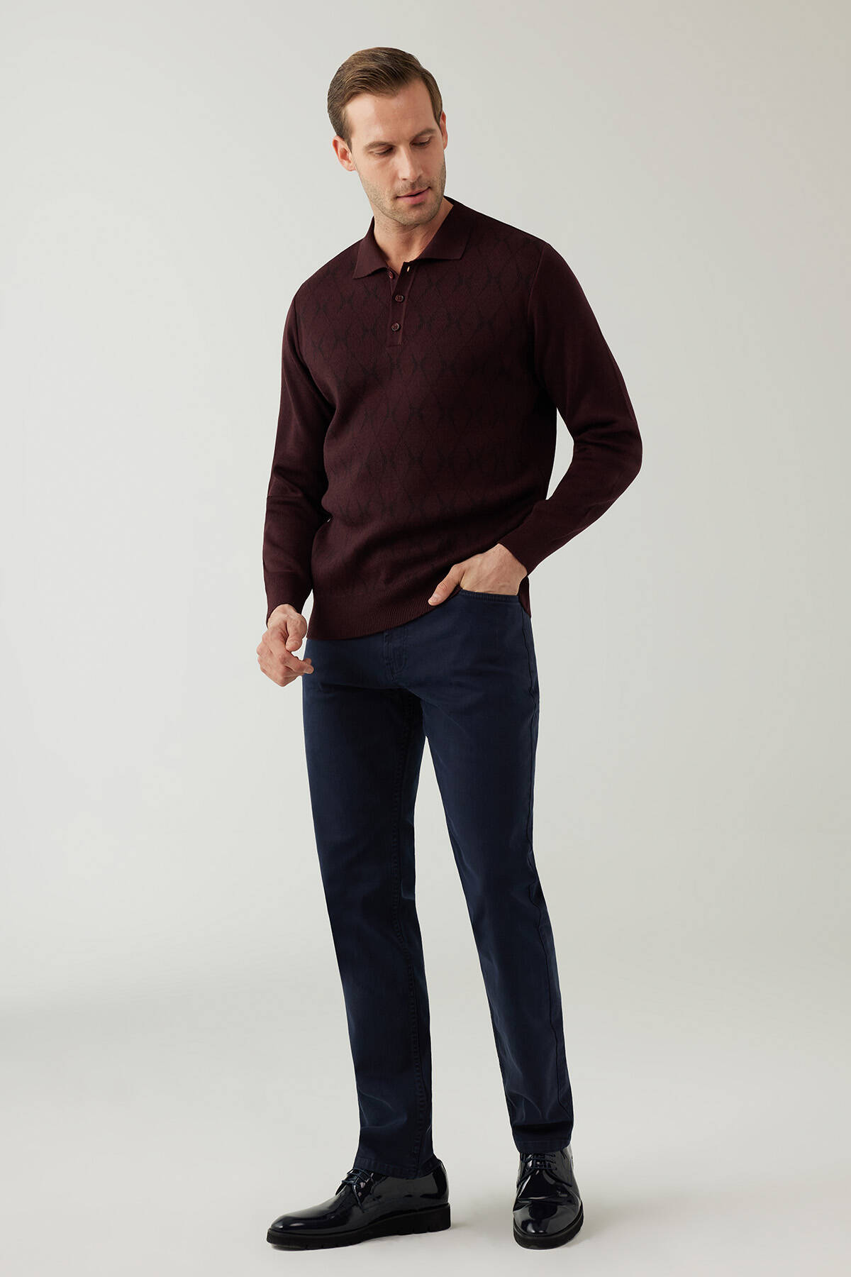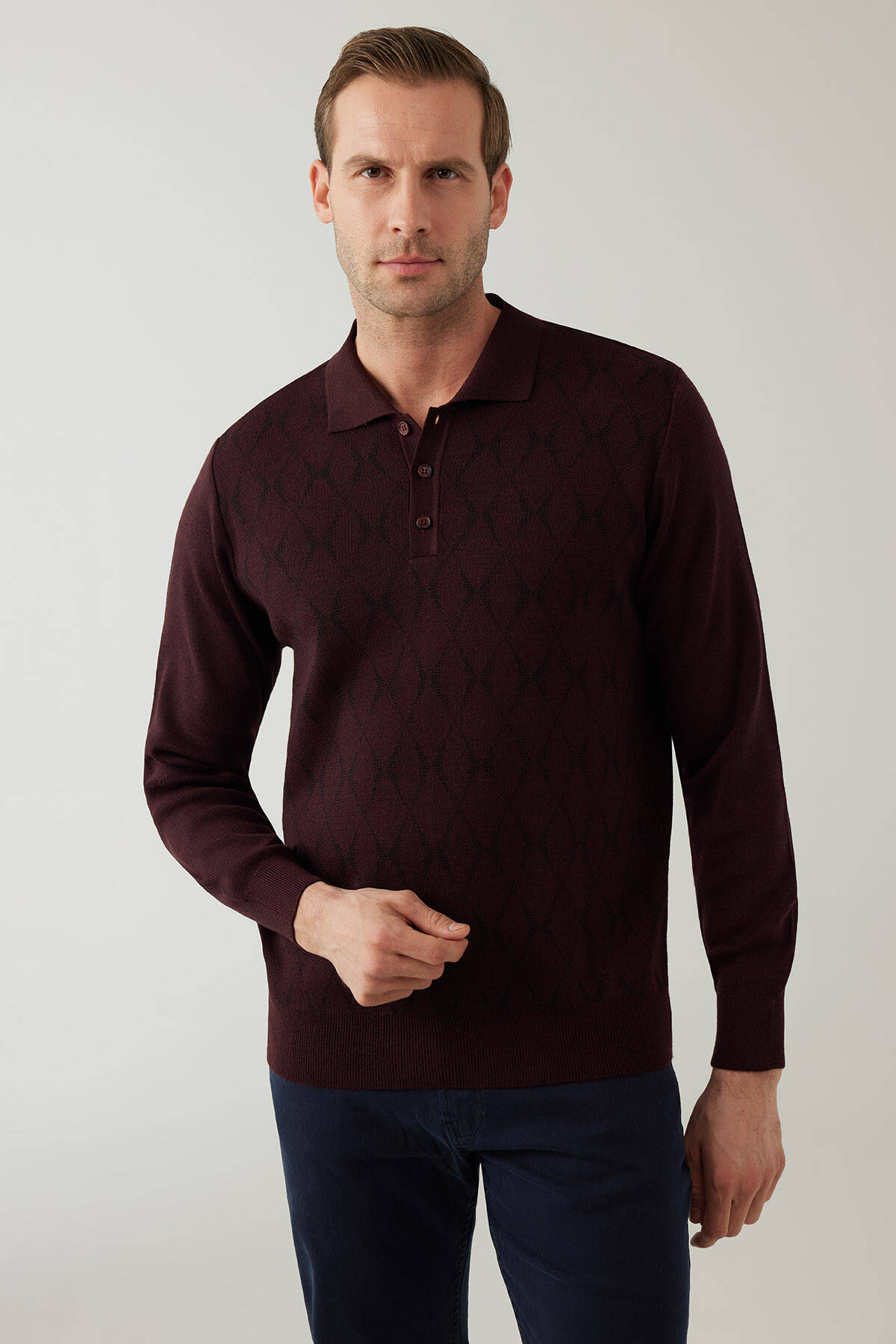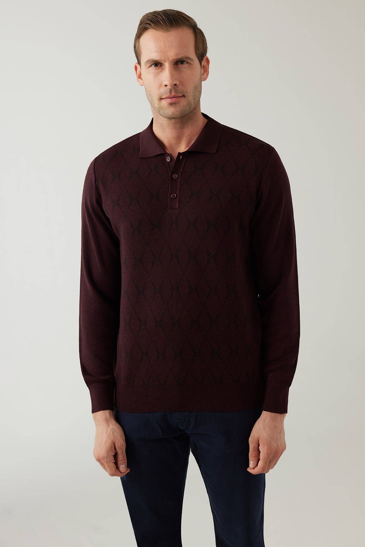 Erkek Koyu Bordo Regular Fit Desenli Yünlü Polo Yaka Triko