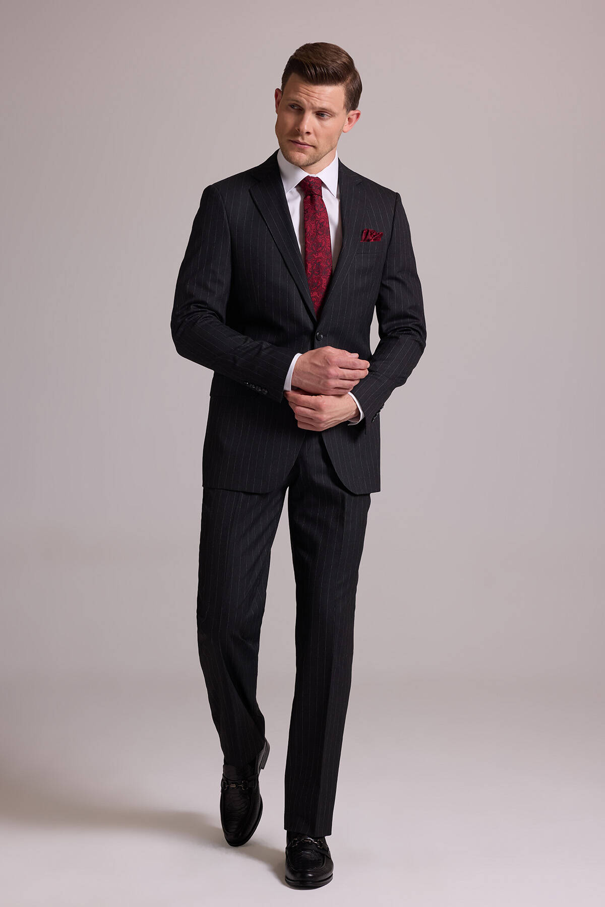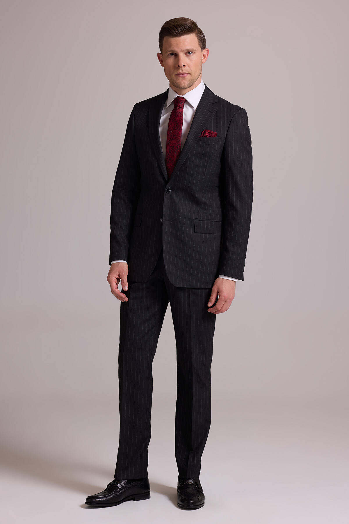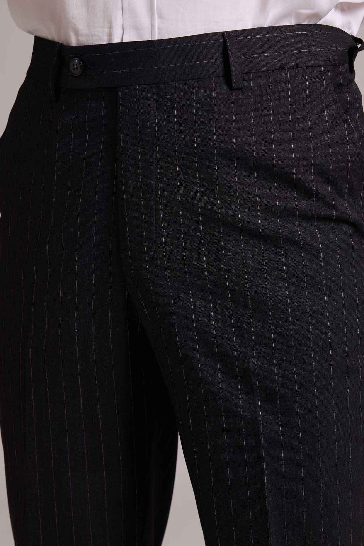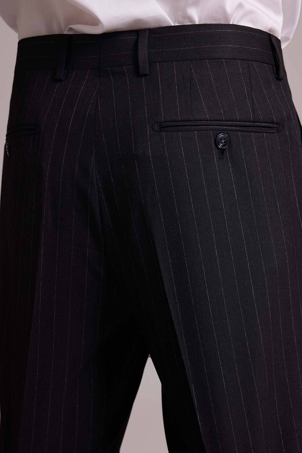 Bu resmi parça, modası asla geçmeyecek koyu gri çizgili bir stile sahiptir. Temel rengi ve zamansız deseni ile gerçek bir gardırop temeli olan takım elbise iş sunumlarından düğün ve şık yemeklere kadar tüm resmî durumlarda çabasızca stil sahibi görünmenizi sağlar. Çizgili takım elbise; beyaz klasik gömlek, siyah deri Oxford ayakkabı, gri tonlarda şal yaka kravat ve cep mendili ile kombinlemek üzere idealdir. YSF Giyim, kaliteli ve lüks takım elbise deneyimi yaşamak isteyen stil sahibi erkeklere özel ayrıcalıklı fiyatlar sunar. Siz de klasik detayları ve rafine tarzıyla öne çıkan takım elbise modellerini YSF Giyim fırsatları ile satın alarak imza bir stil oluşturabilir, tarzınızla kalabalıkların arasında öne çıkabilirsiniz!