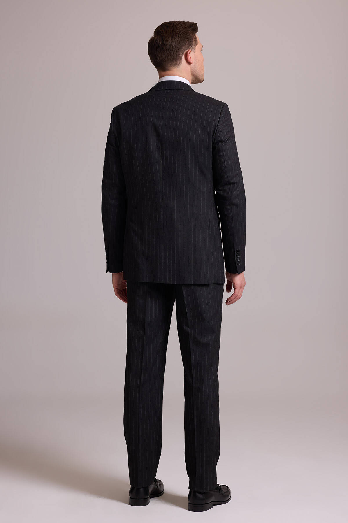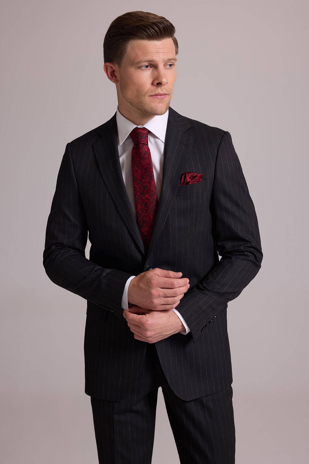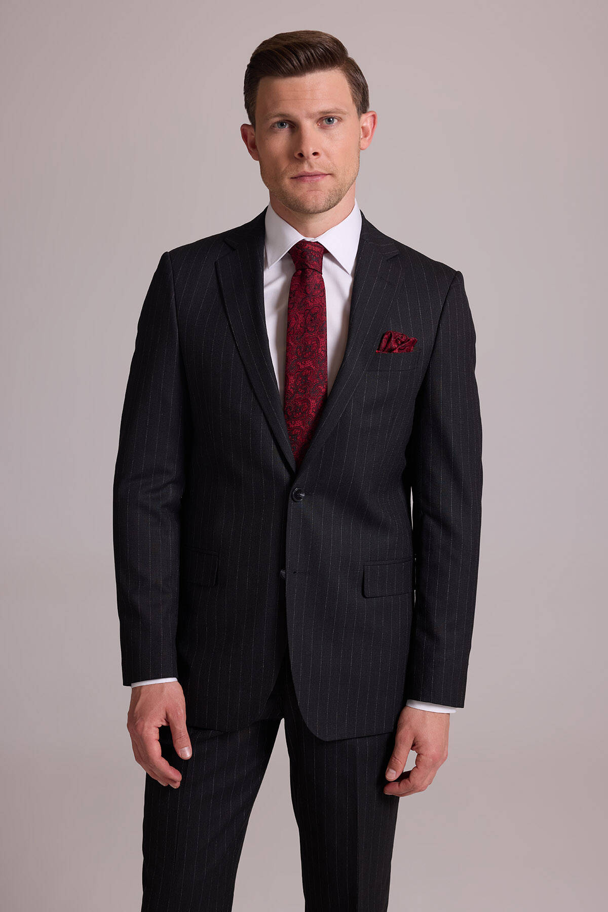 Bu resmi parça, modası asla geçmeyecek koyu gri çizgili bir stile sahiptir. Temel rengi ve zamansız deseni ile gerçek bir gardırop temeli olan takım elbise iş sunumlarından düğün ve şık yemeklere kadar tüm resmî durumlarda çabasızca stil sahibi görünmenizi sağlar. Çizgili takım elbise; beyaz klasik gömlek, siyah deri Oxford ayakkabı, gri tonlarda şal yaka kravat ve cep mendili ile kombinlemek üzere idealdir. YSF Giyim, kaliteli ve lüks takım elbise deneyimi yaşamak isteyen stil sahibi erkeklere özel ayrıcalıklı fiyatlar sunar. Siz de klasik detayları ve rafine tarzıyla öne çıkan takım elbise modellerini YSF Giyim fırsatları ile satın alarak imza bir stil oluşturabilir, tarzınızla kalabalıkların arasında öne çıkabilirsiniz!