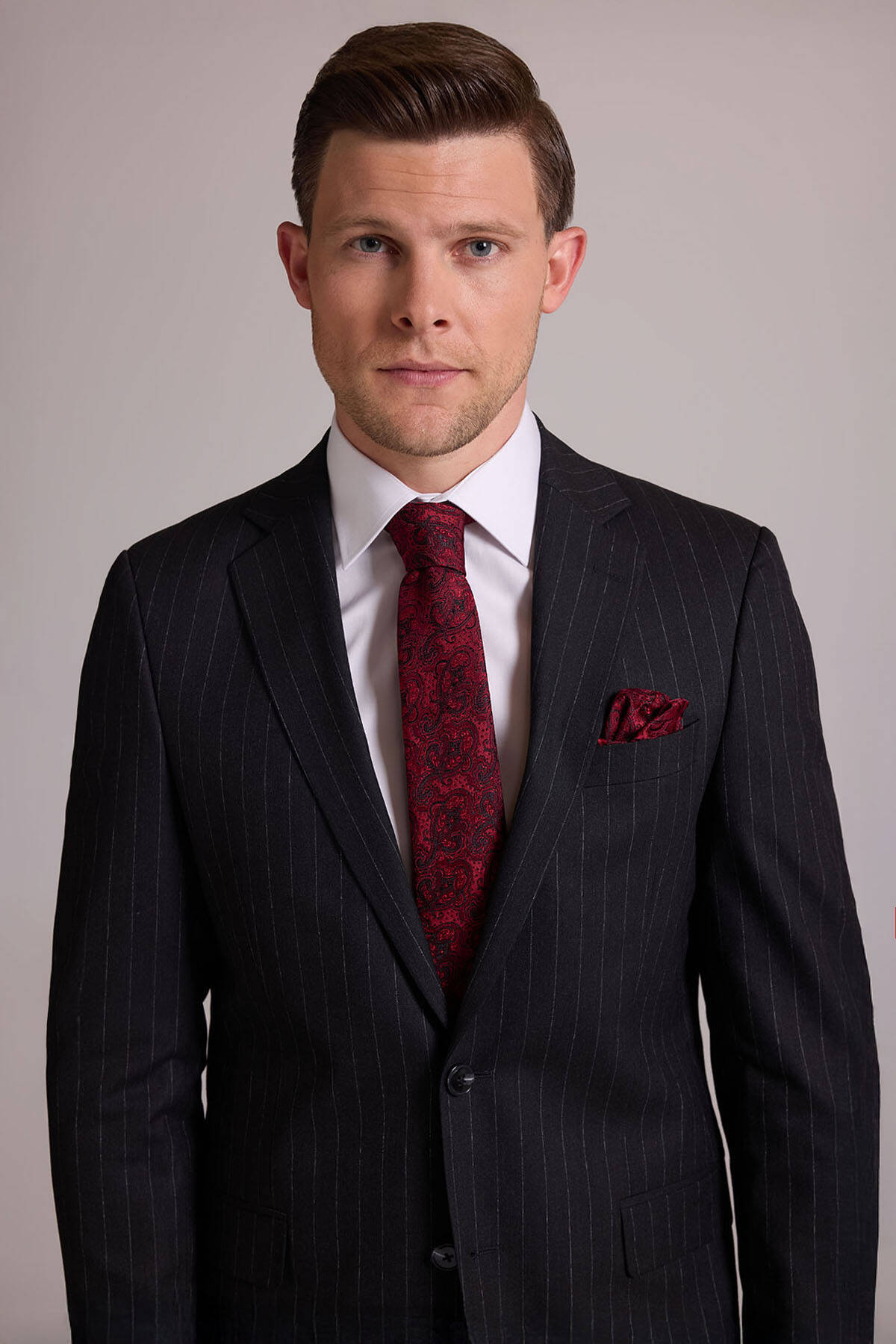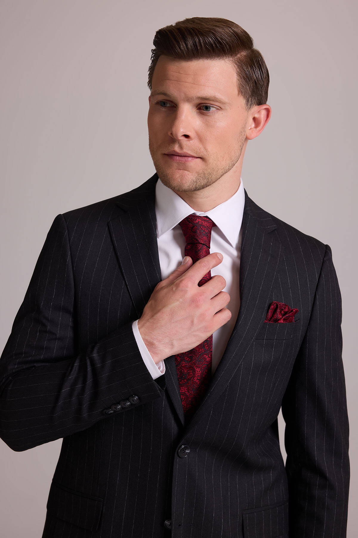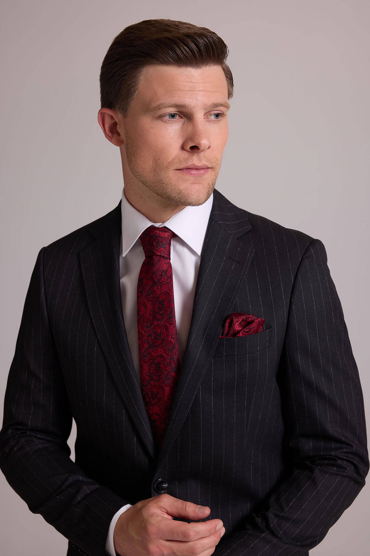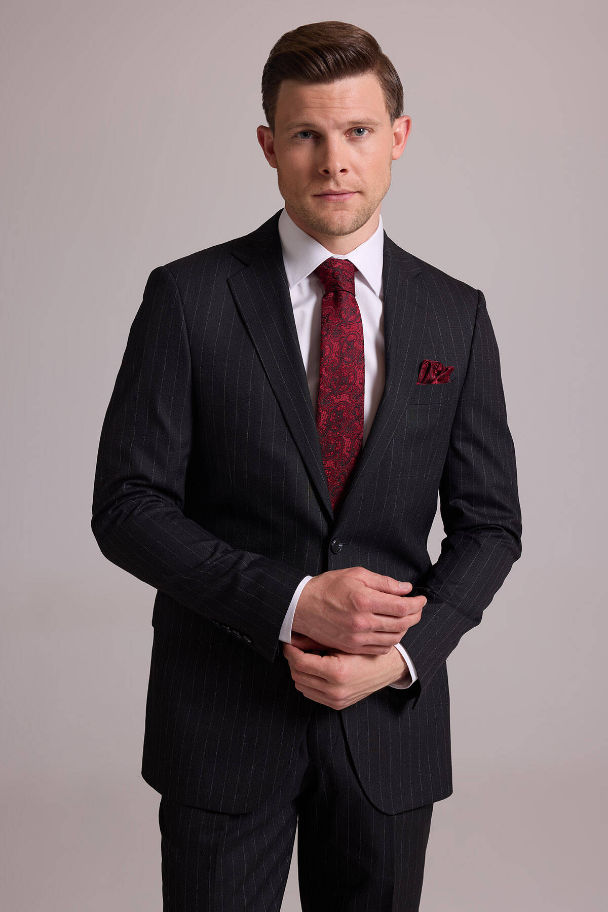 Bu resmi parça, modası asla geçmeyecek koyu gri çizgili bir stile sahiptir. Temel rengi ve zamansız deseni ile gerçek bir gardırop temeli olan takım elbise iş sunumlarından düğün ve şık yemeklere kadar tüm resmî durumlarda çabasızca stil sahibi görünmenizi sağlar. Çizgili takım elbise; beyaz klasik gömlek, siyah deri Oxford ayakkabı, gri tonlarda şal yaka kravat ve cep mendili ile kombinlemek üzere idealdir. YSF Giyim, kaliteli ve lüks takım elbise deneyimi yaşamak isteyen stil sahibi erkeklere özel ayrıcalıklı fiyatlar sunar. Siz de klasik detayları ve rafine tarzıyla öne çıkan takım elbise modellerini YSF Giyim fırsatları ile satın alarak imza bir stil oluşturabilir, tarzınızla kalabalıkların arasında öne çıkabilirsiniz!