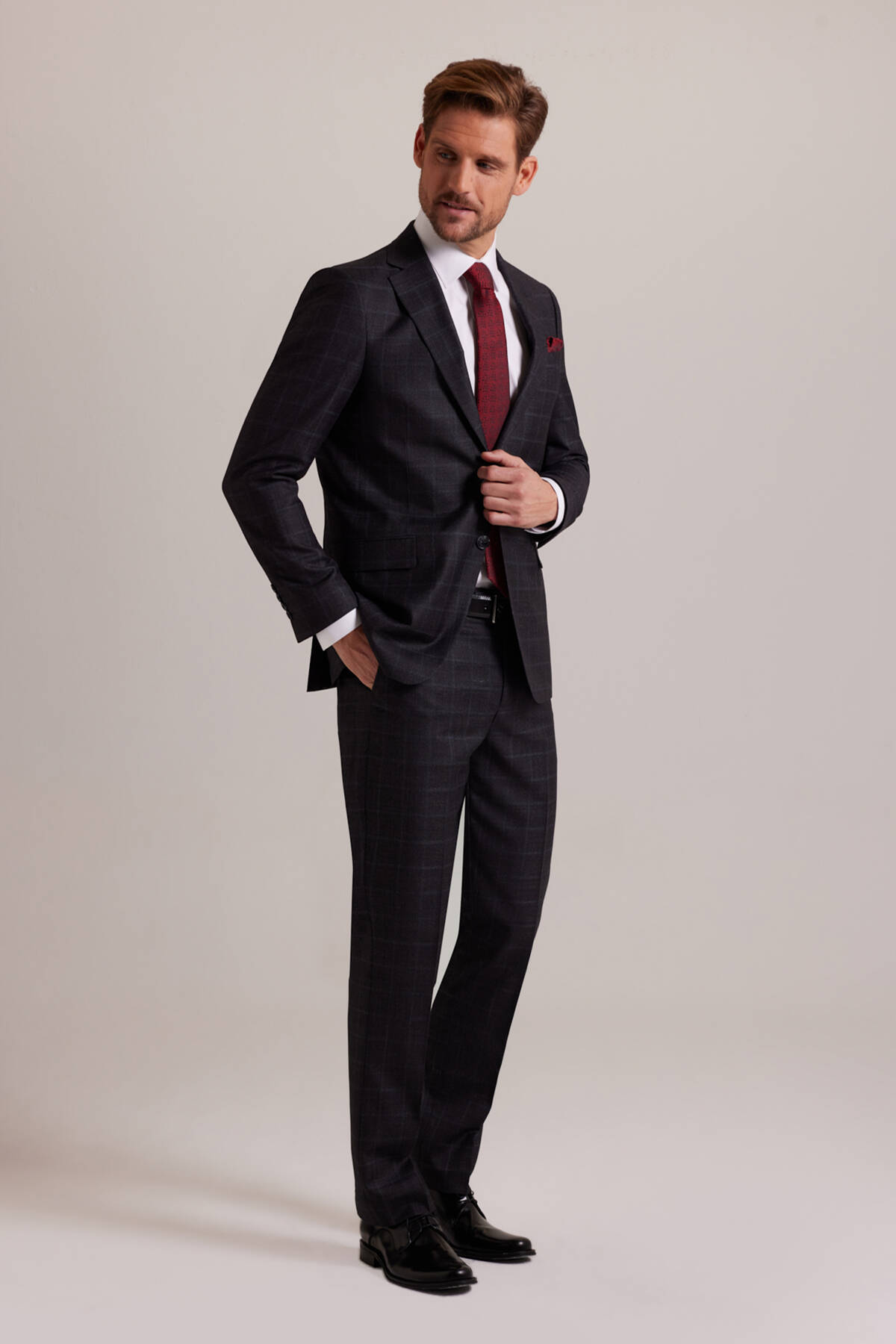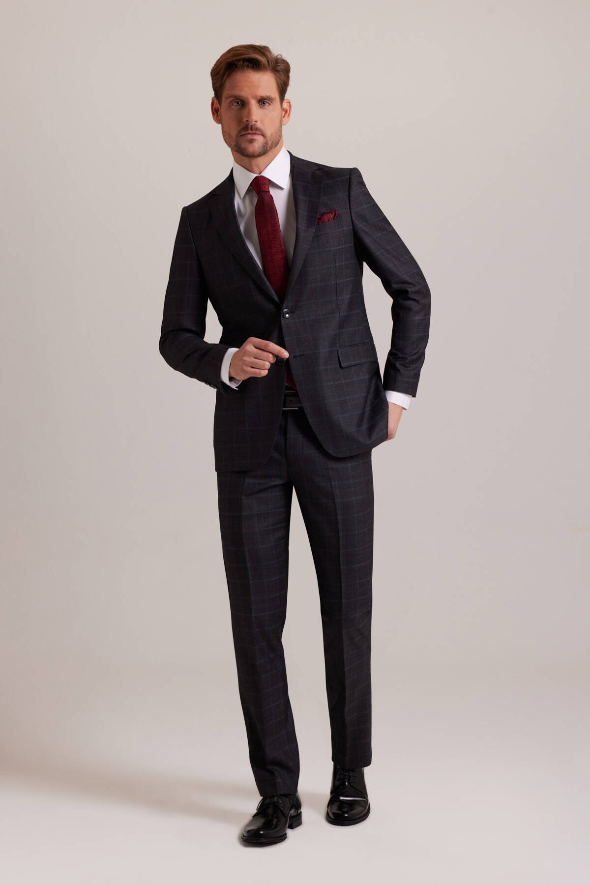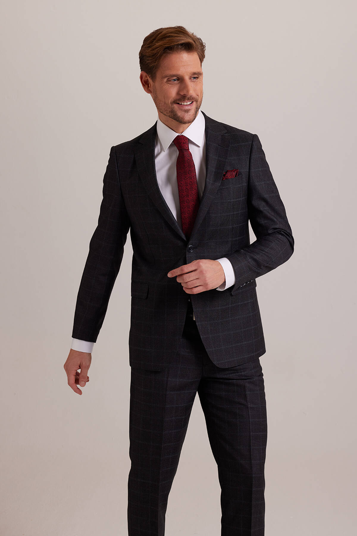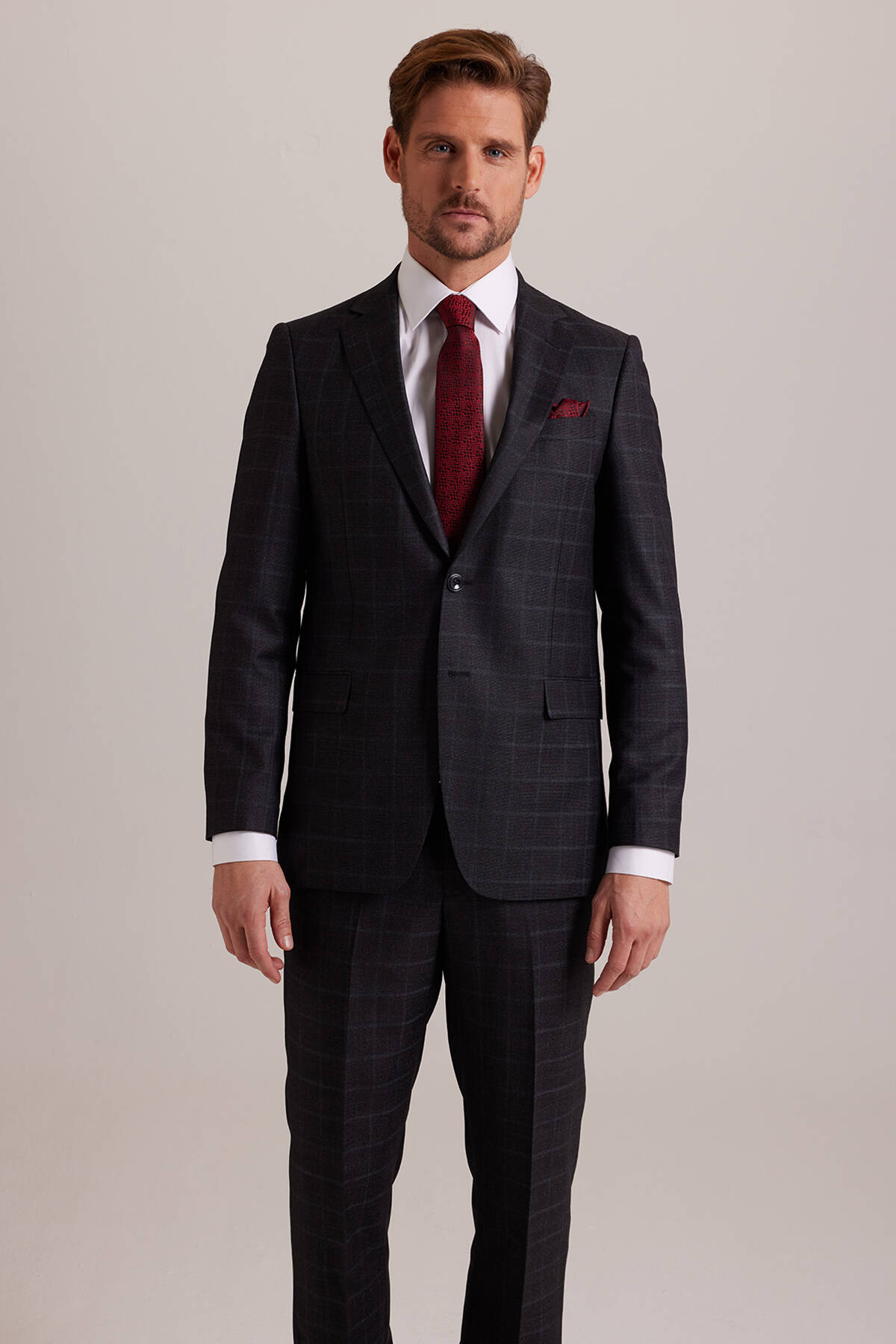 Erkek Koyu Gri Regular Fit Kareli Takım Elbise