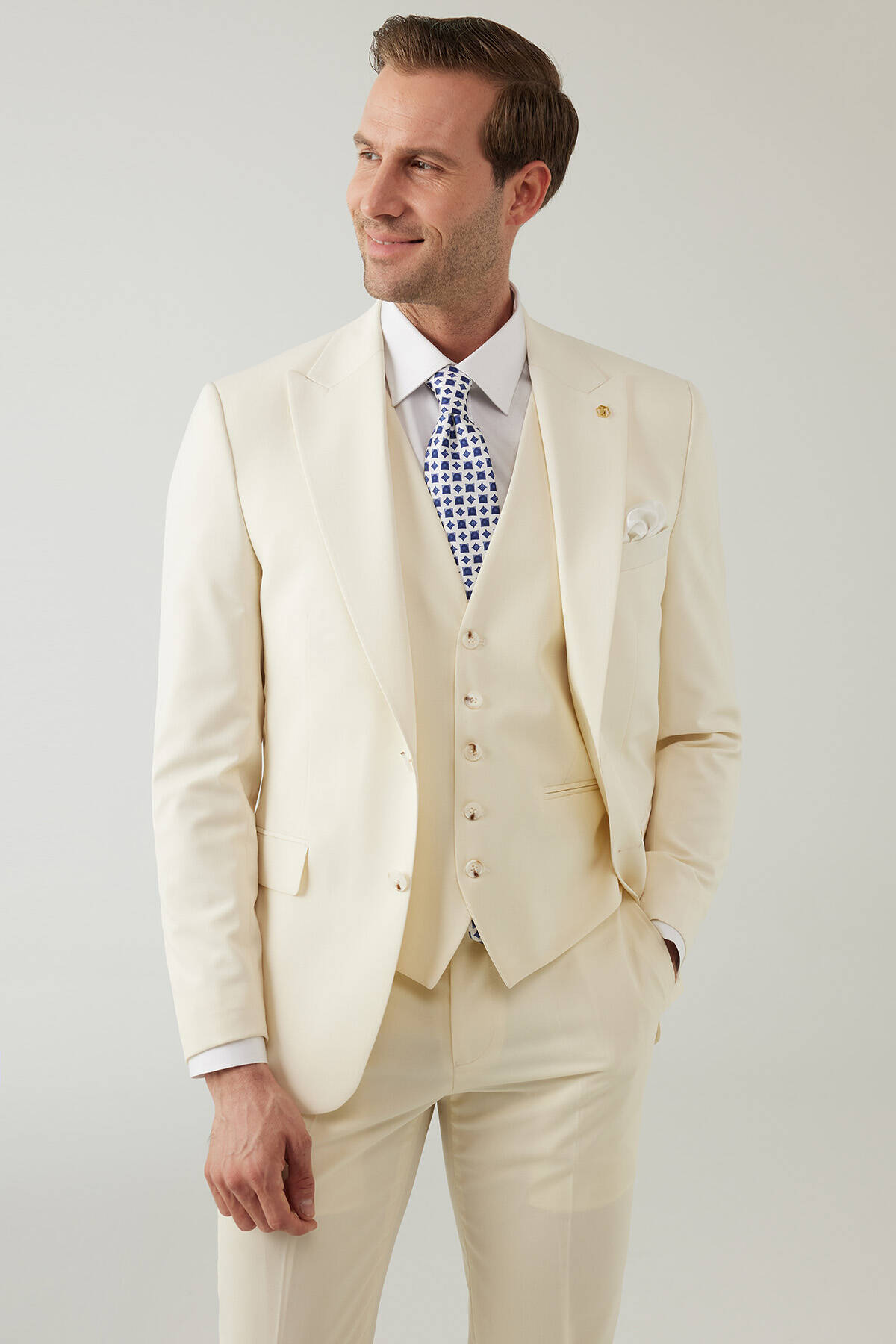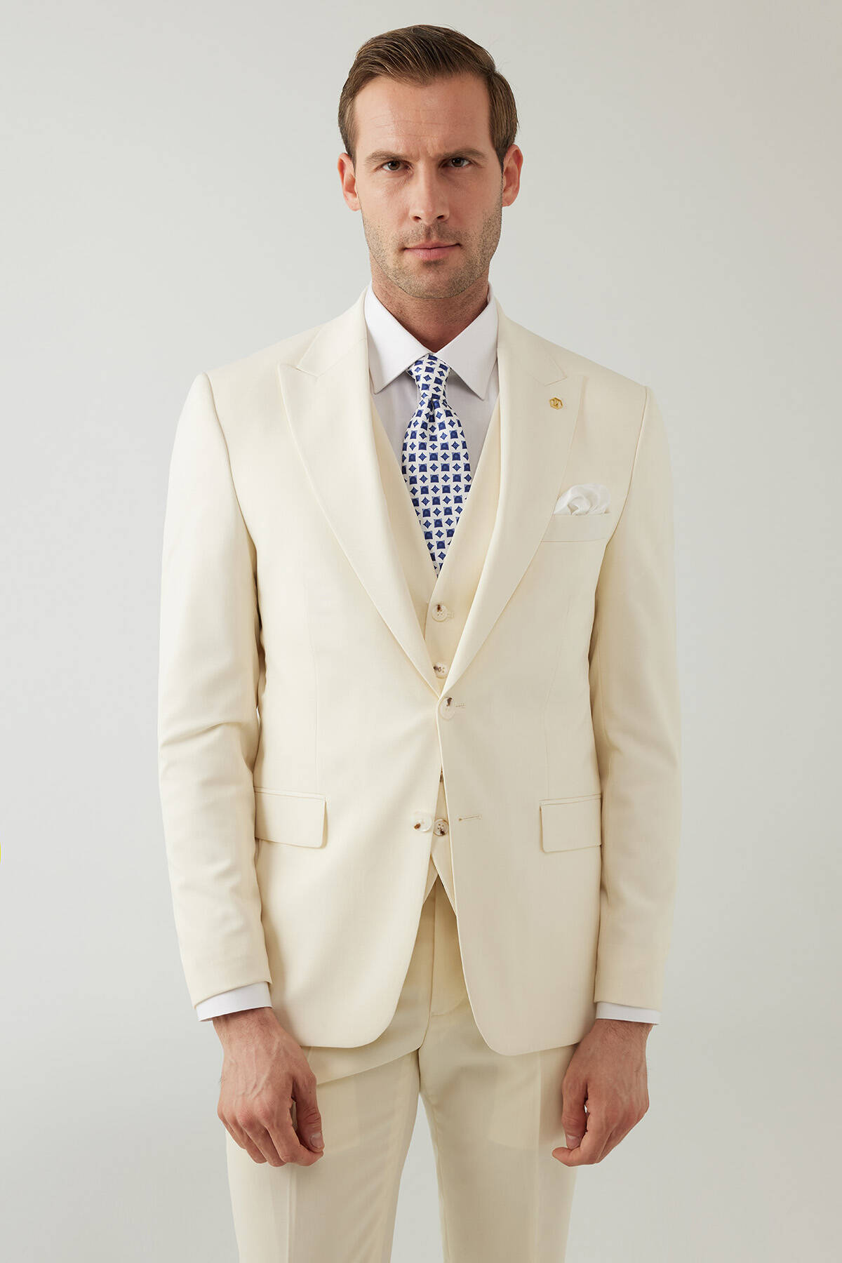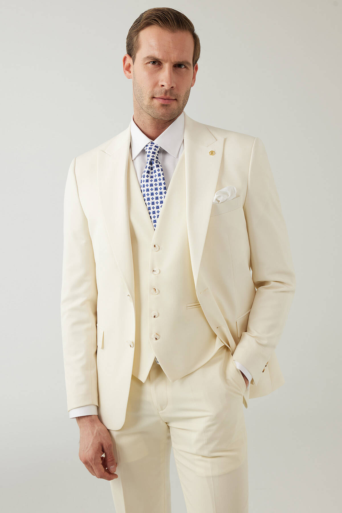 Erkek Krem Slim Fit %100 Yün Yelekli Sivri Yaka Takım Elbise