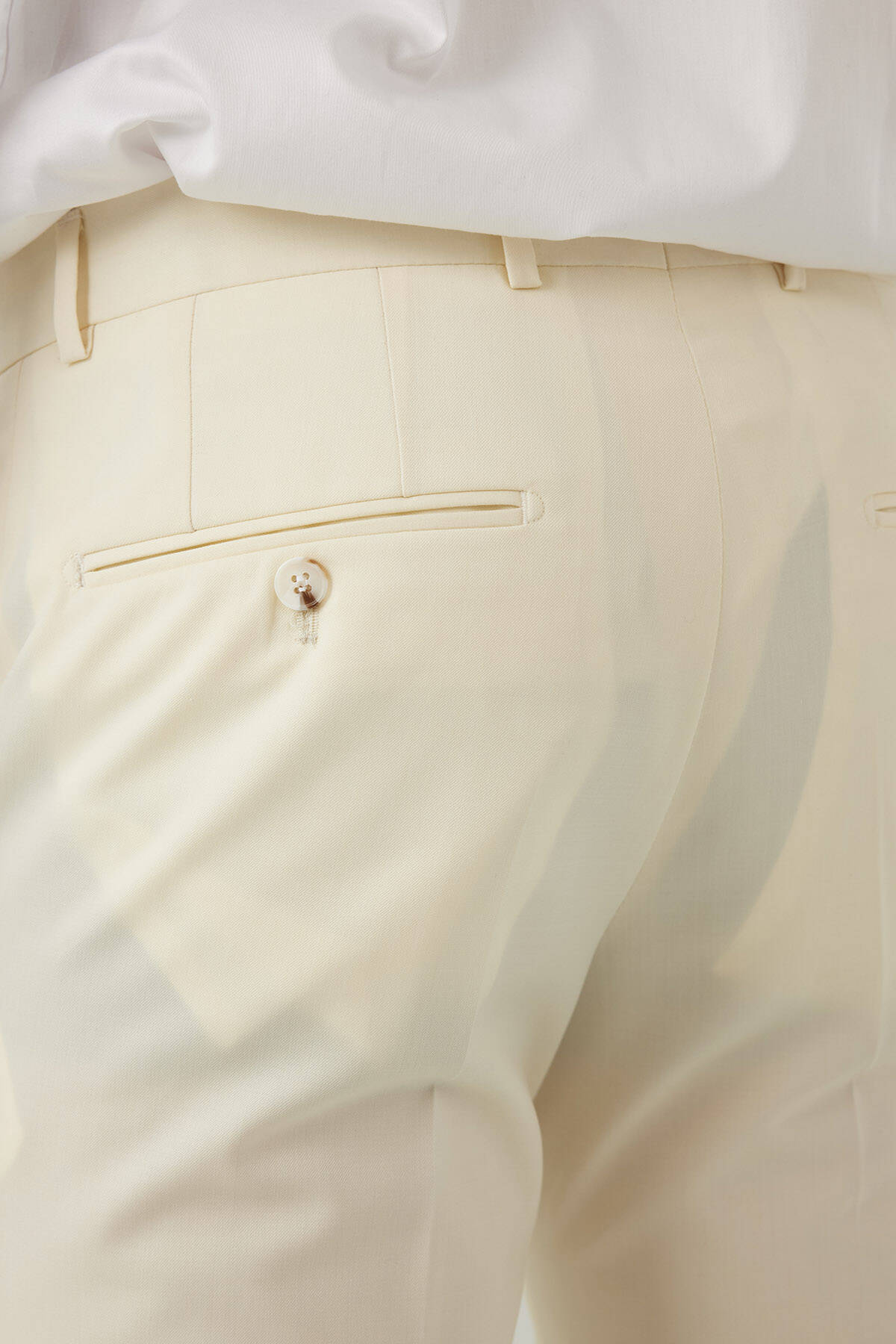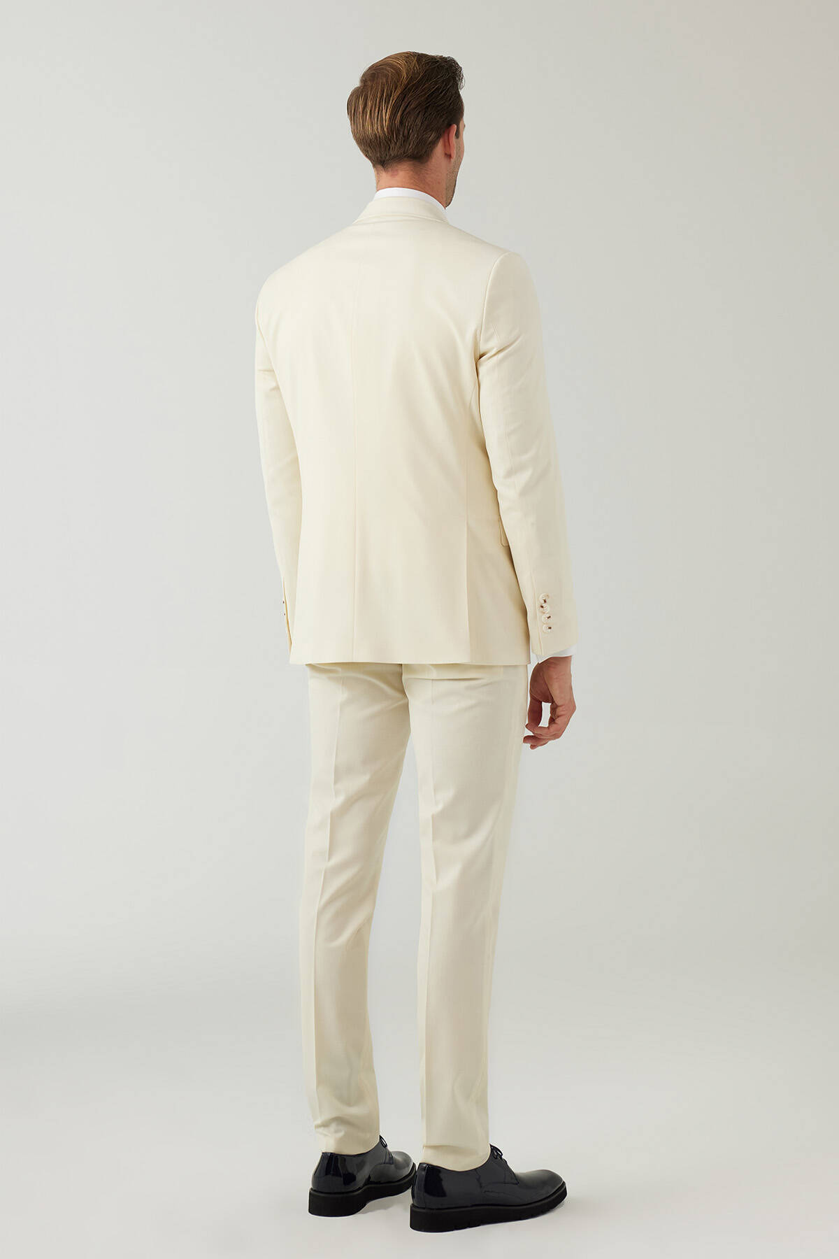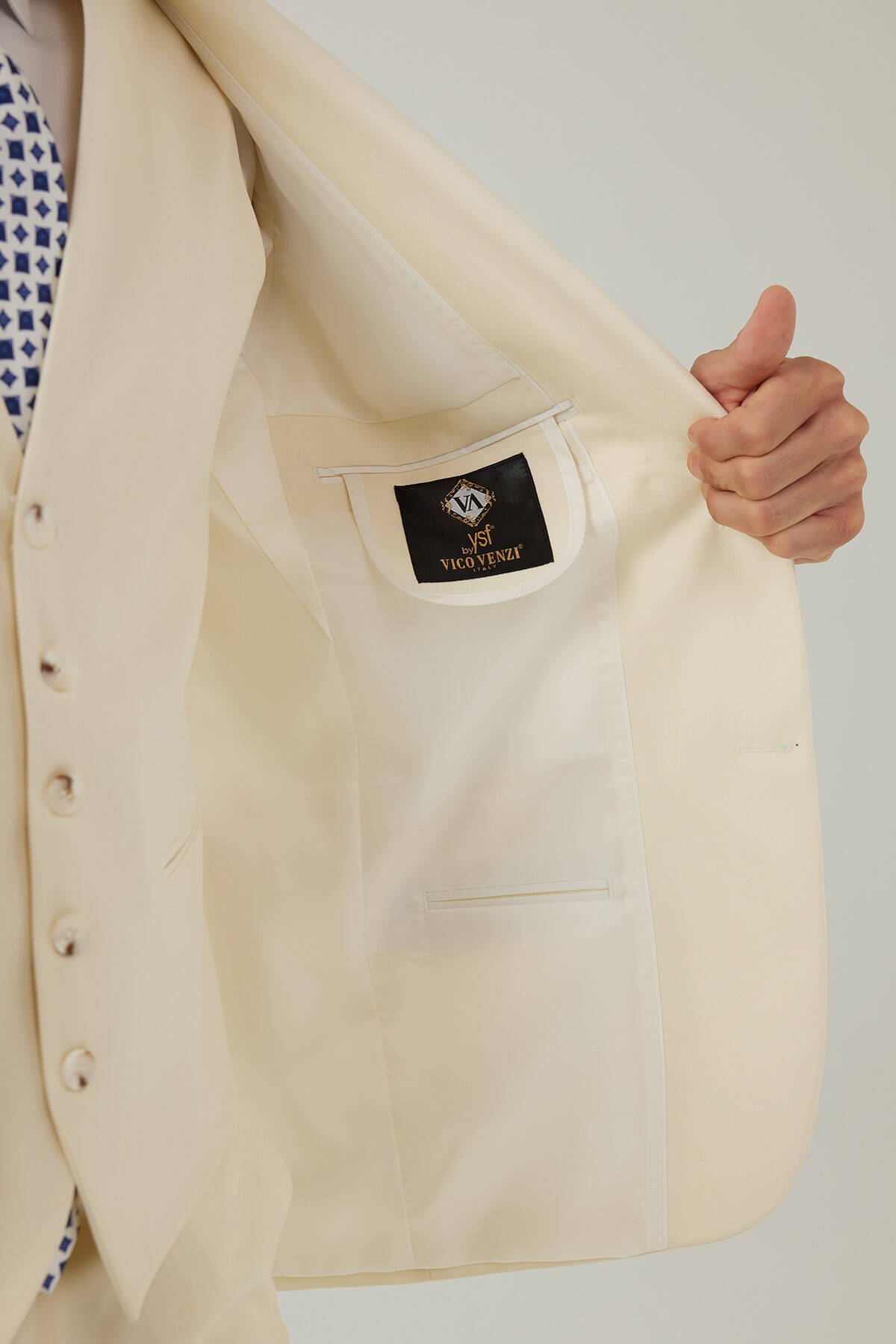 Erkek Krem Slim Fit %100 Yün Yelekli Sivri Yaka Takım Elbise