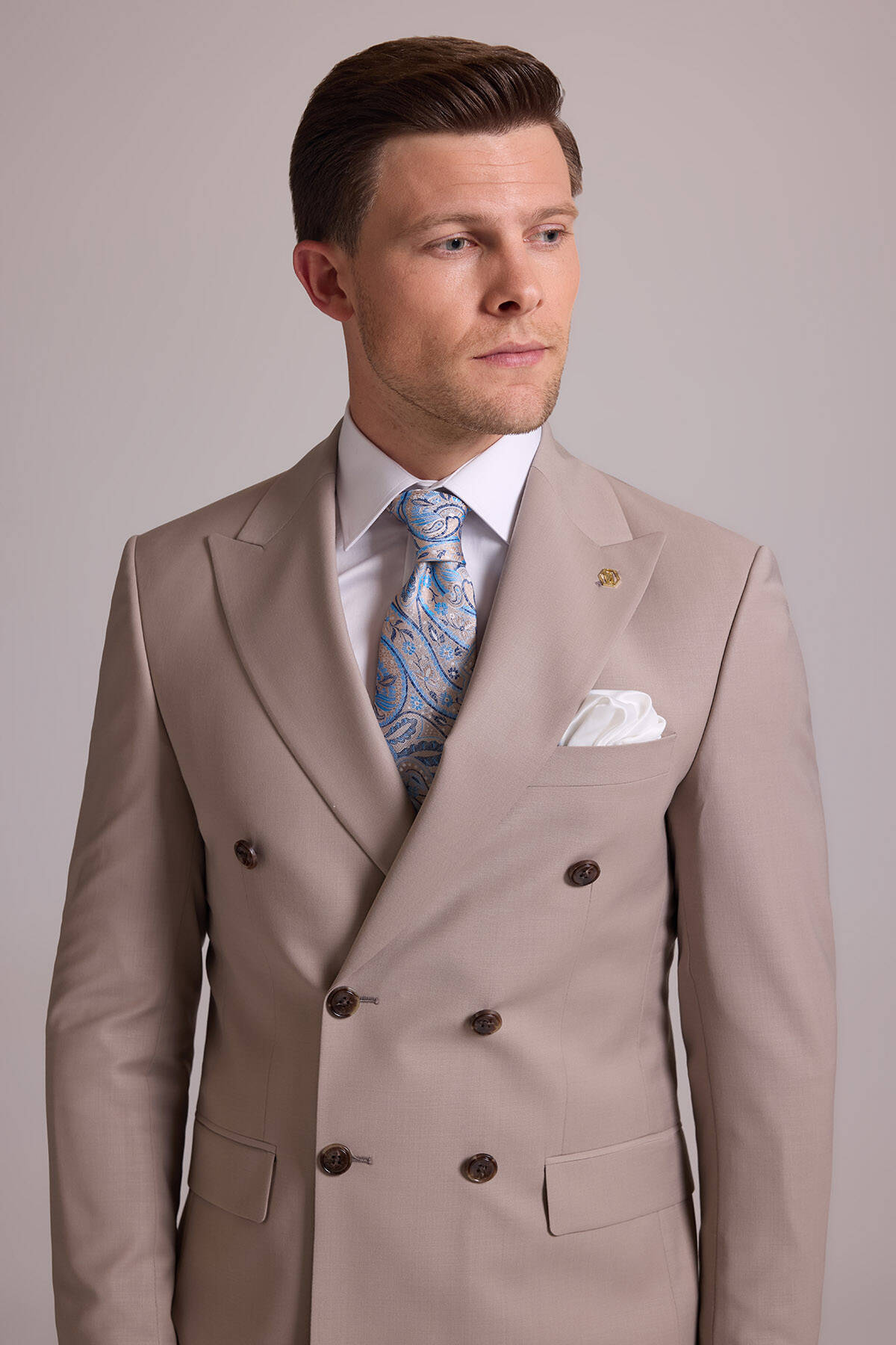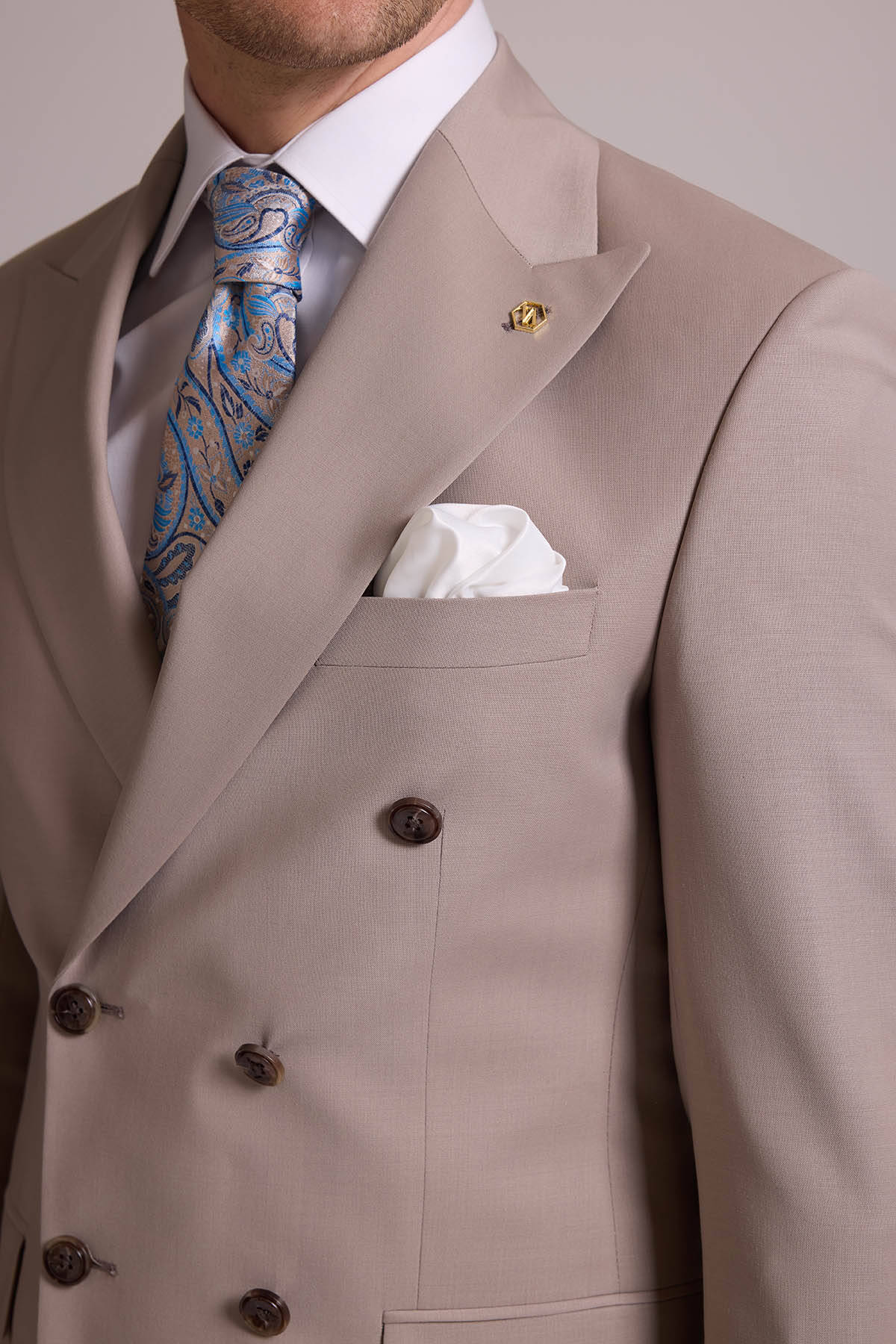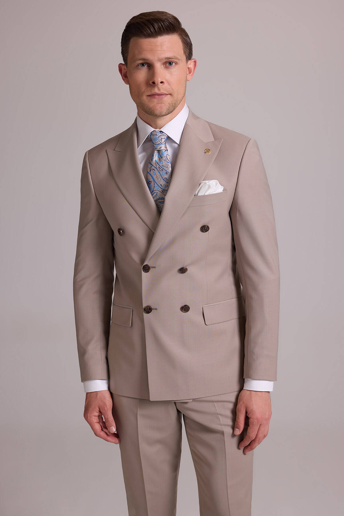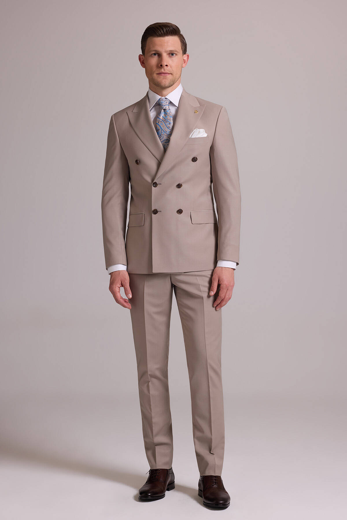 Erkek Krem Slim Fit Kruvaze %100 Yün Takım Elbise