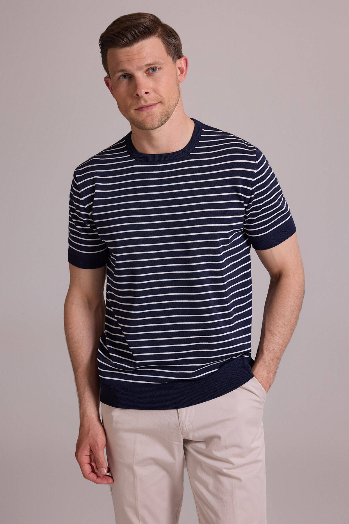 Erkek Lacivert Beyaz Regular Fit Bisiklet Yaka Çizgili Tişört