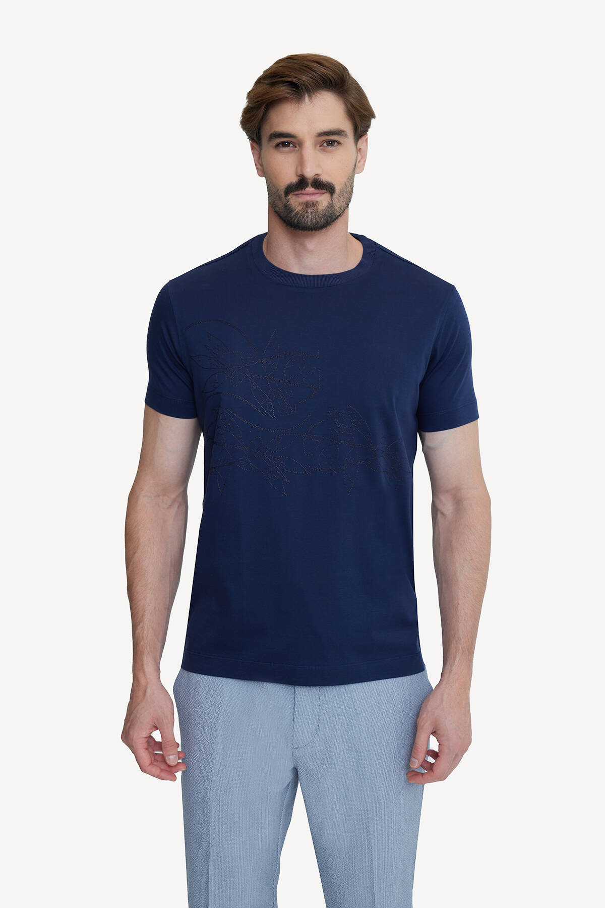 Erkek Lacivert Bisiklet Yaka Desenli Regular Fit Tshirt