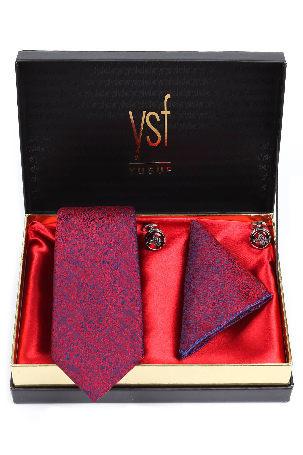 Erkek Lacivert Bordo Kravat Mendil Kol Düğmesi Set