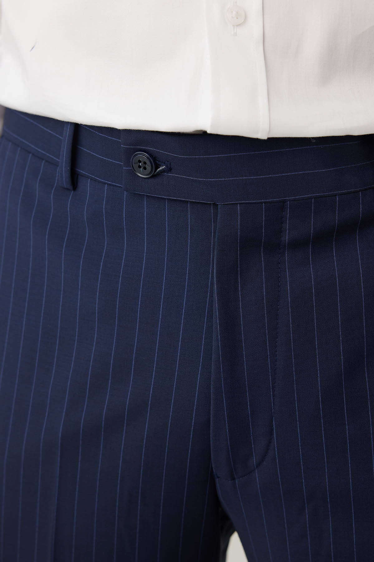 Erkek Lacivert Çizgili Regular Fit %100 Yünlü Mono Yaka Takım Elbise