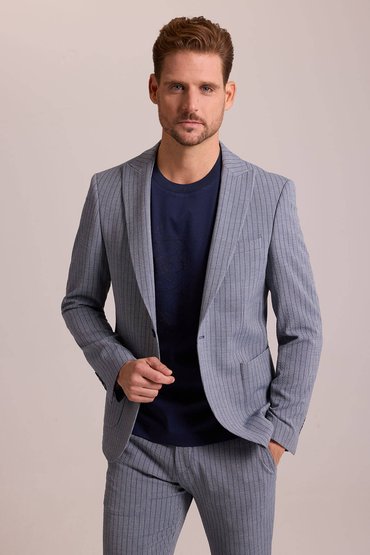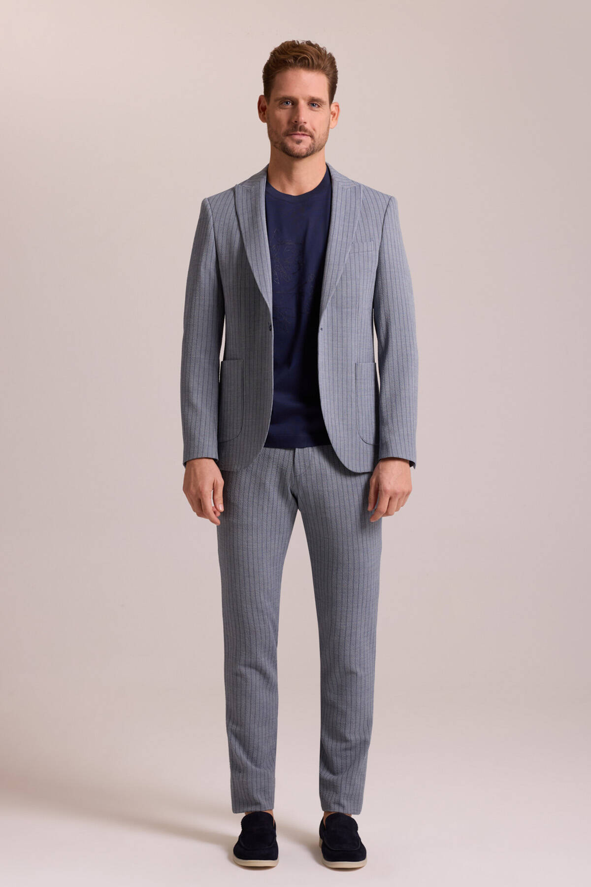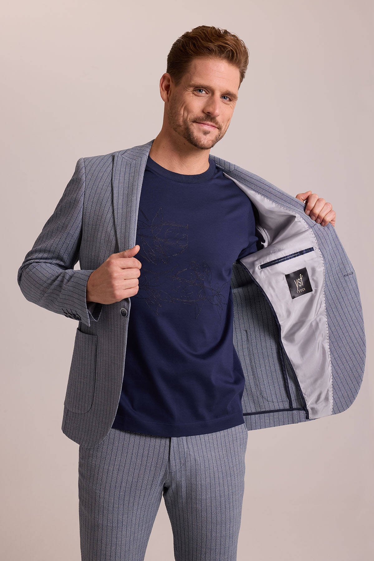 Erkek Lacivert Çizgili Regular Fit Beli Lastikli Mono Yaka Takım Elbise