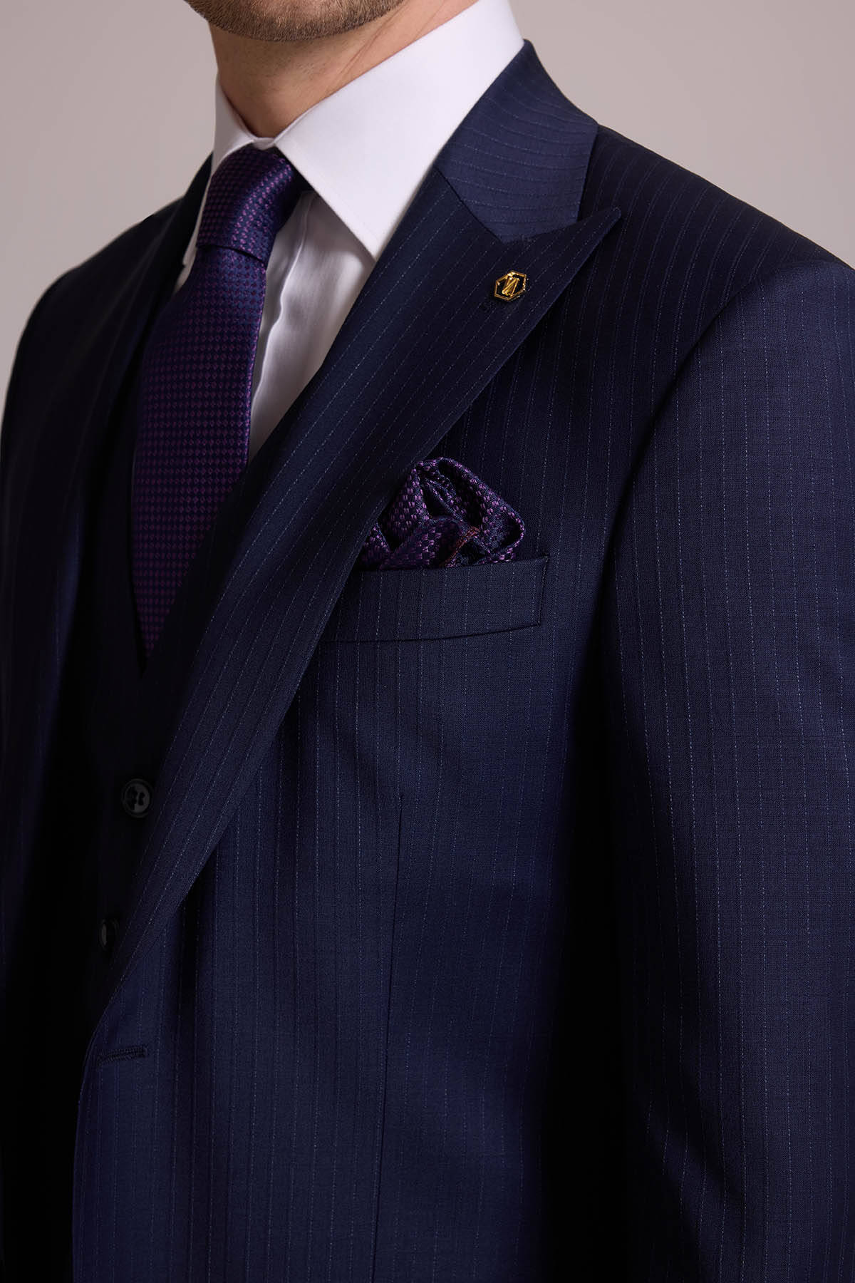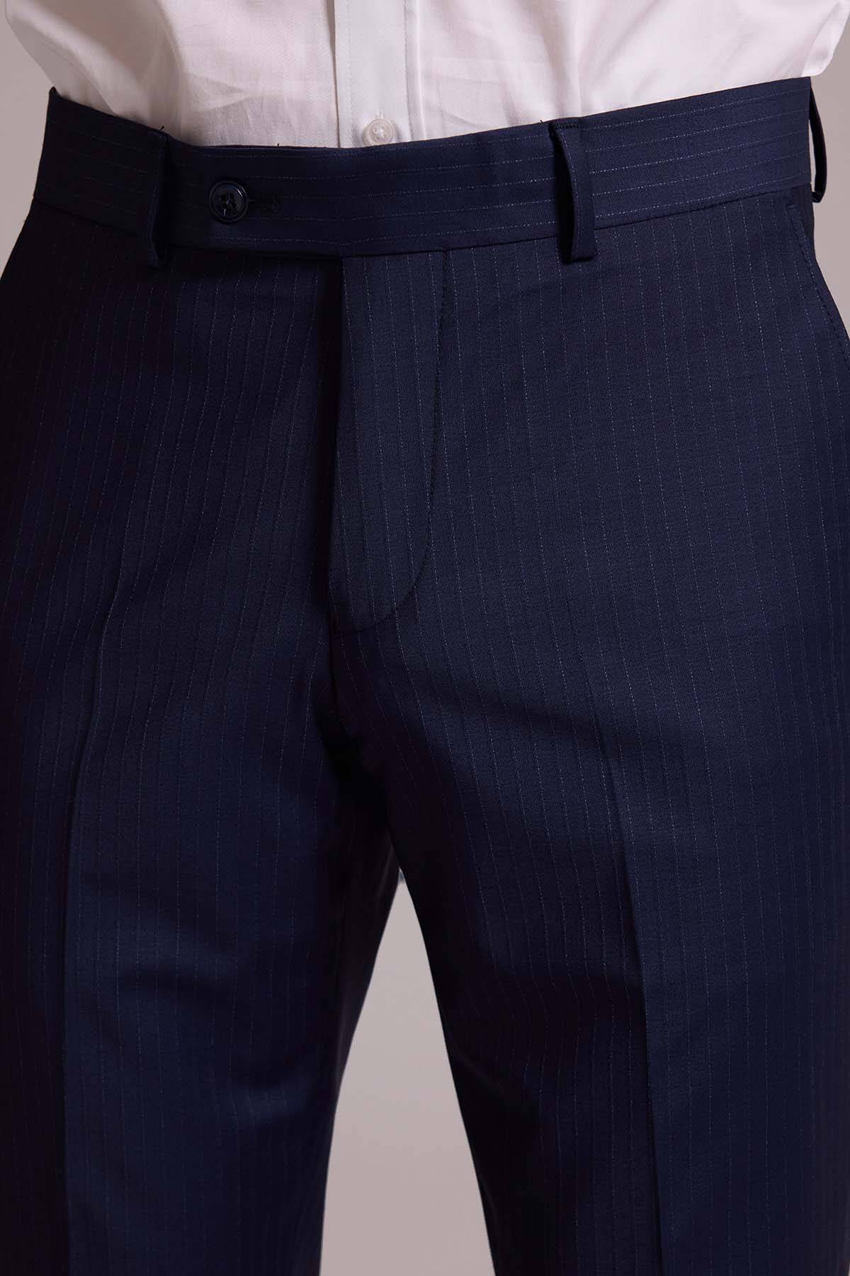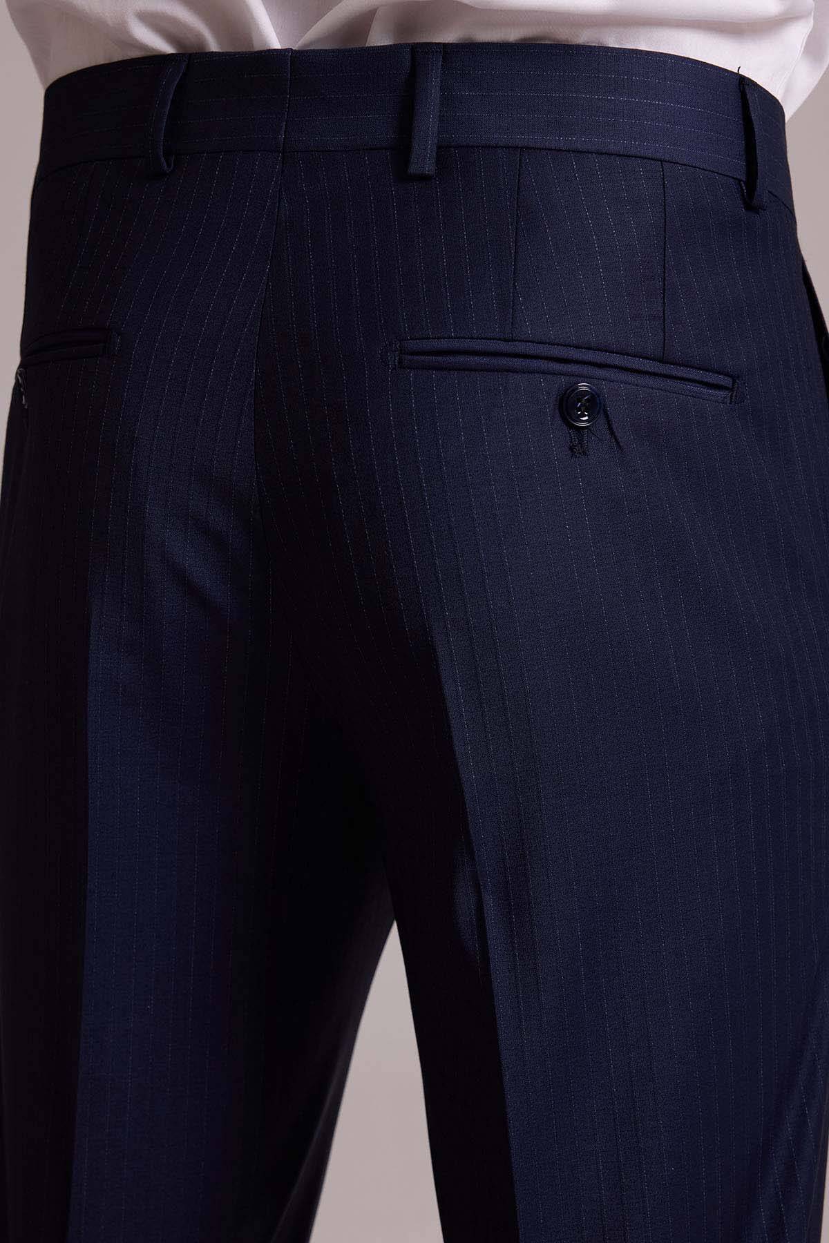 Erkek Lacivert Çizgili Slim Fit Yelekli Kırlangıç Yaka Takım Elbise