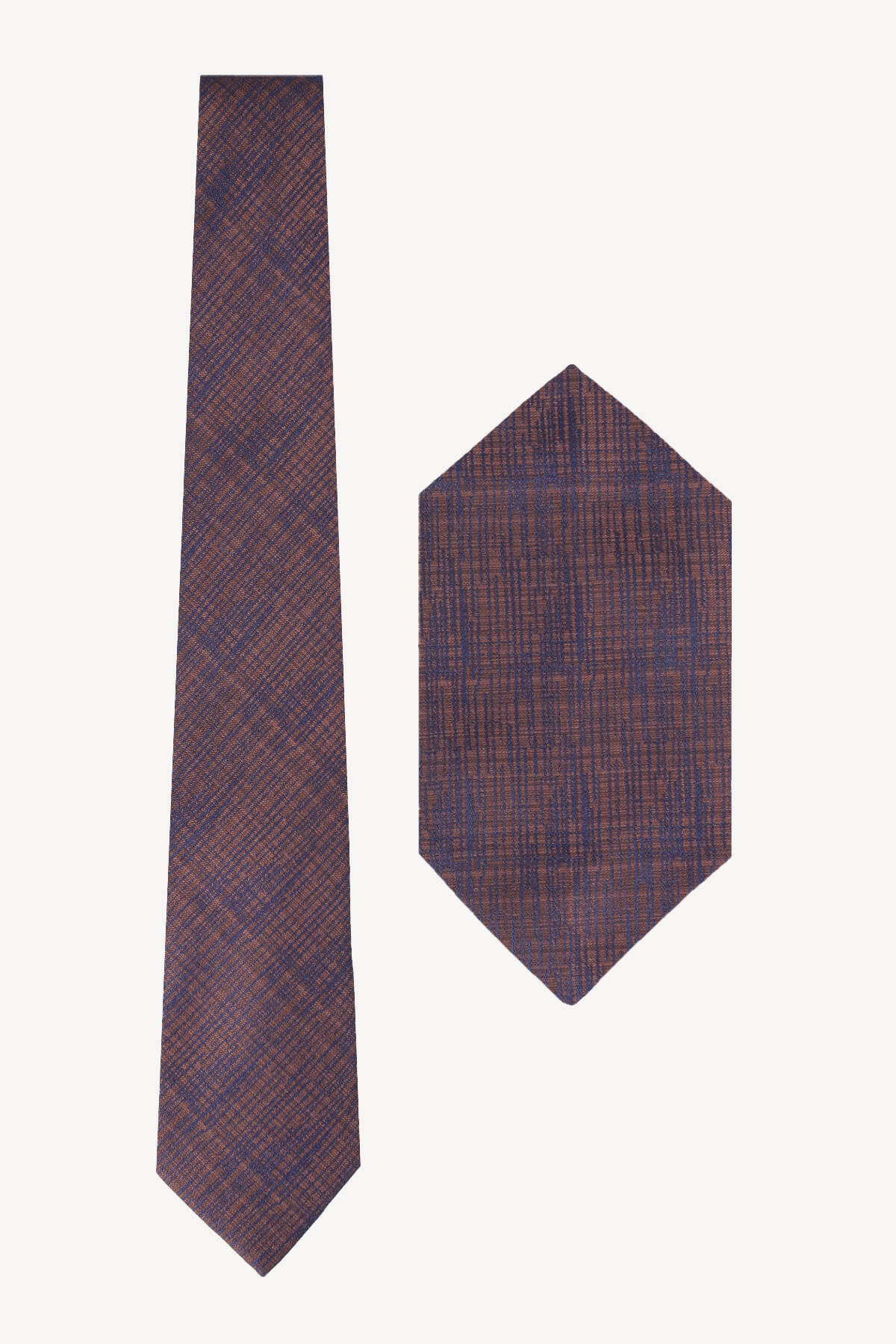 Erkek Lacivert Kahve Desenli Kravat Mendil Set