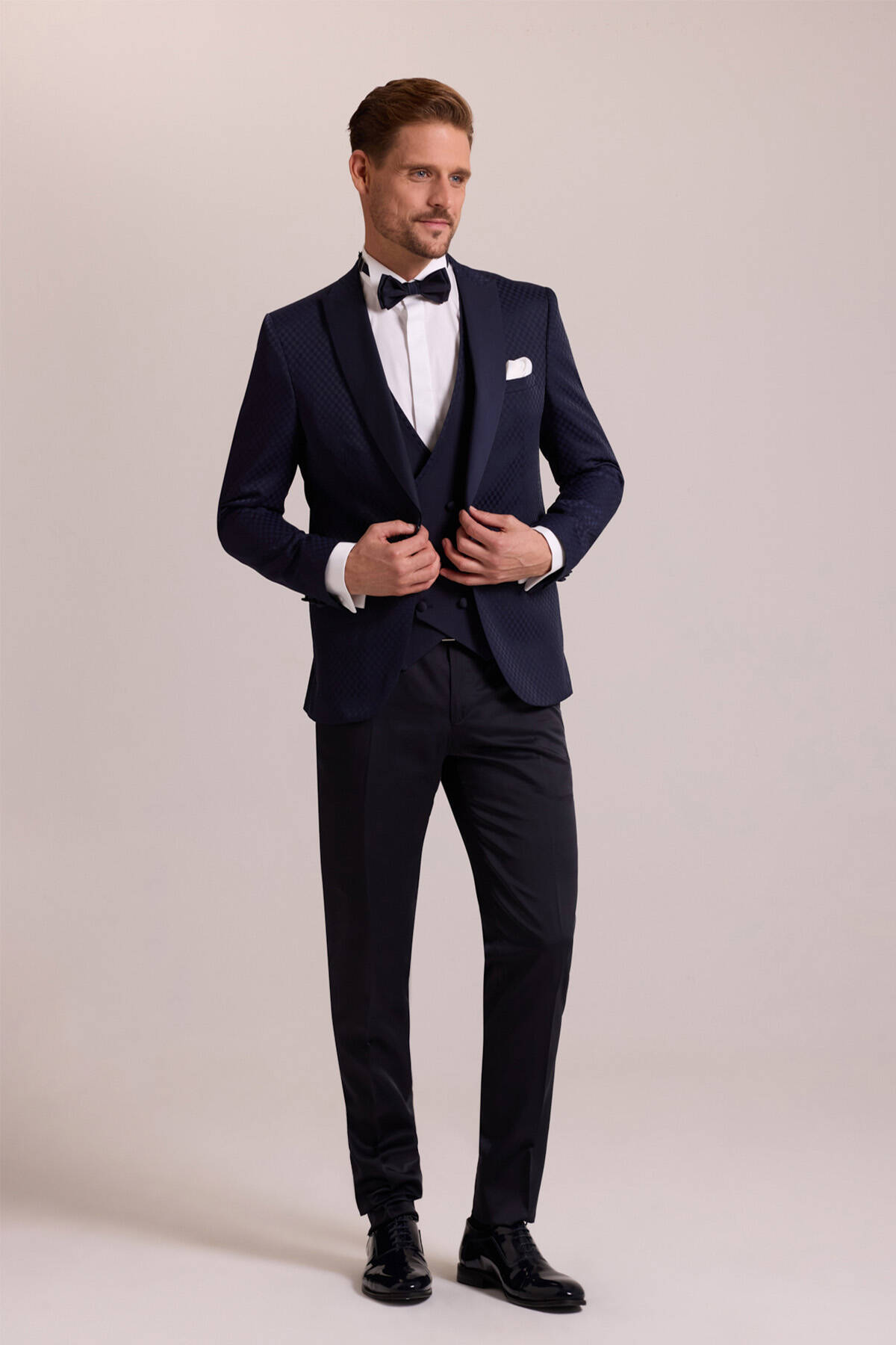 Gelince Haber VerYSF Giyim’in hassas terzilik becerilerini yansıtan Erkek Lacivert Kırlangıç Yaka Yelekli Desenli Slim Fit Damatlık, hem klasik hem de çağdaş estetiği ile dikkat çeker. İnce detaylarla tasarlanan bu özel model, üç parçalı yapısıyla baştan aşağı stil sunar. Çağdaş esintilere sahip şık bir silüet için slim fit olarak tasarlanmıştır. Kırlangıç yaka kesimi smokinin klasik çizgilerini en iyi şekilde yansıtır. Ceketin tek yırtmaç ayrıntıları ise incelikli terzilik estetiğini yakalayarak düğün veya resmî davetlere çekici bir tarz katar. Yelekli damatlık dar kesim silüeti ve desenli dokusuyla bir sonraki özel güne veya etkinliğe damganızı vurmanızı sağlar.