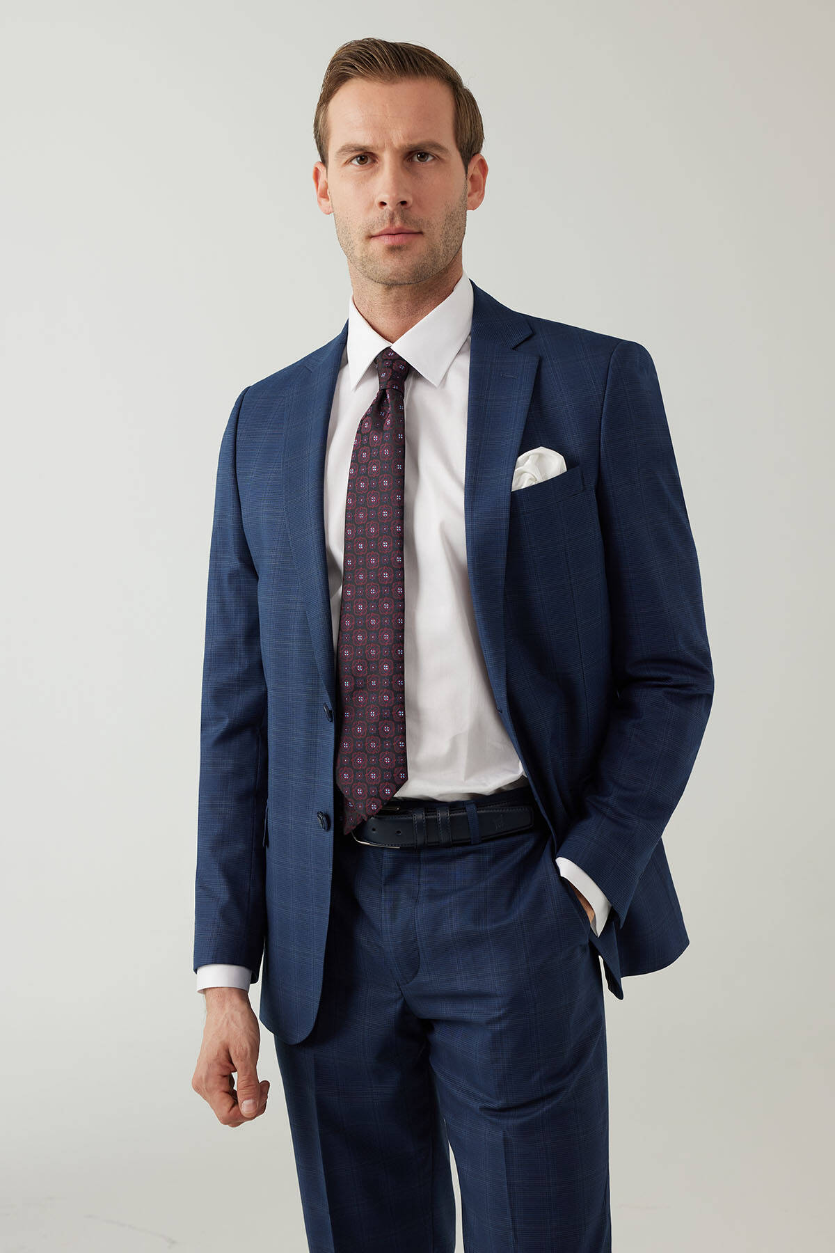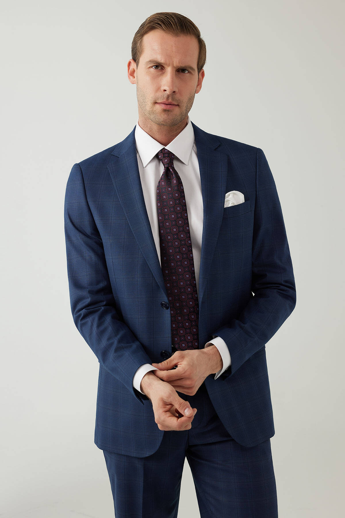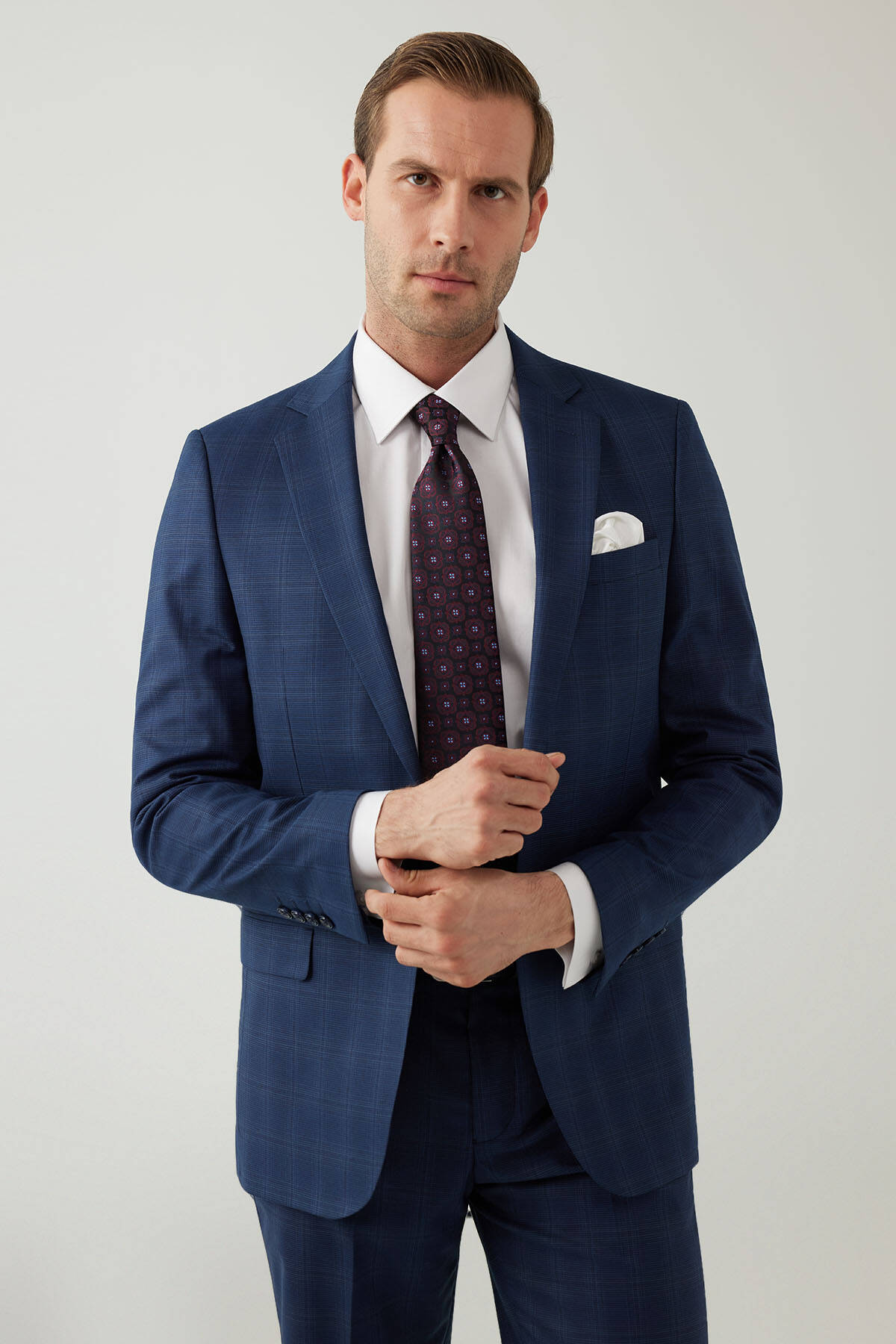Lacivert renk üzerine yerleştirilen kareli deseni sayesinde zamansız bir görünüme sahip iki parçalı takım, uzun yıllar resmî giyim stilinizin imza parçası olabilir. Zahmetsiz şekilde şık ve elegan bir tarza sahip olmak için lacivert kareli takım; beyaz klasik gömlek, lacivert rugan ayakkabı, aynı tonlarda kravat ve beyaz cep mendili ile kombinlenebilir. YSF Giyim stil sahibi erkekler için asla modası geçmeyecek lüks ve seçkin takım elbise modellerini en iyi fiyat alternatifleri ile sunar. Siz de iş toplantısından düğünlere kadar tüm resmî ortamlarda karizmatik ve maskulen bir şıklığa ulaşmak için en kaliteli takım elbise modellerini YSF Giyim ayrıcalıkları ile hemen seçebilirsiniz!