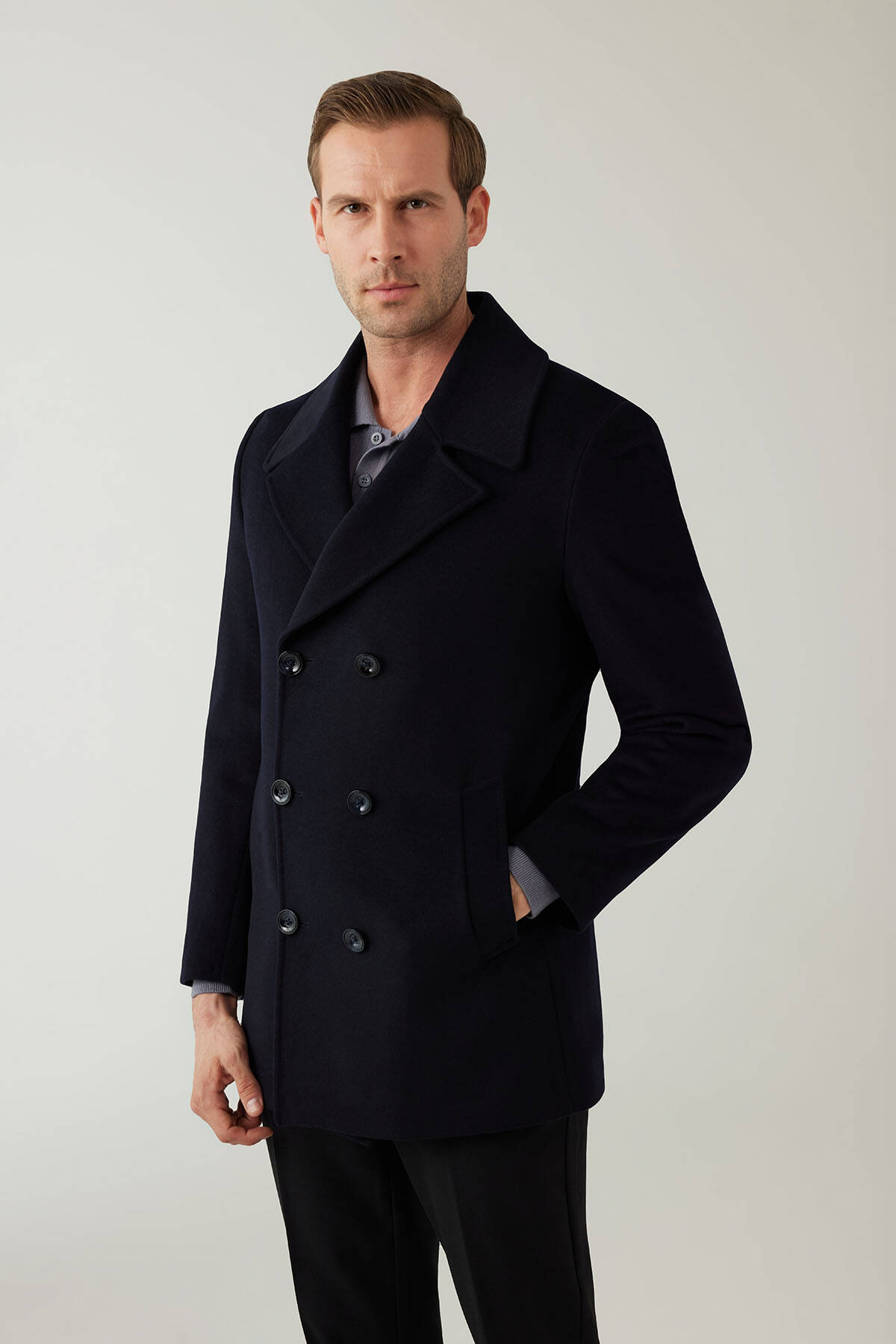 Gelince Haber VerYSF Giyim’in hassas terzilik becerilerini yansıtan Erkek Lacivert Regular Fit Kırlangıç Yaka Kaban, hem ofis hem de günlük yaşam için zarif bir katman rolü üstlenir. Lüks ve sıcak hissettiren bir doku için kaşmir ve yün karışımlı malzemelerden oluşur. Kruvaze kesimi ve kırlangıç yaka formu sayesinde akıllı ve şık görünümü mükemmel bir şekilde tamamlar. Açık slip cepler temel ihtiyaçlarınız için geniş bir alan sağlarken aynı zamanda soğuklarda ellerinize ekstra koruma sağlar. Kabanın maskülen kesimine eşlik eden regular fit kalıp ise katmanlama için idealdir.