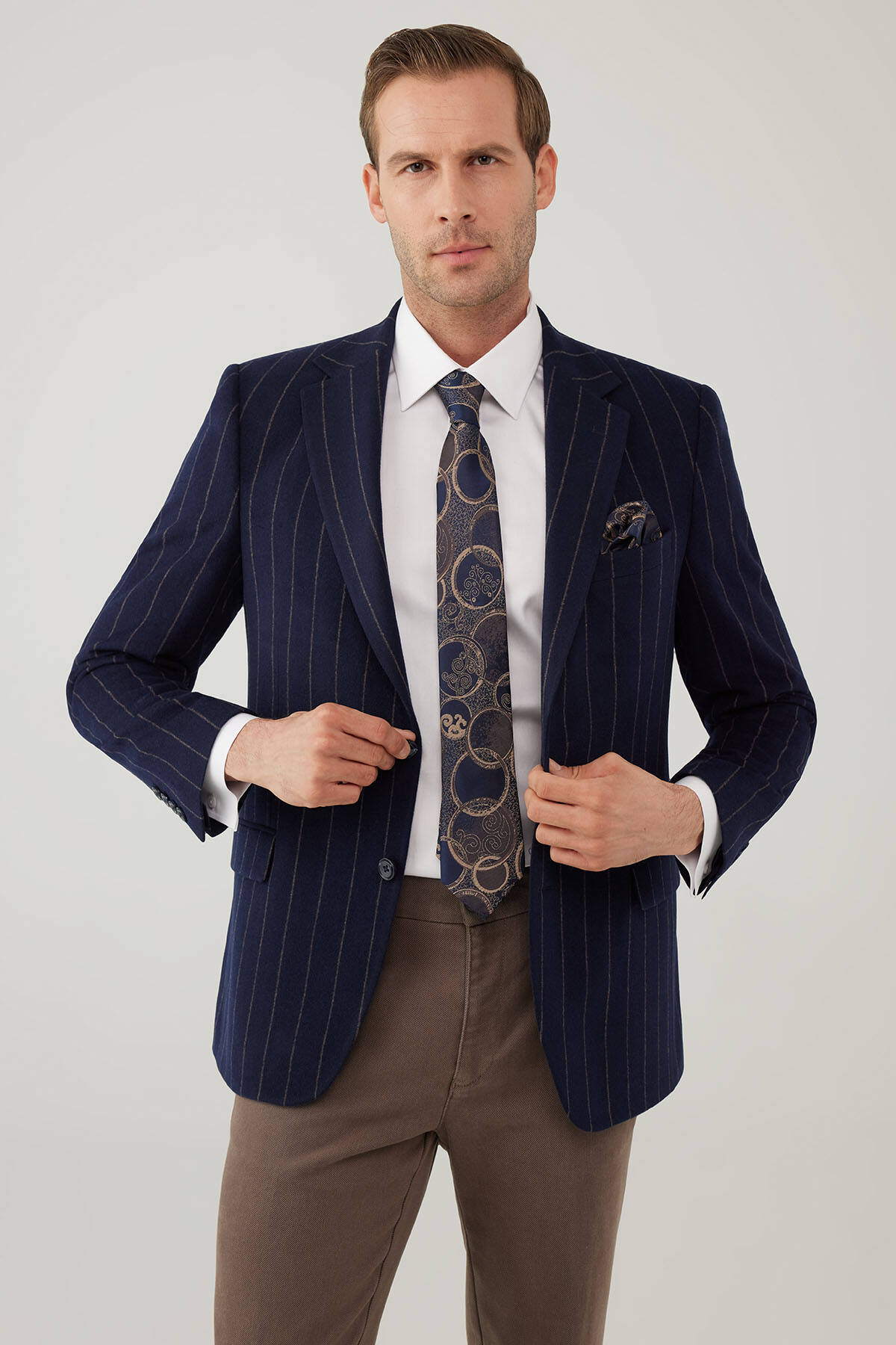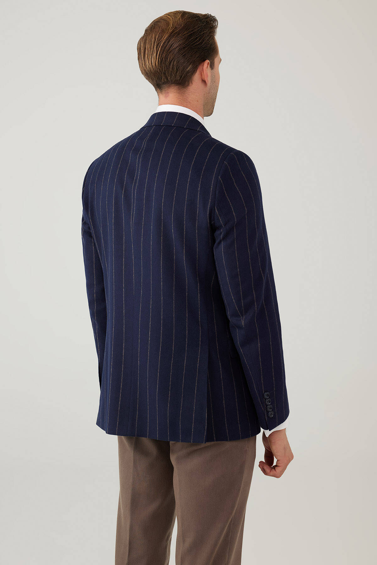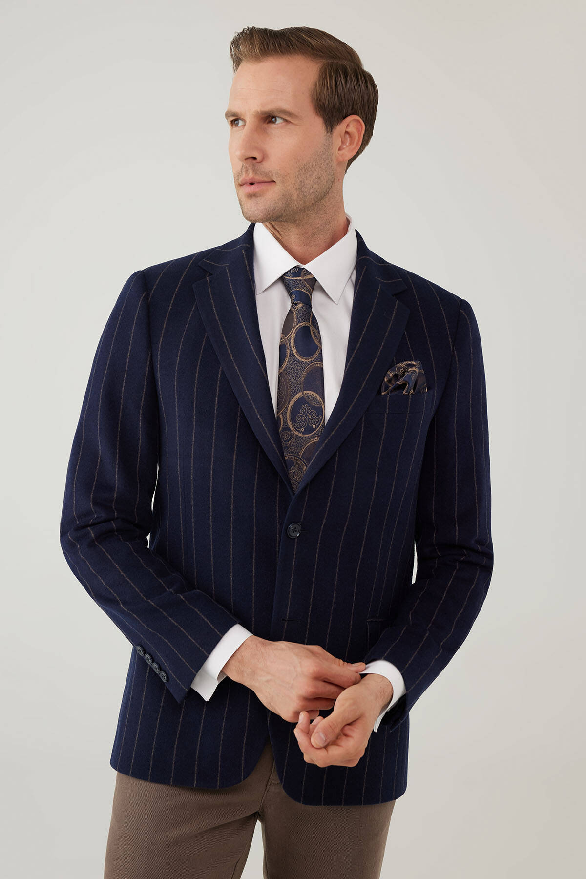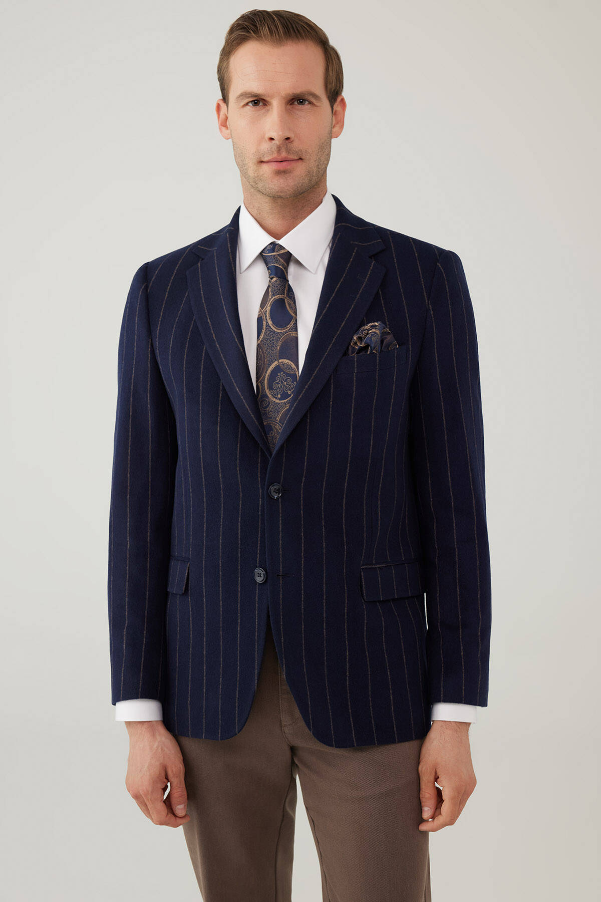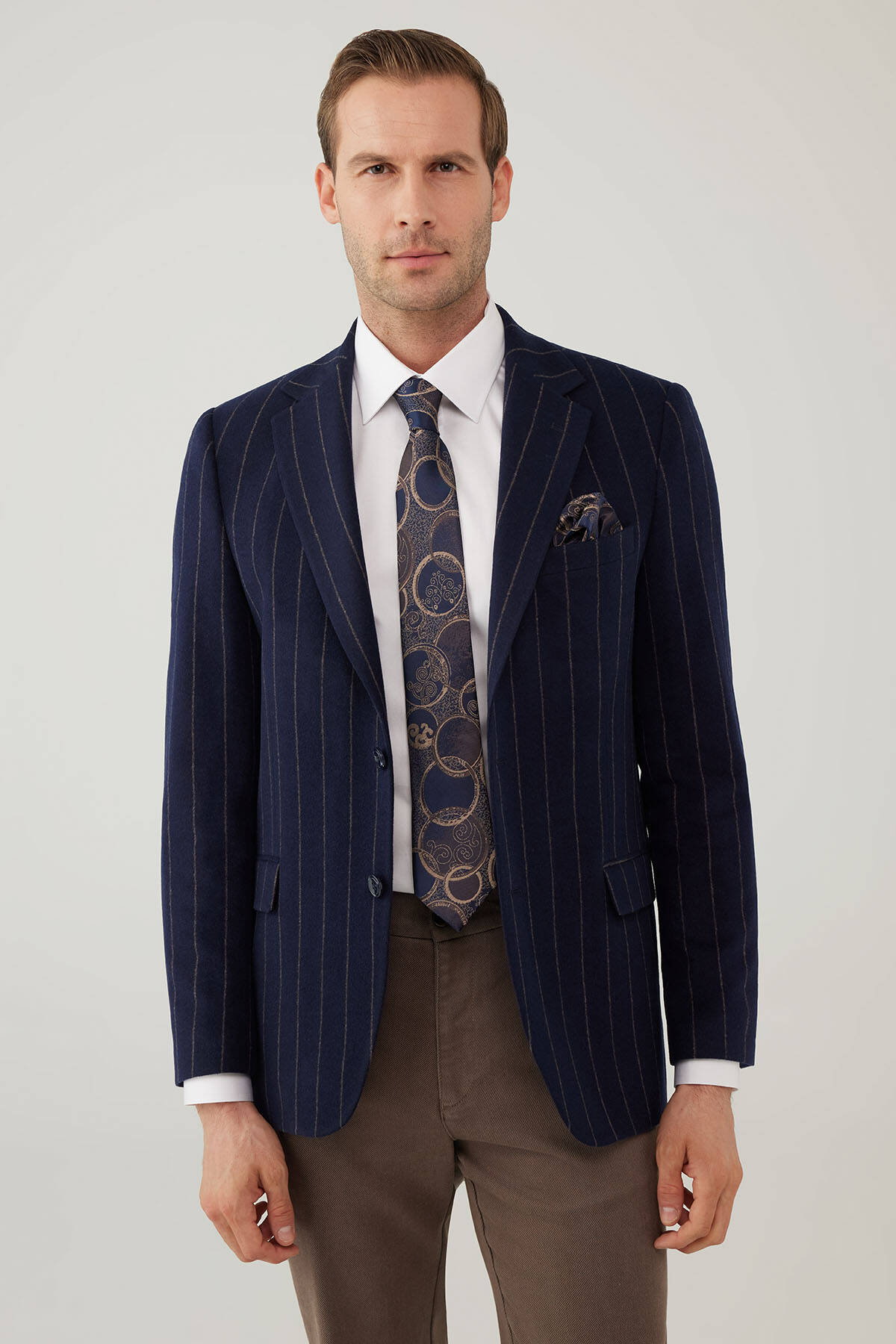 Erkek Lacivert Regular Fit Mono Yaka Çizgili Yün Ceket