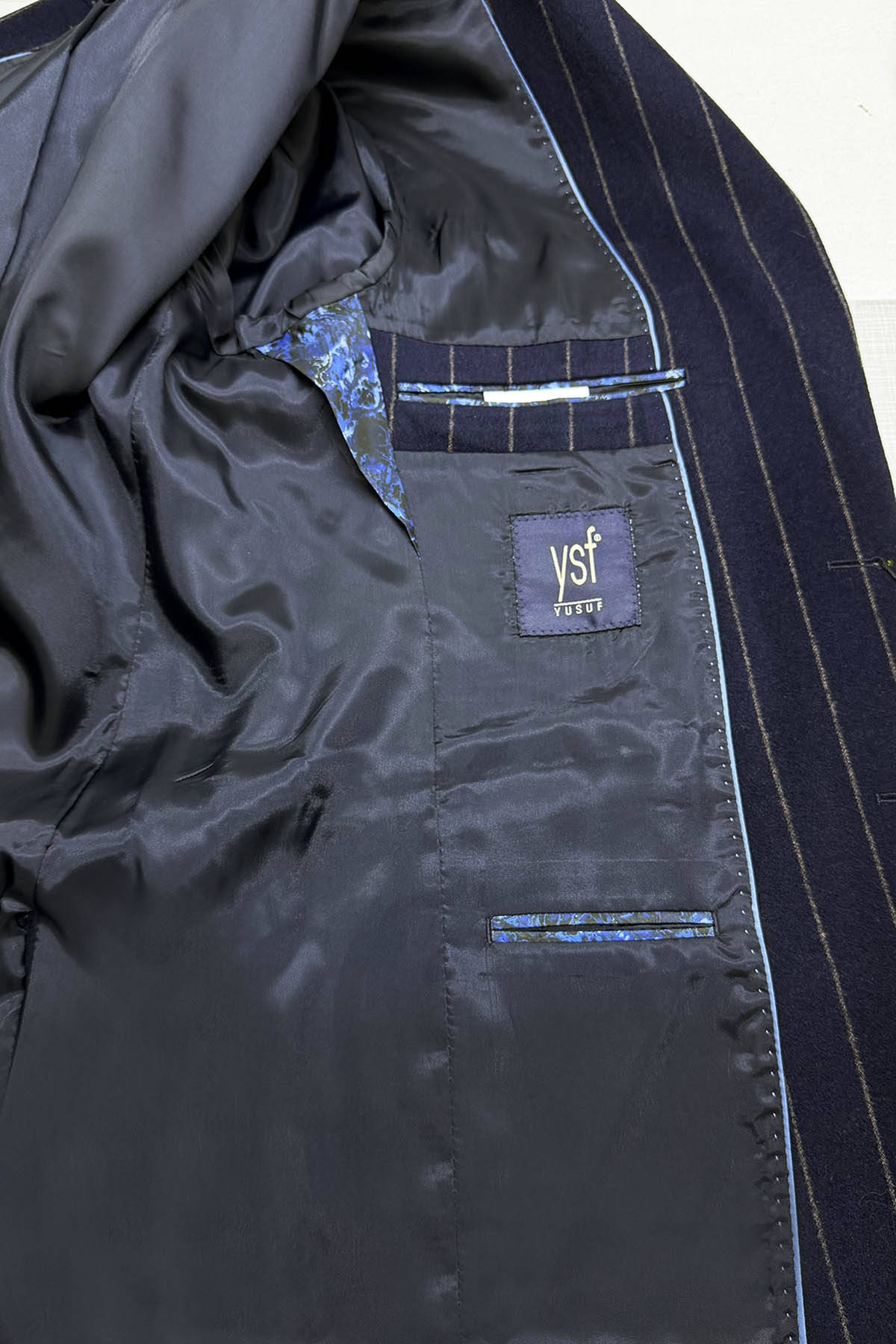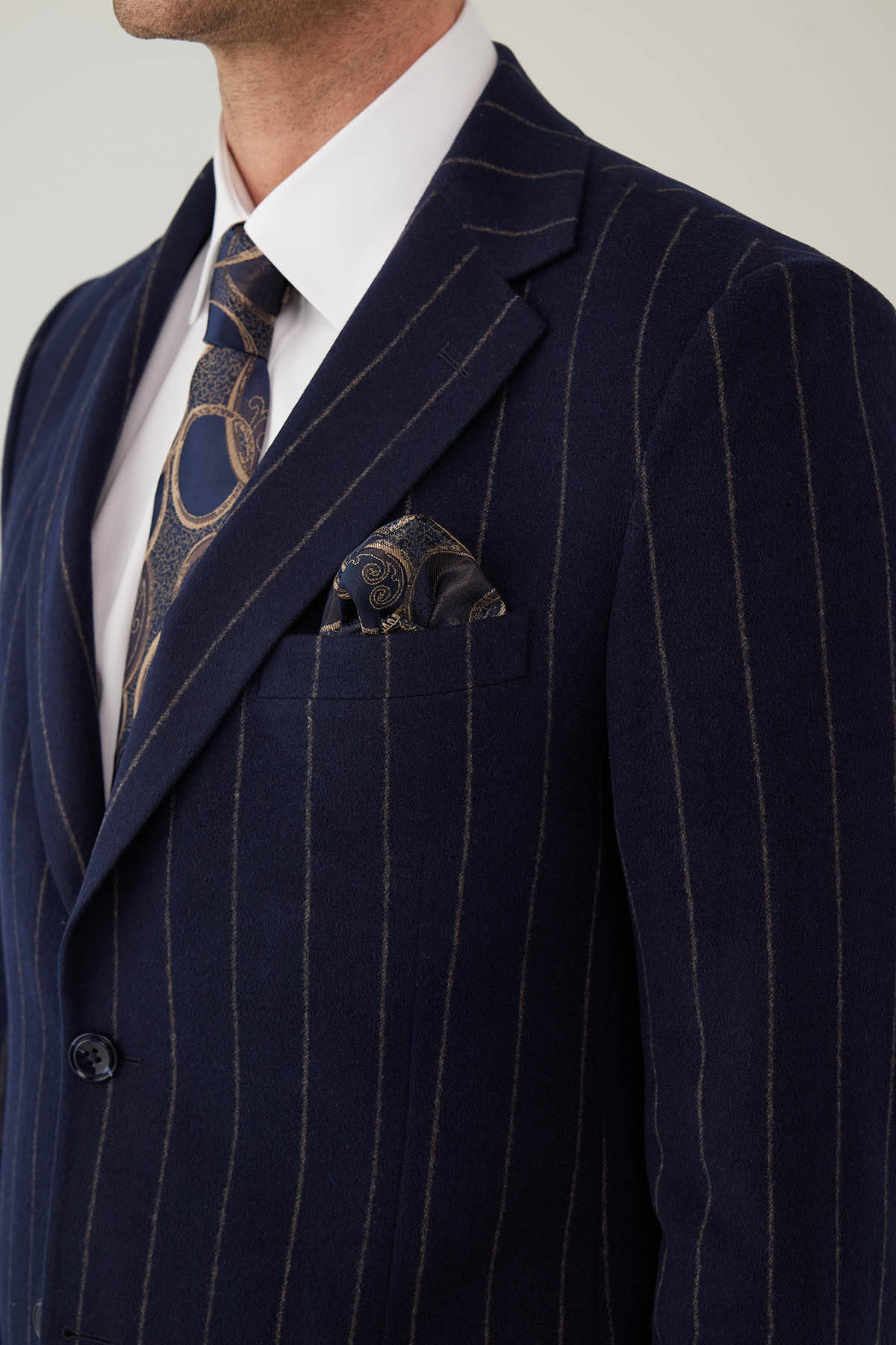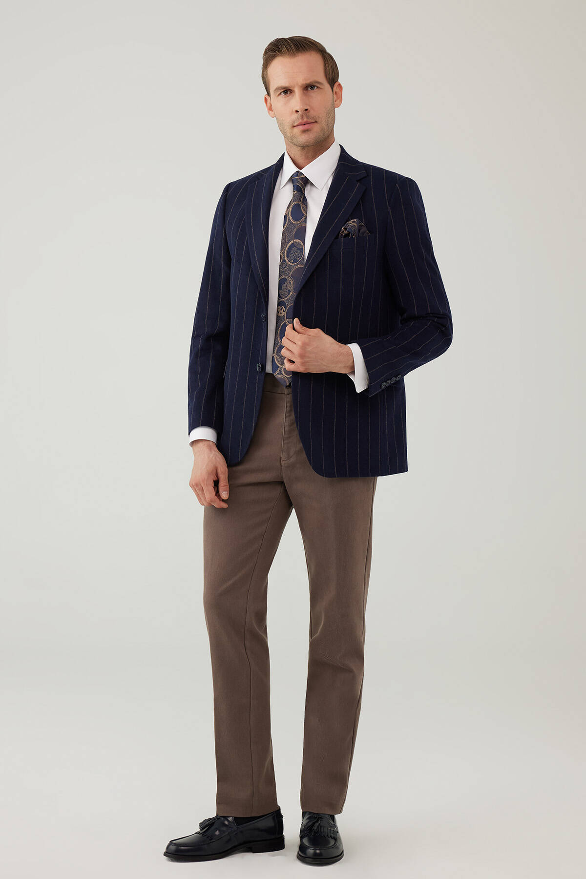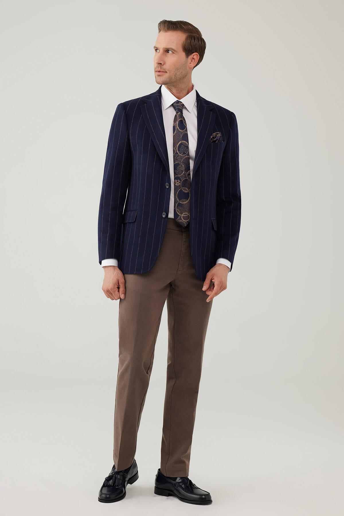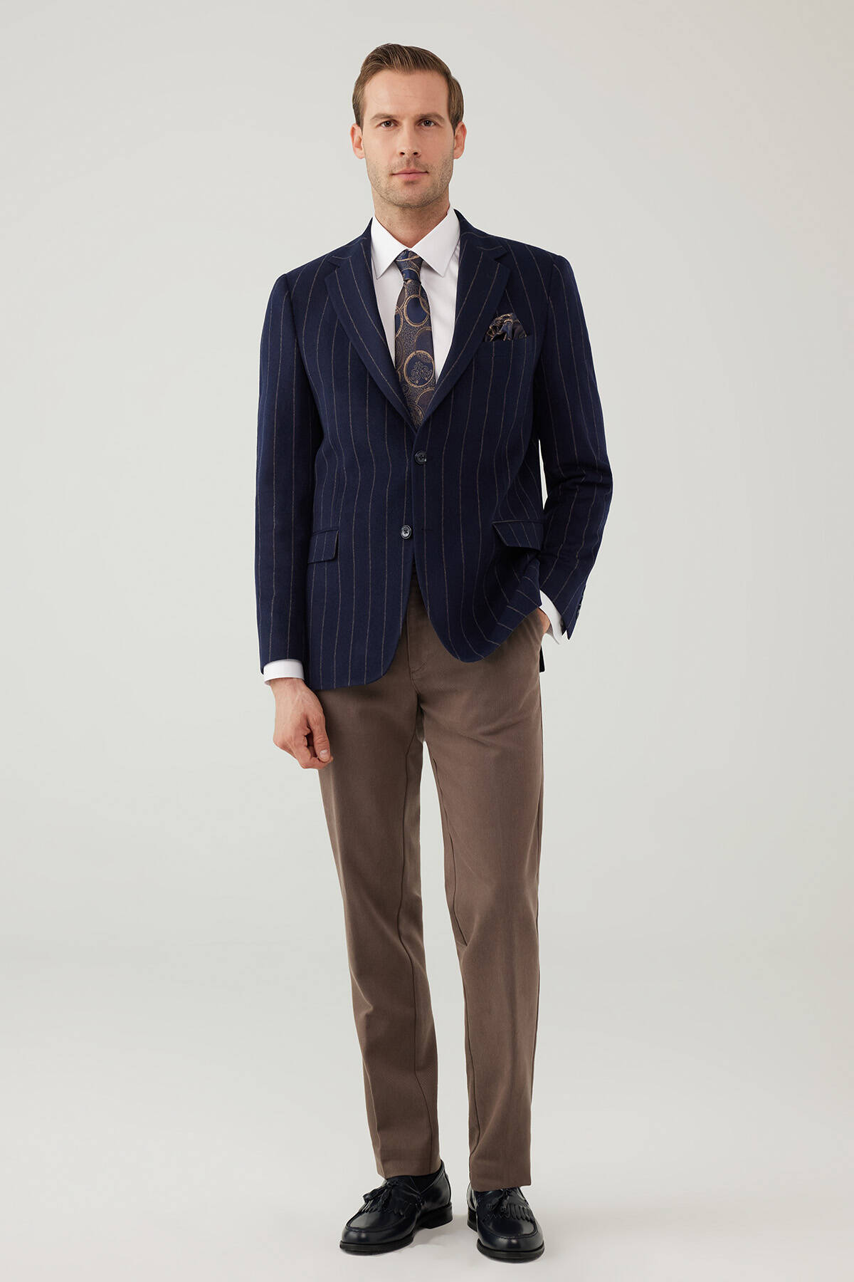 Erkek Lacivert Regular Fit Mono Yaka Çizgili Yün Ceket