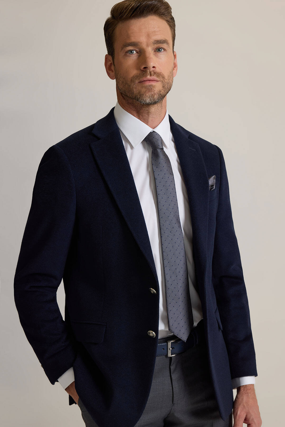 Erkek Lacivert Regular Fit Mono Yaka Puntolu Yün-Kaşmir Karışımlı Blazer Ceket